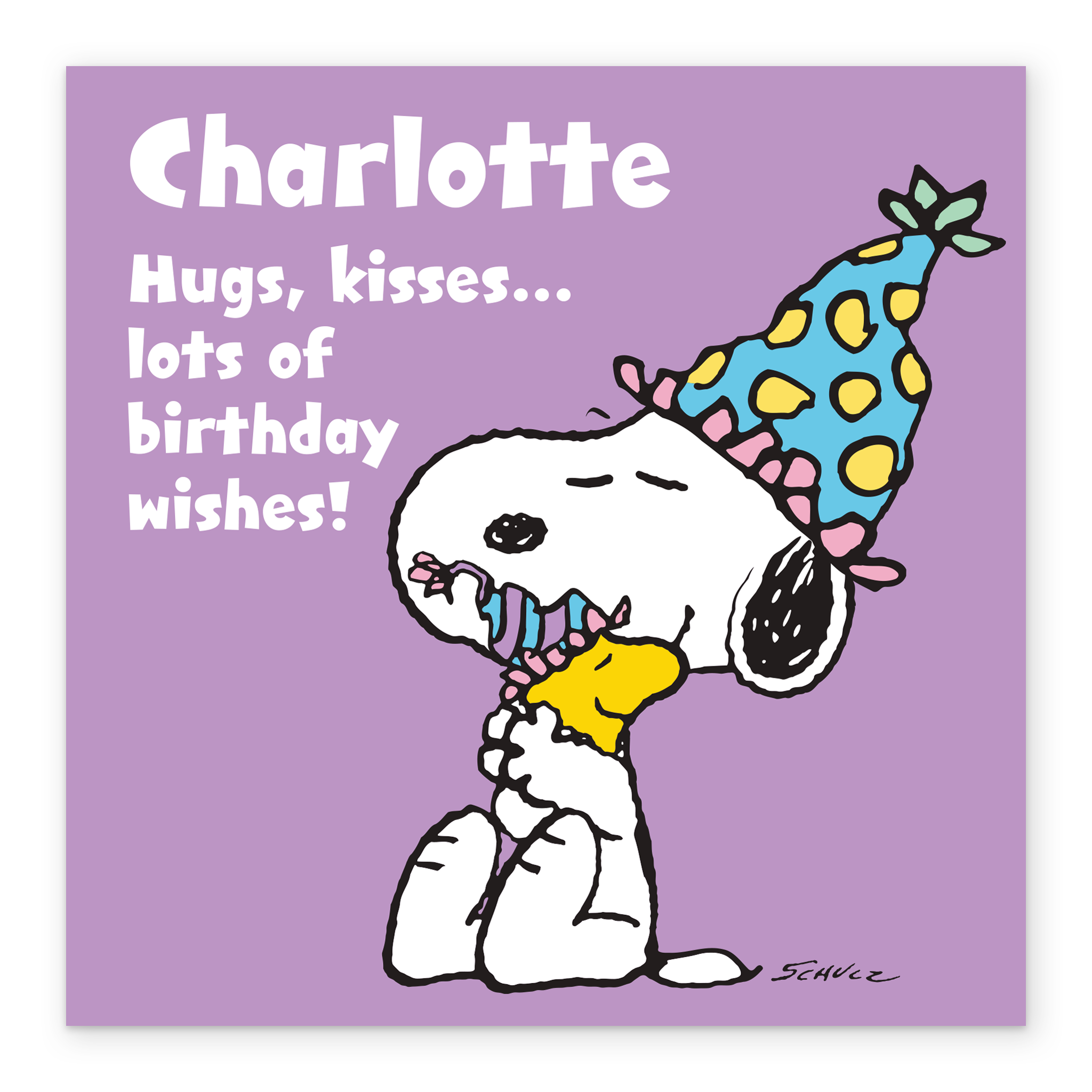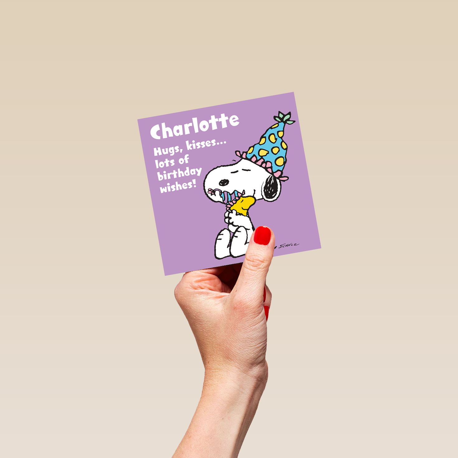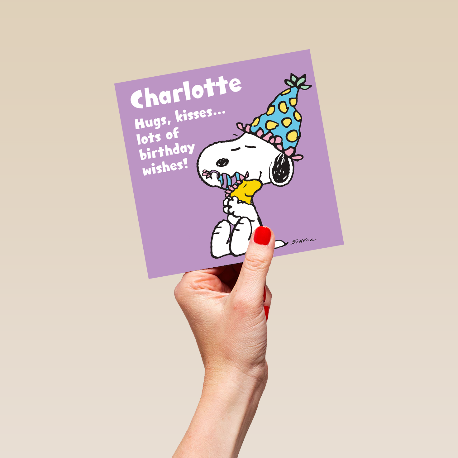 Send hugs, kisses and lots of birthday wishes, with this adorable personalised PEANUTS™ SNOOPY birthday card, a sweet way to celebrate with the ones you love.