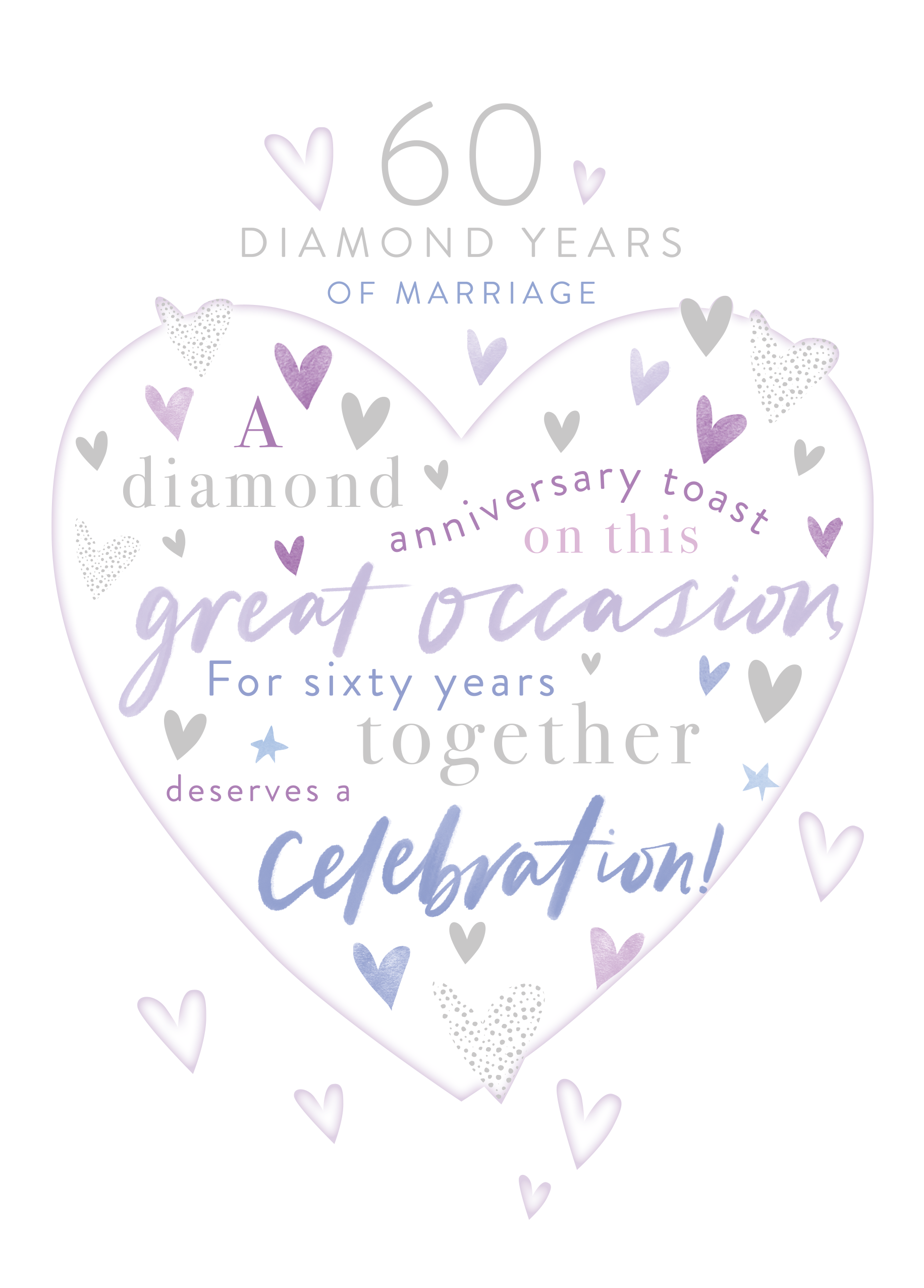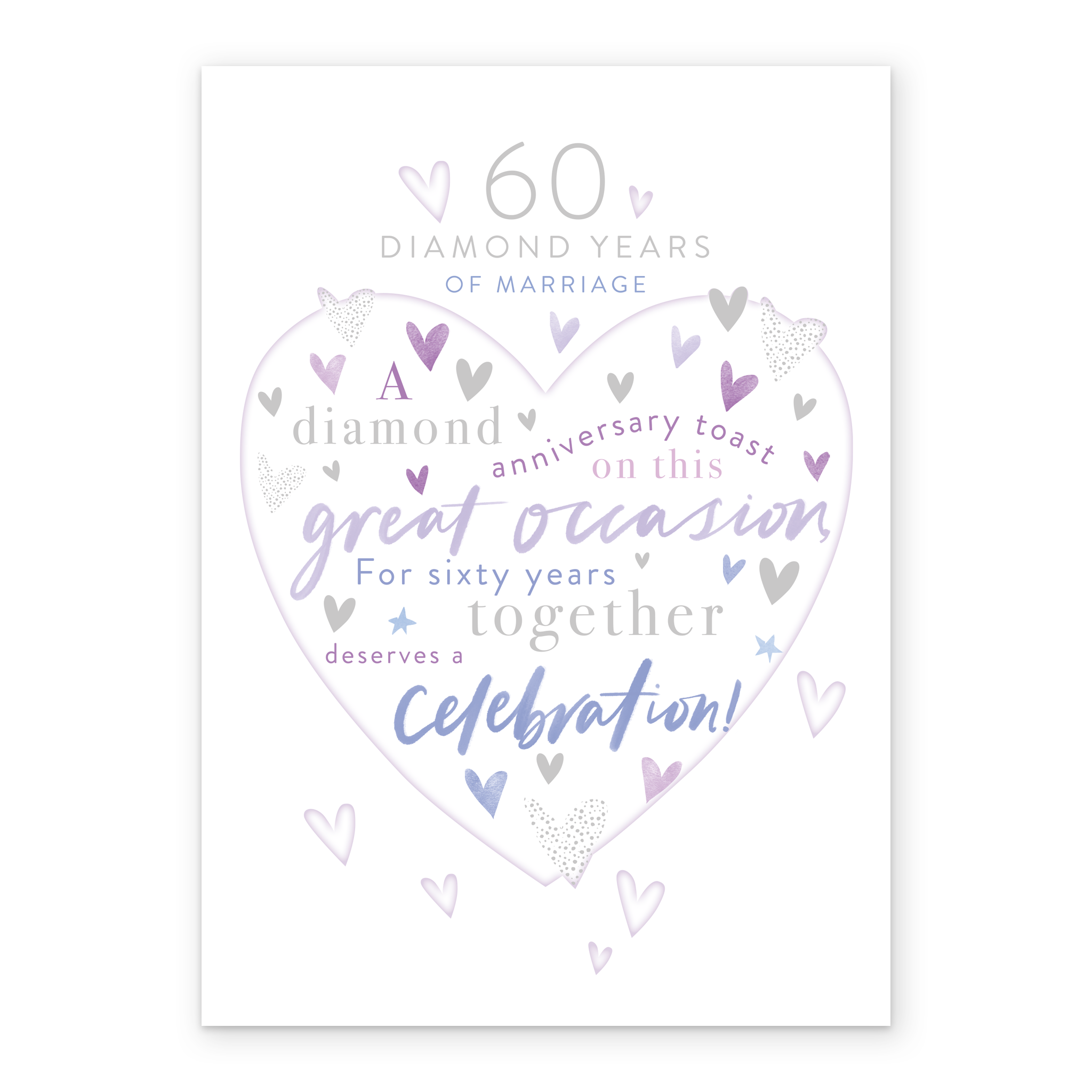 Printed on premium-quality board, this card features a white background with a large silver heart-shape, surrounded by smaller heart shapes, with silver and blue lettering above and filled with silver, purple and blue lettering, with the message '60 Diamond Years of Marriage. A diamond anniversary toast on this GREAT OCCASION, For sixty years together deserves a CELEBRATION!', and comes complete with a co-ordinating white envelope.
