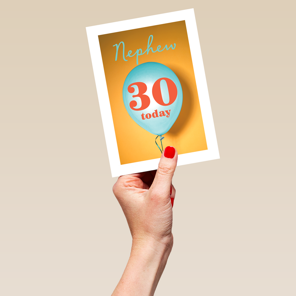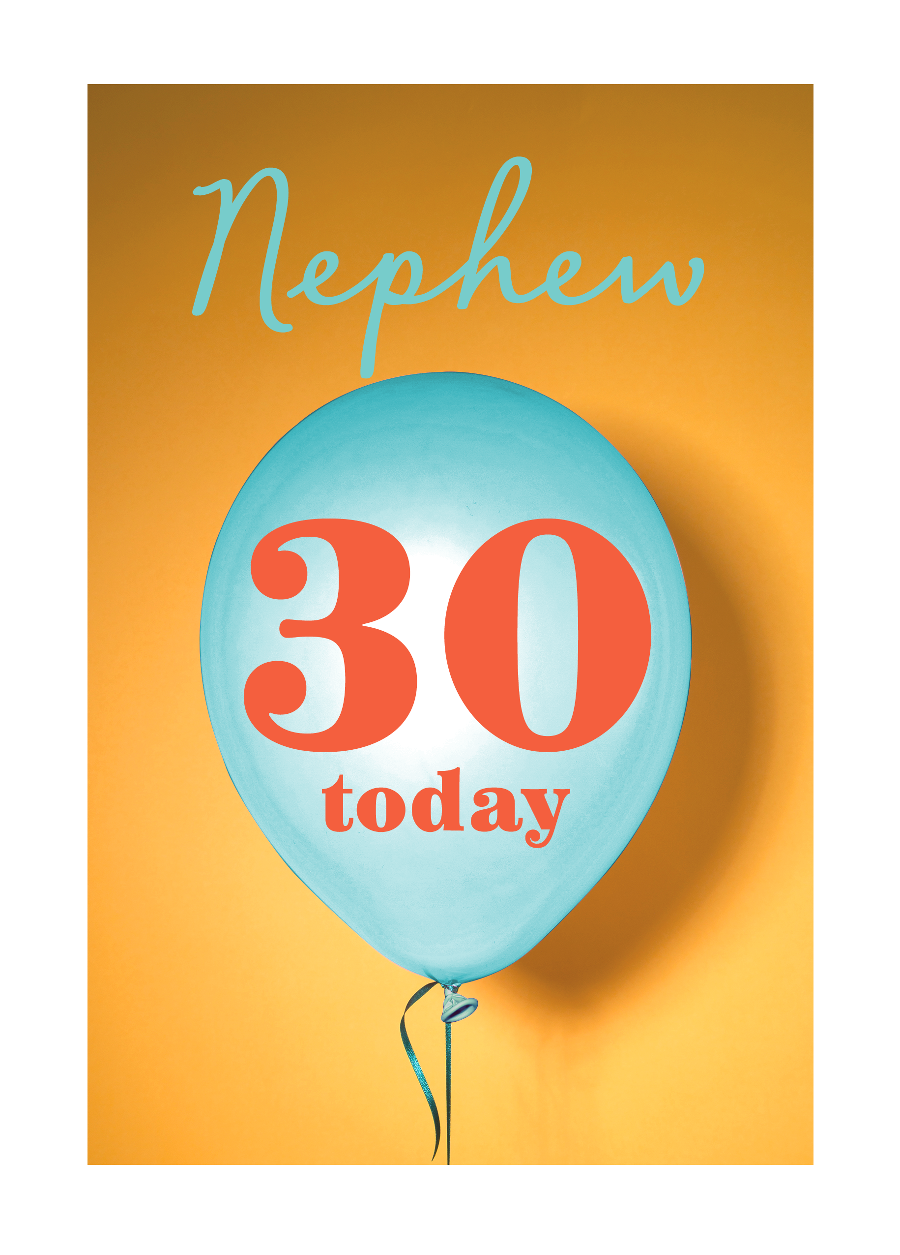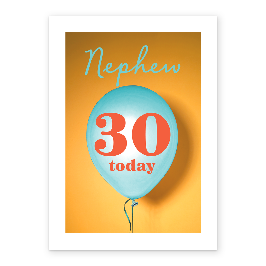 Printed on premium-quality board, this card features a floating 30th birthday balloon on a colourful background, with the message 'Nephew, 30 Today', space to personalise a name, and comes complete with a co-ordinating white envelope.
