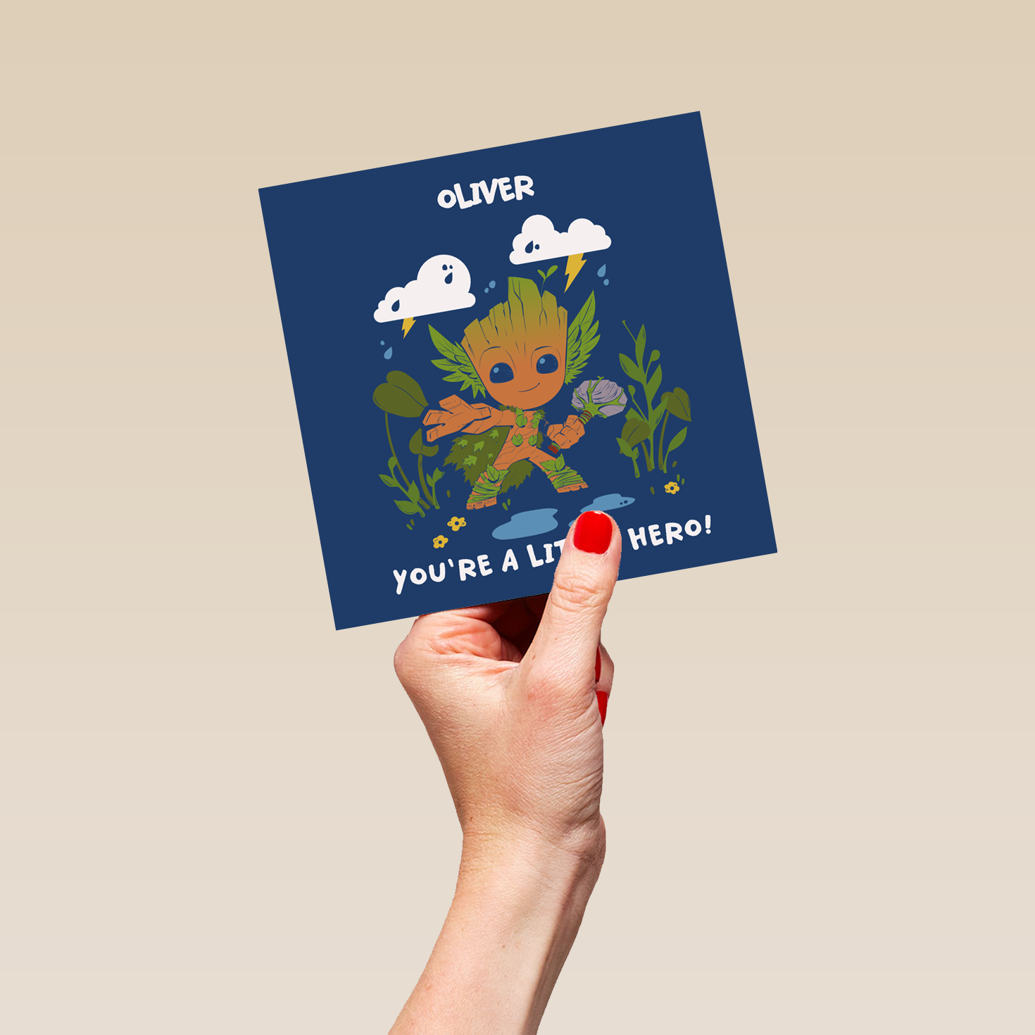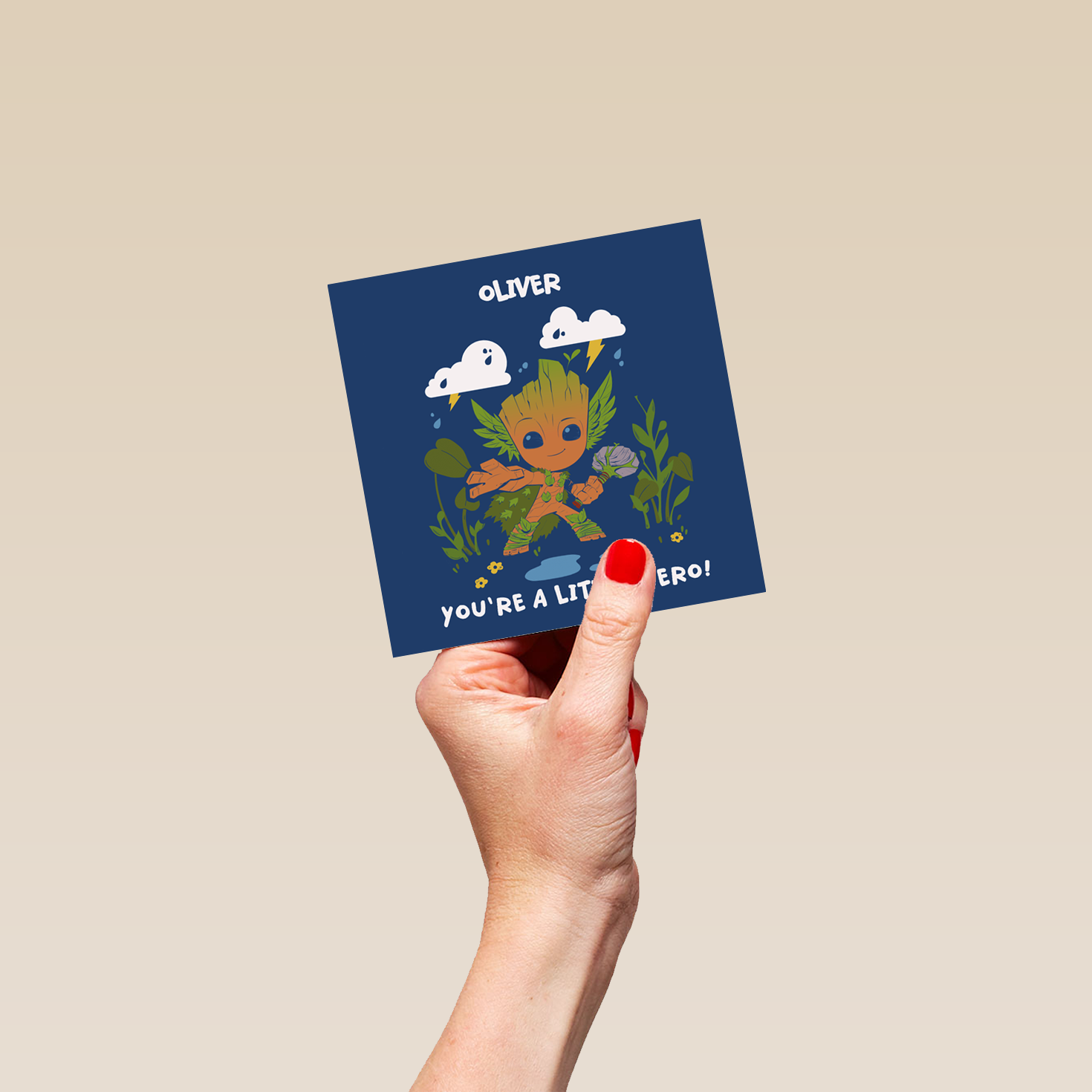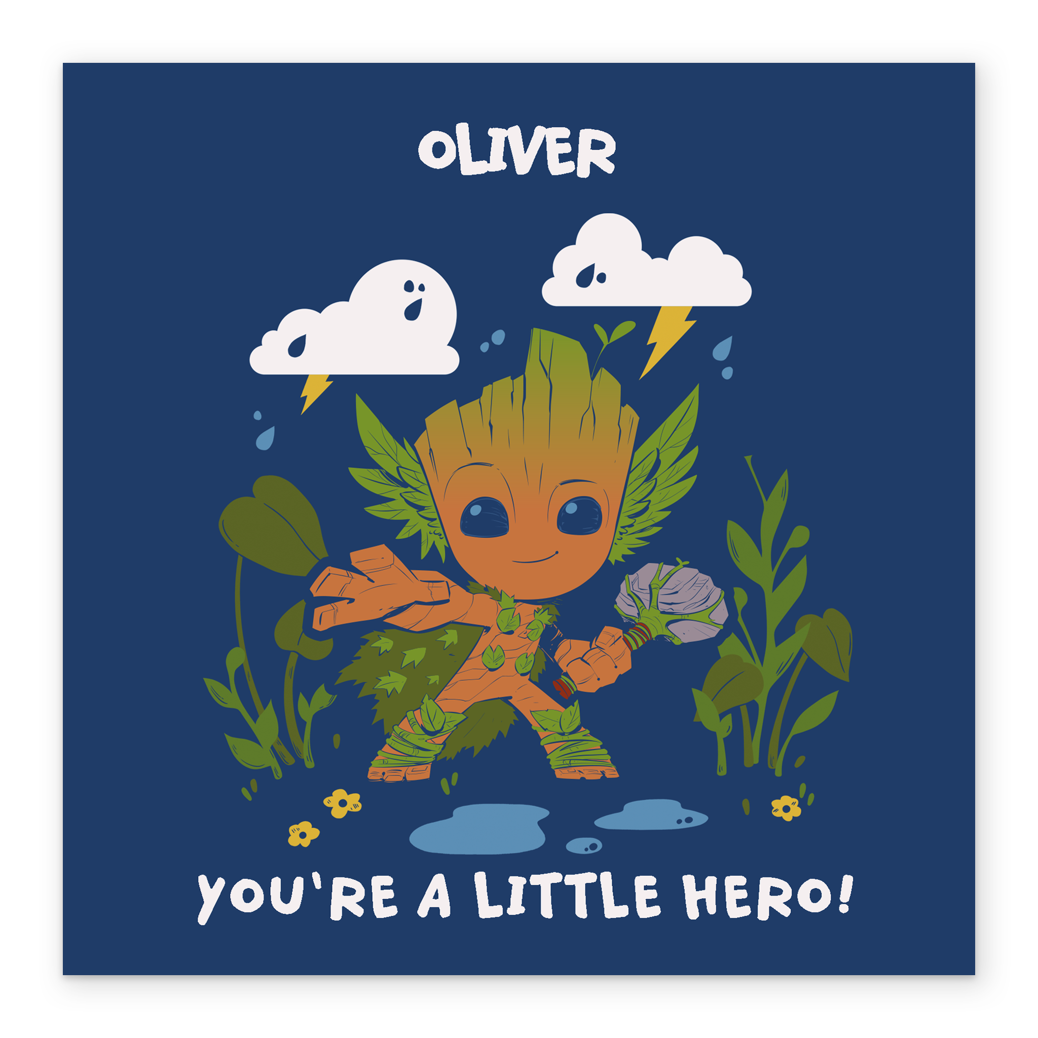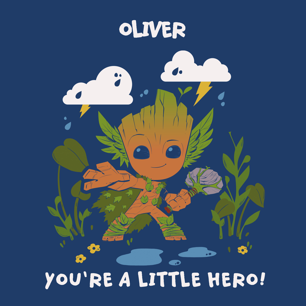 Printed on premium-quality board, this card features Baby Groot, from Marvel's Guardians of the Galaxy, with a hammer made out of a rock and stick and a cape made out of leaves, striking a heroic pose, with the message 'You're a little hero!', space to personalise a name, and comes complete with a co-ordinating white envelope.