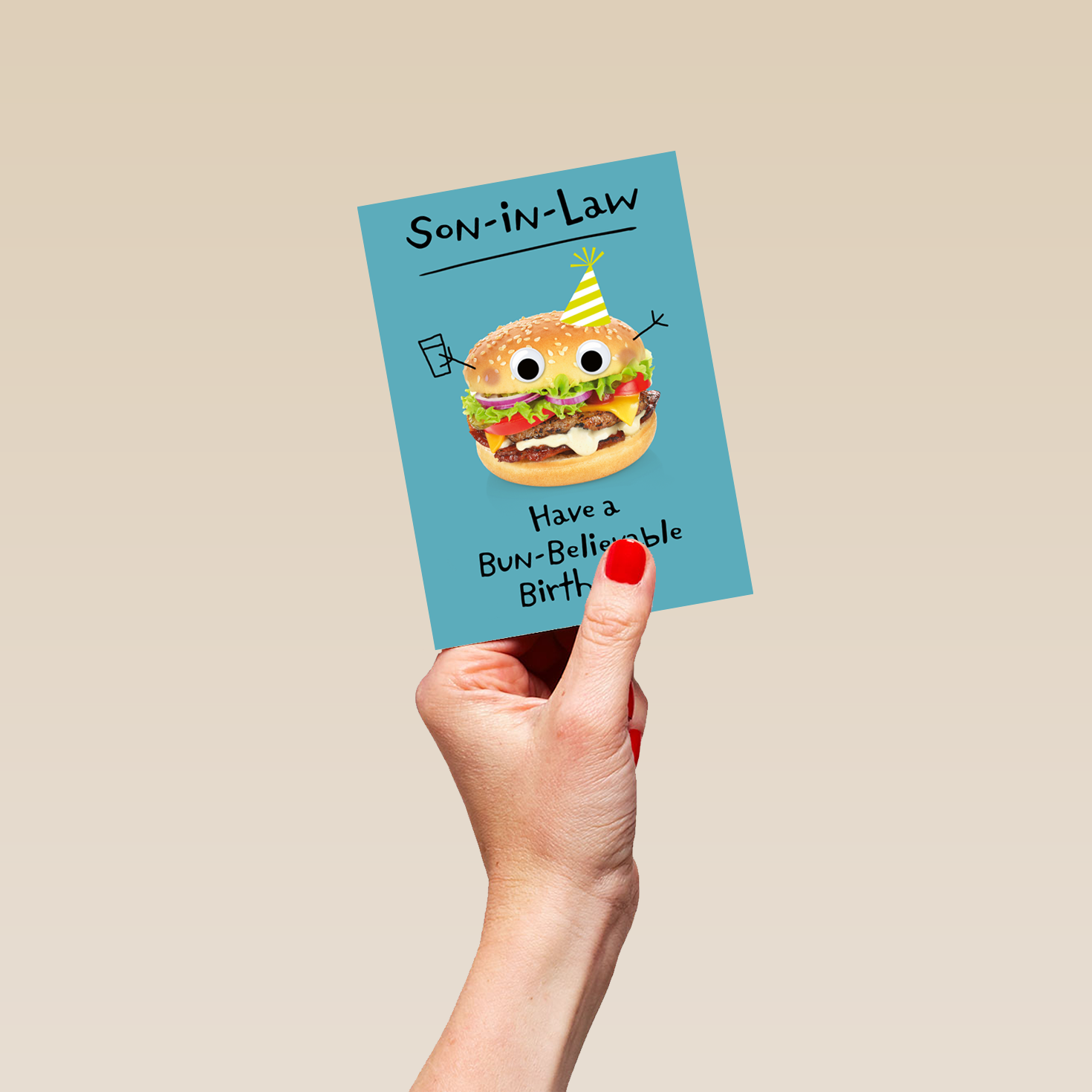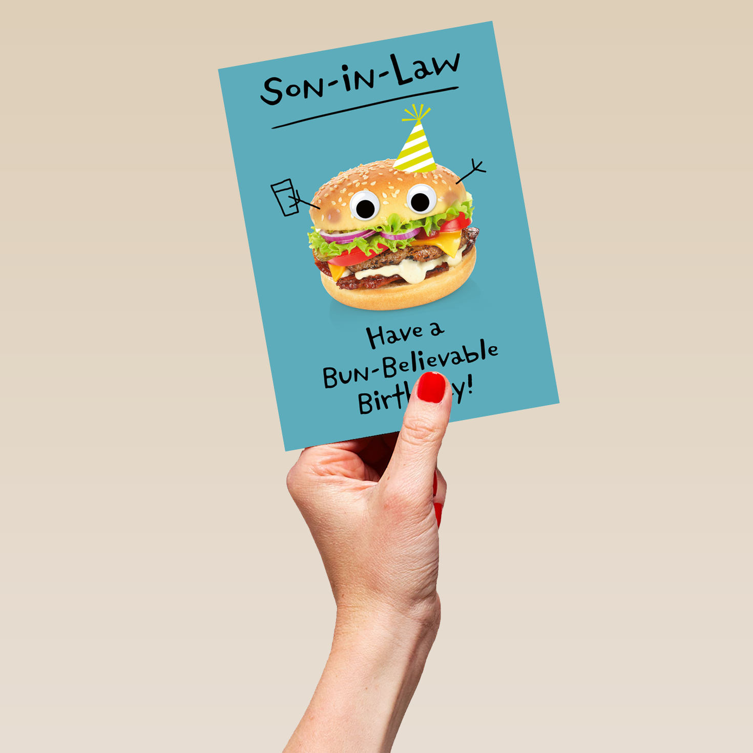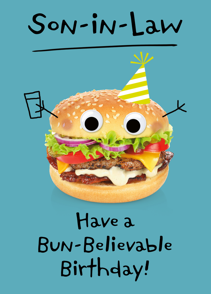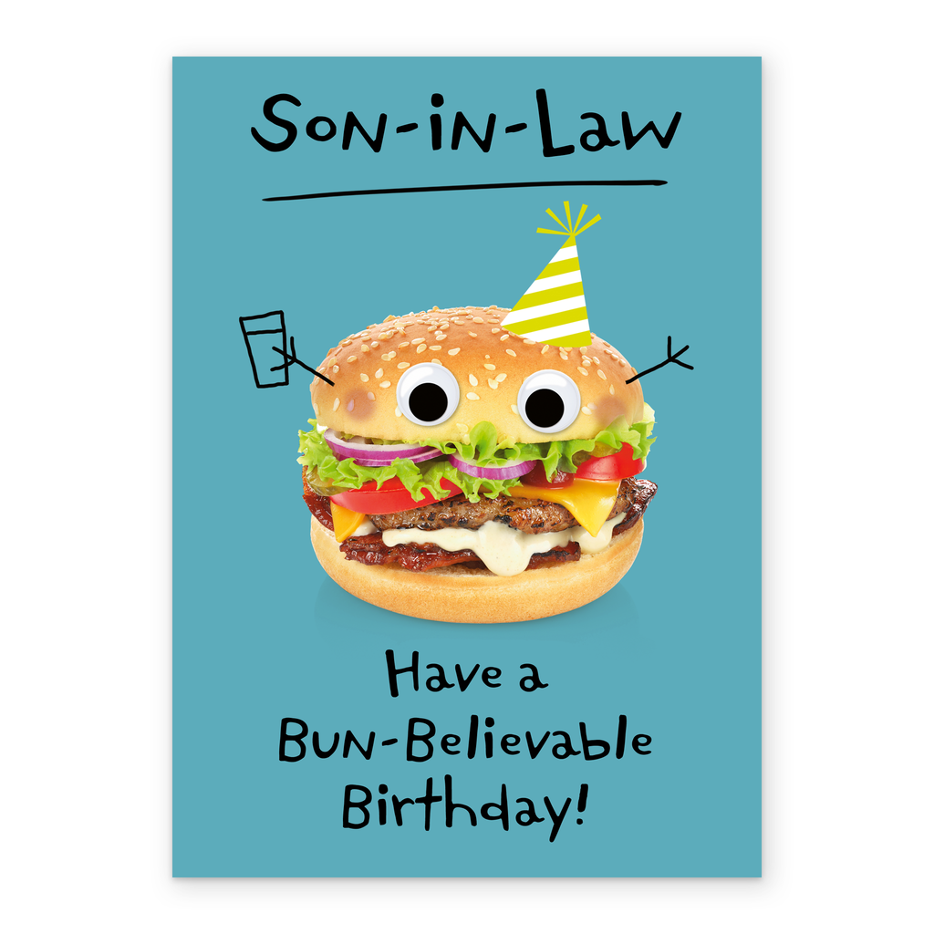Printed on premium-quality board, this card features a funny burger with cartoon features, with the message 'Son-in-Law, Have a Bun-Believable Birthday!', space to personalise your message, and comes complete with a co-ordinating white envelope.