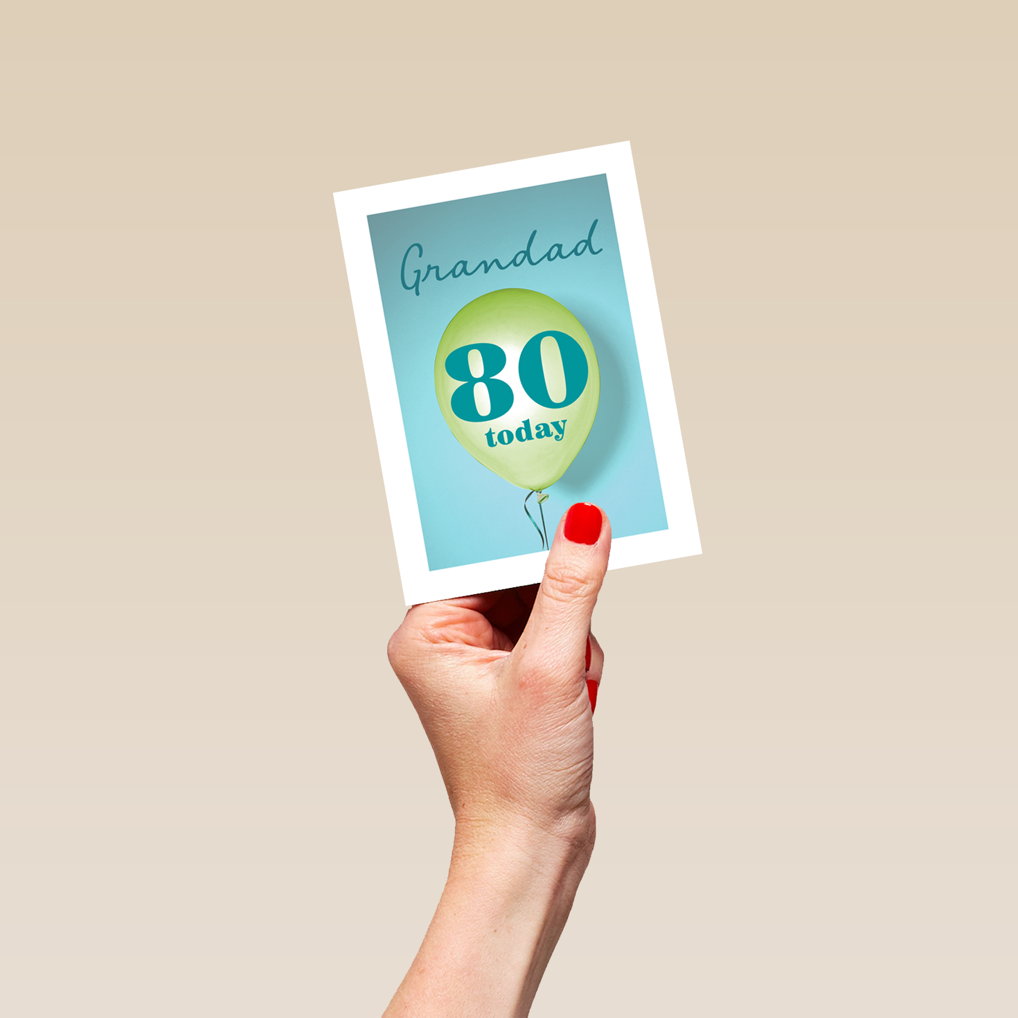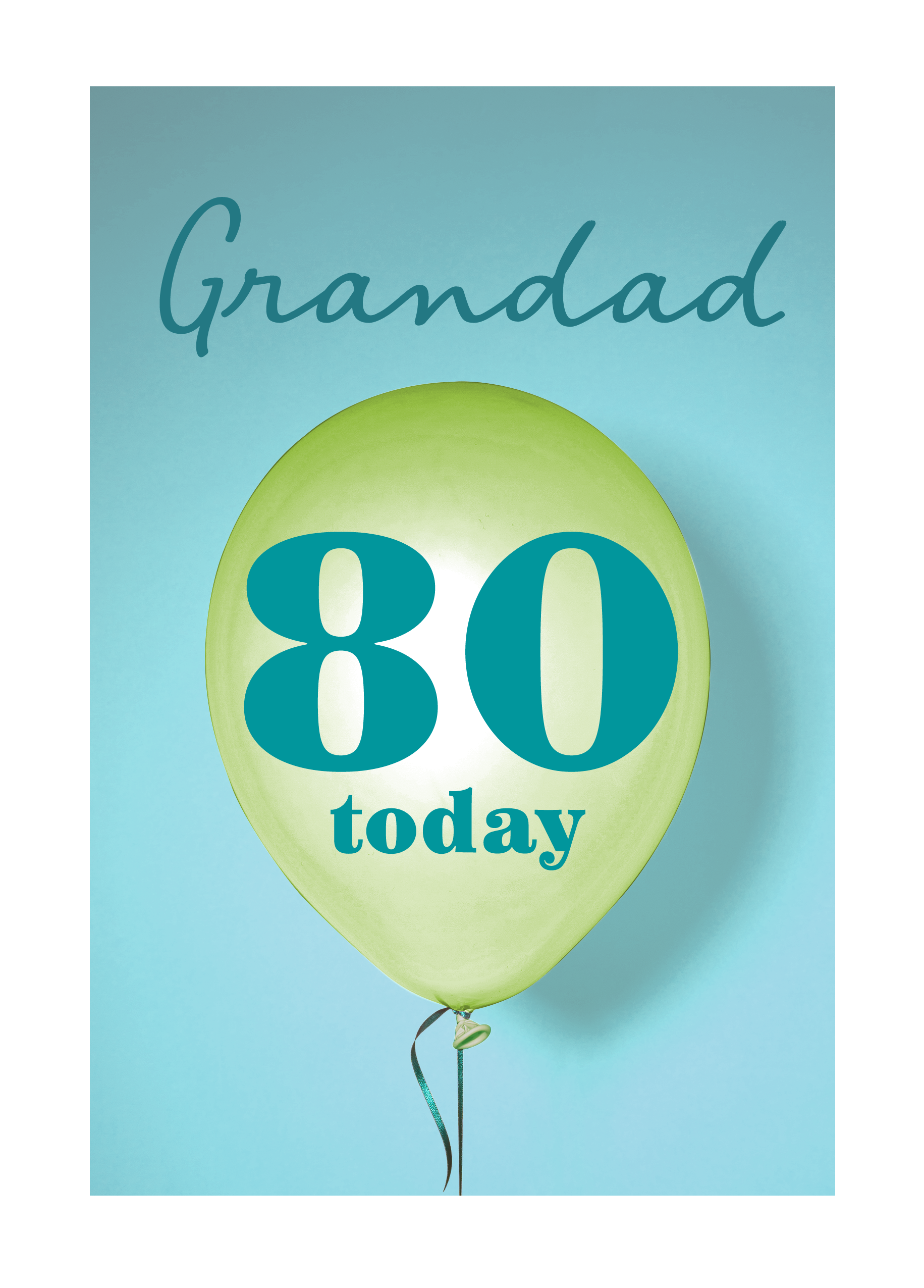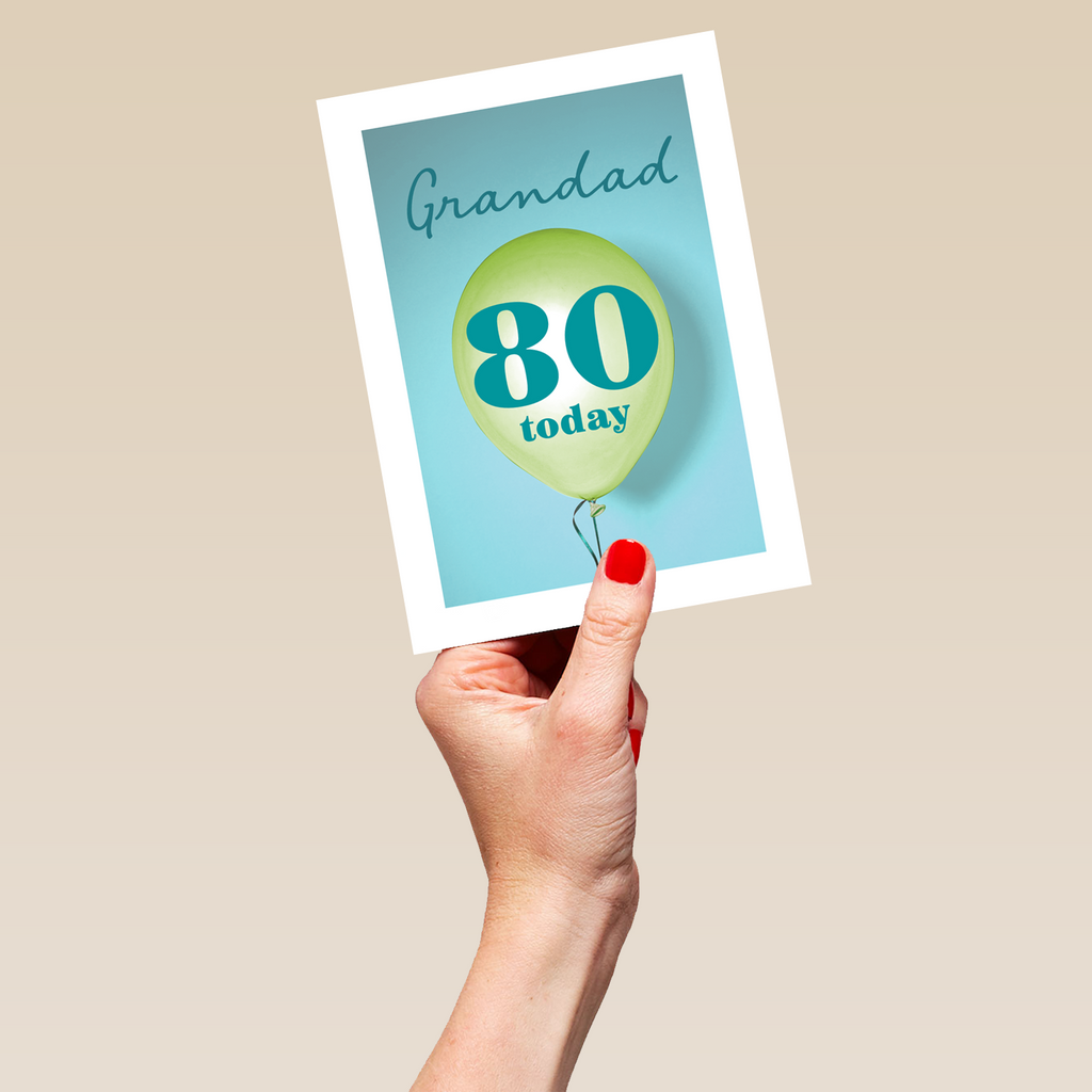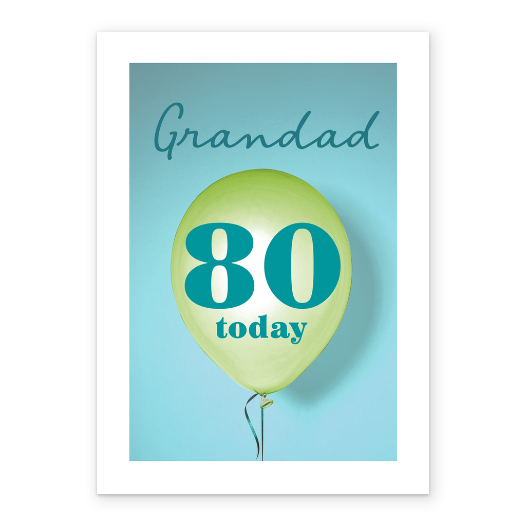 Printed on premium-quality board, this card features a floating 80th birthday balloon on a colourful background, with the message 'Grandad, 80 Today', space to personalise a name, and comes complete with a co-ordinating white envelope.