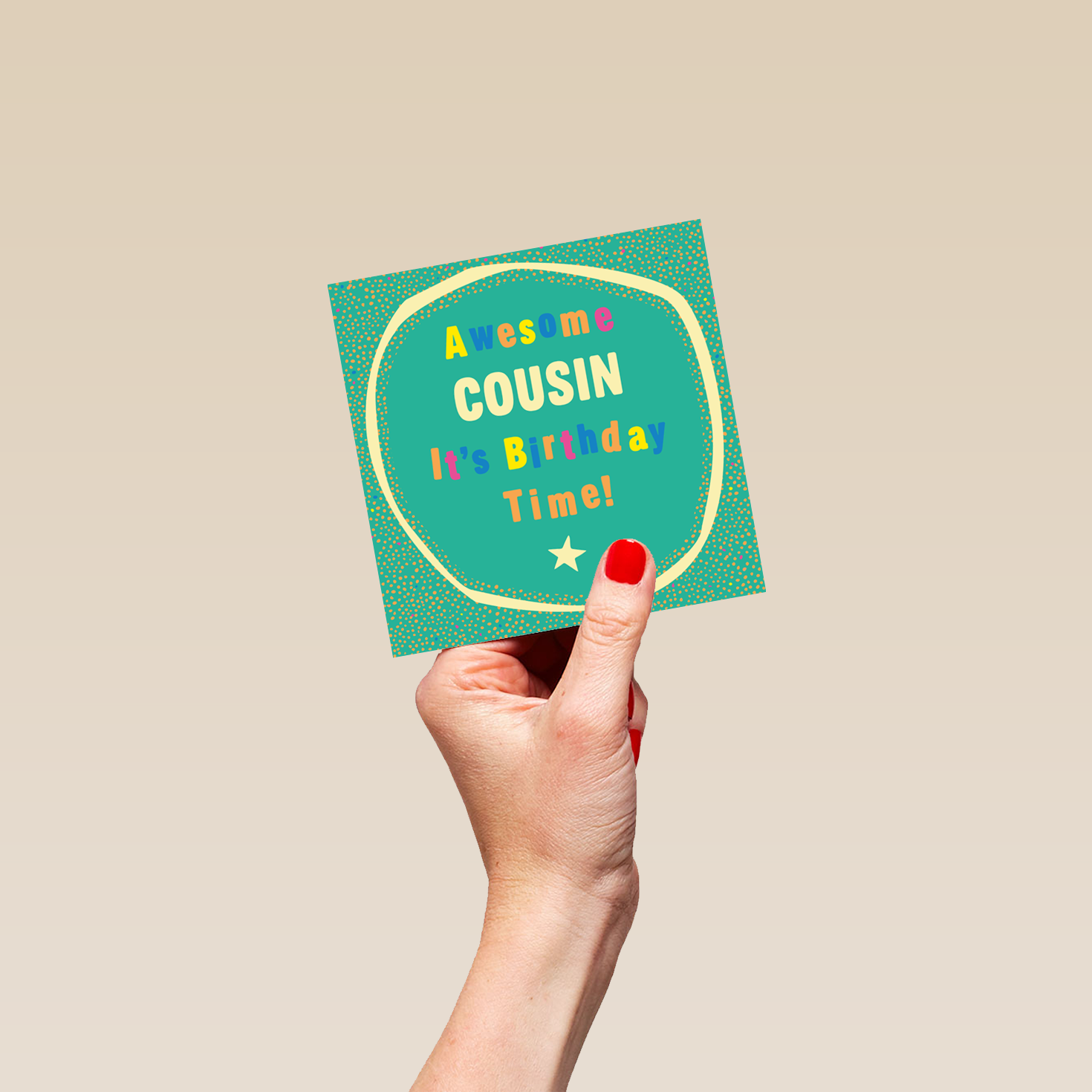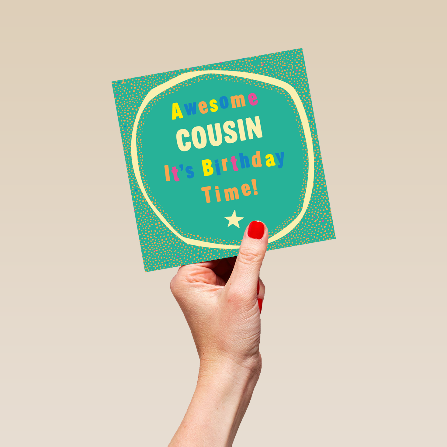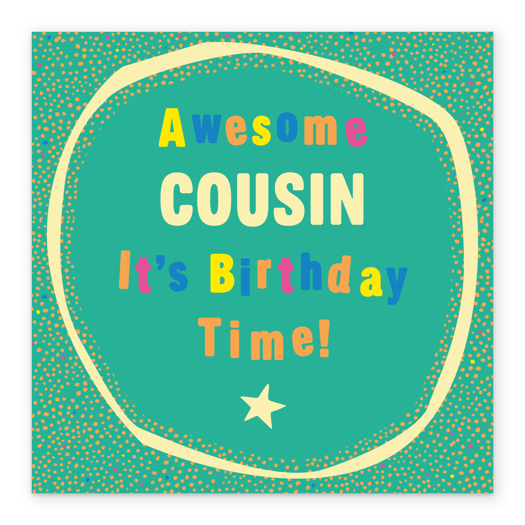 Printed on premium-quality board, this card features a bright green background with a birthday message, with the message 'Awesome Cousin, It's Birthday Time!', space to personalise your message, and comes complete with a co-ordinating white envelope.
