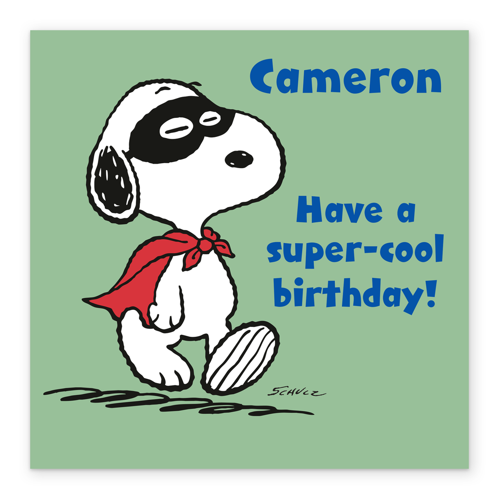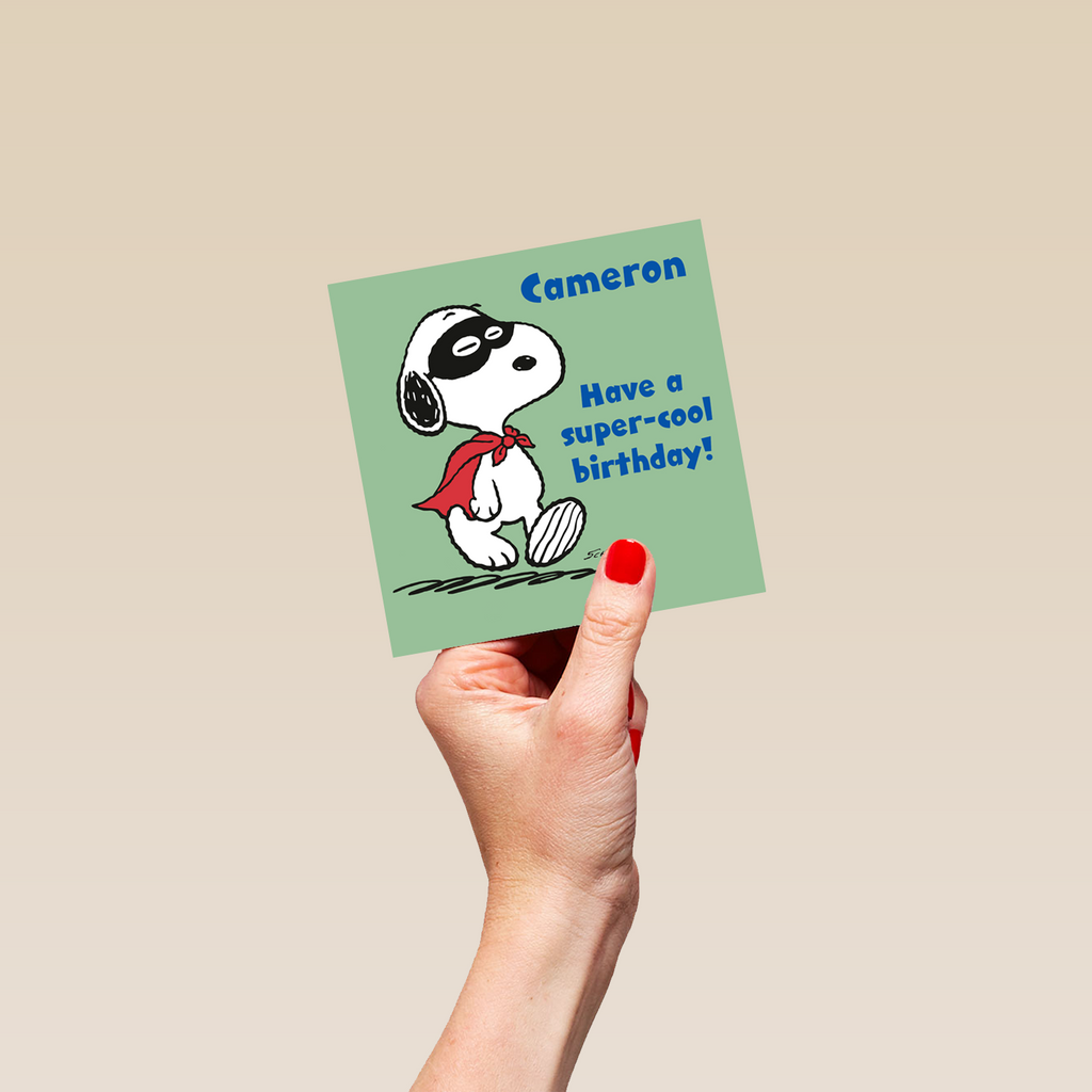 Printed on premium-quality board, this card features PEANUTS™ SNOOPY the dog in a superhero costume, with the message 'Have a super-cool birthday!', space to personalise a name, and comes complete with a co-ordinating white envelope.