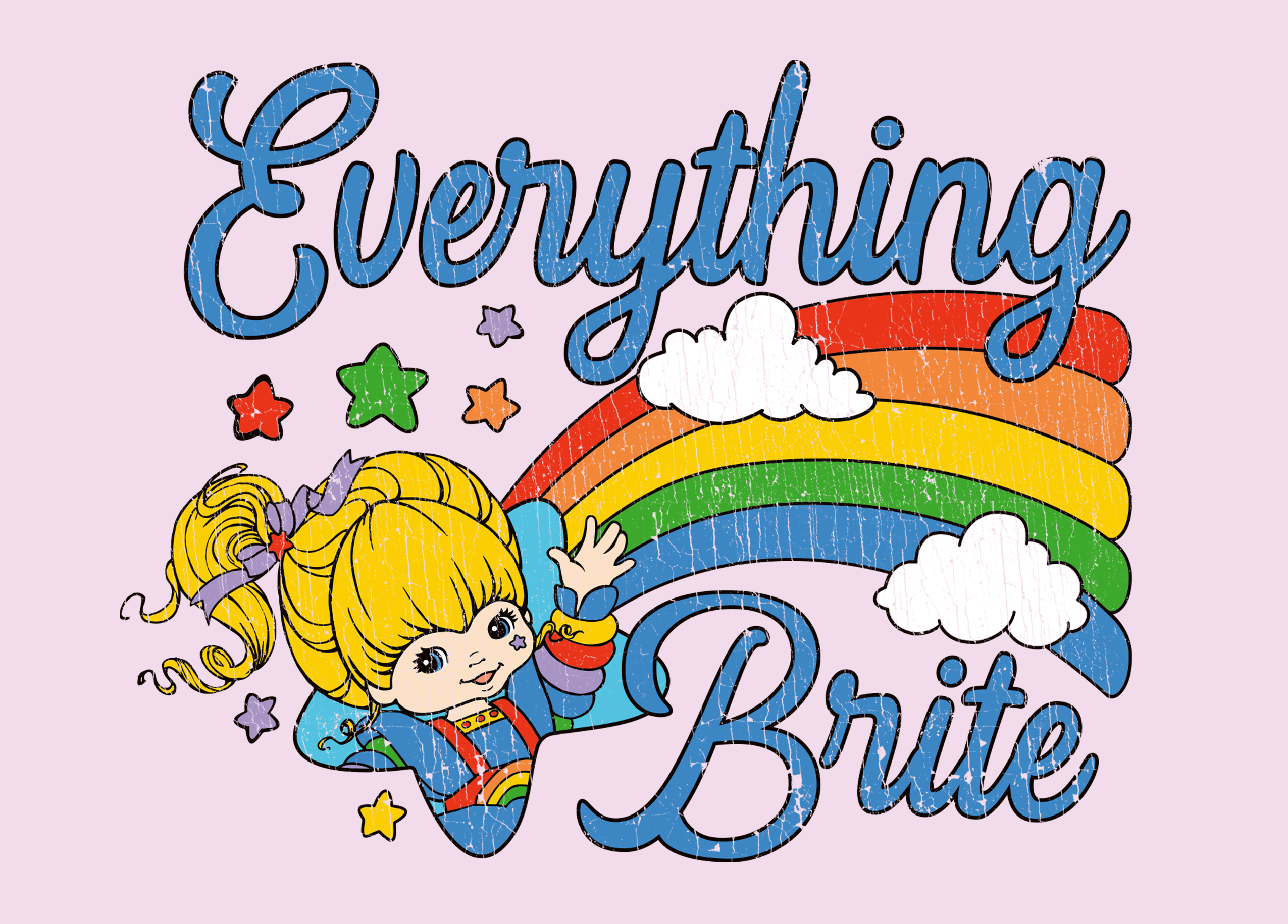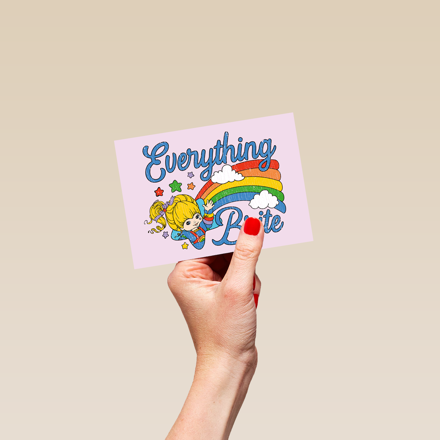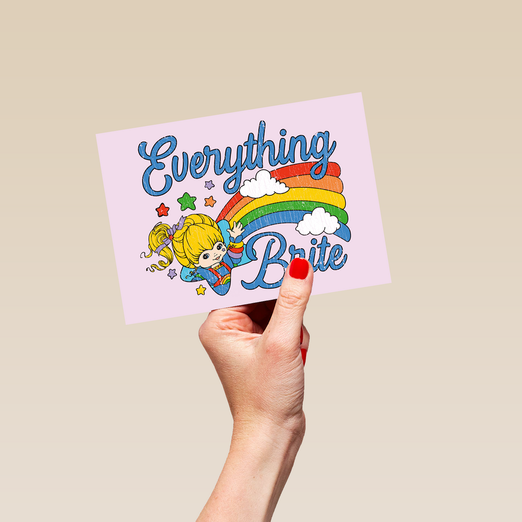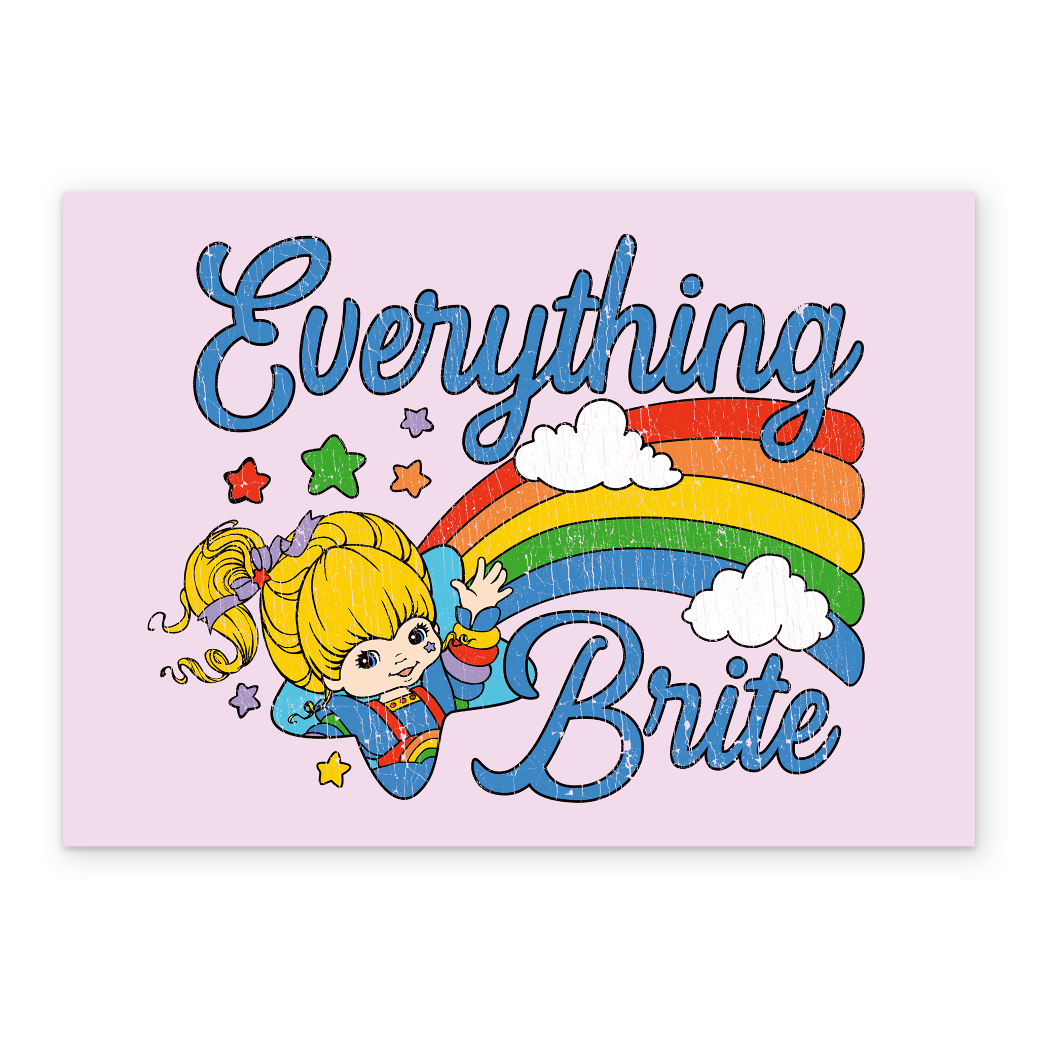 Printed on premium-quality board, this card features a colourful illustrated Rainbow Brite, alongside fluffy white clouds, multi-coloured stars and a vibrant rainbow, set against a pale purple background and framed by bright blue lettering above and below the image, with the message 'Everything Brite', and comes complete with a co-ordinating white envelope.