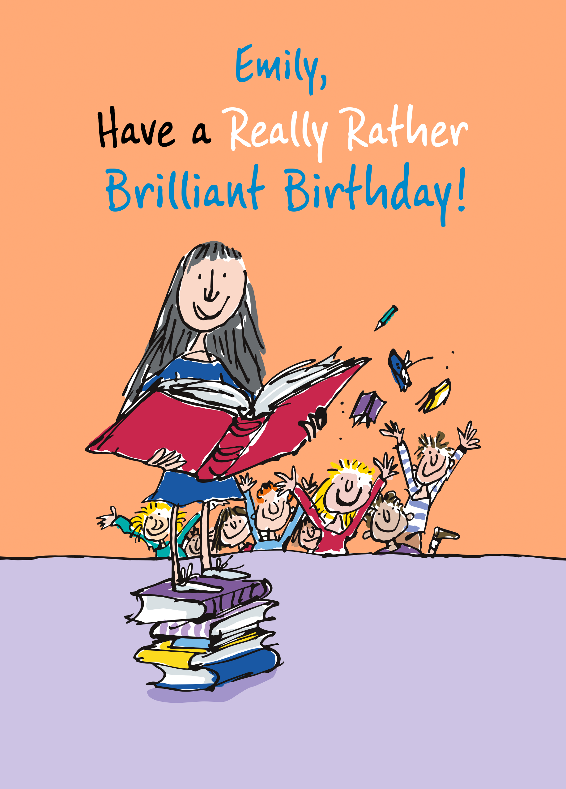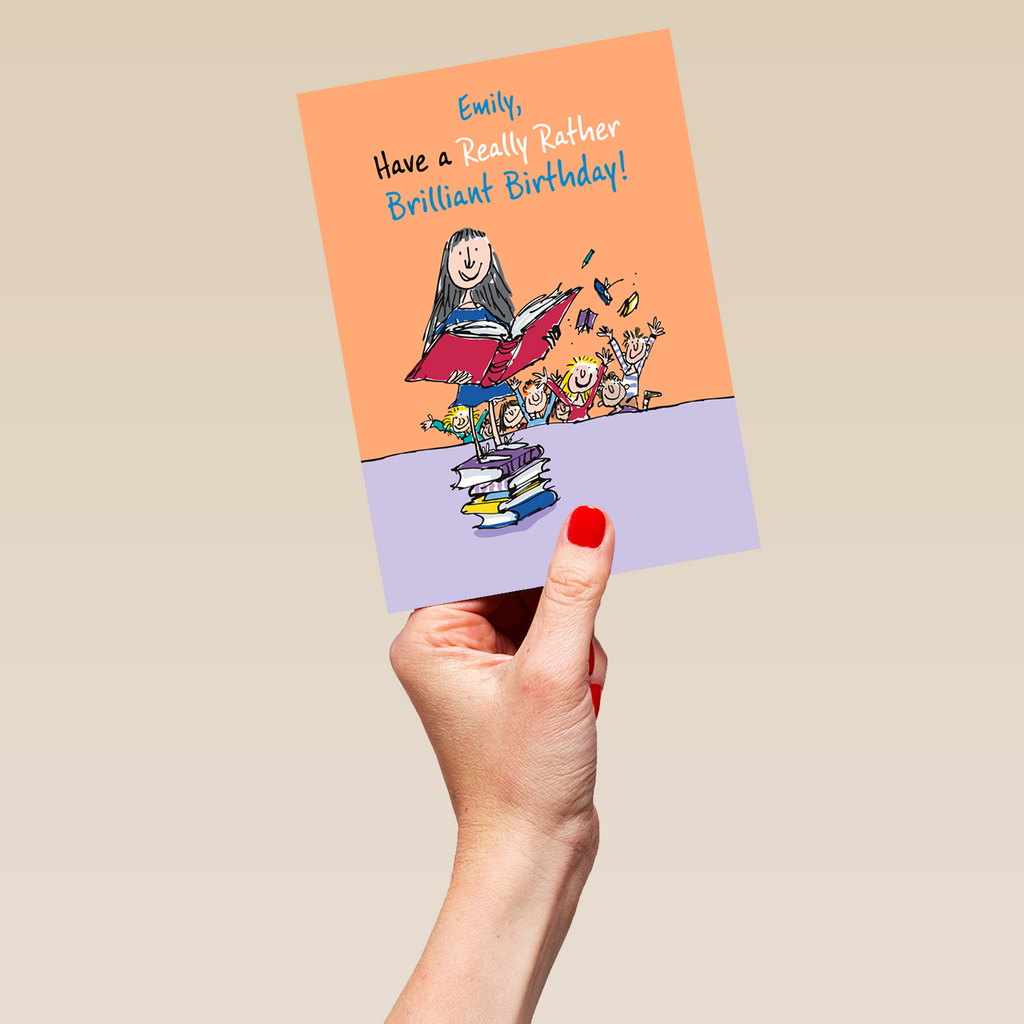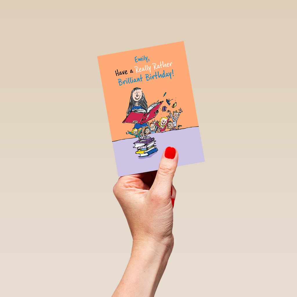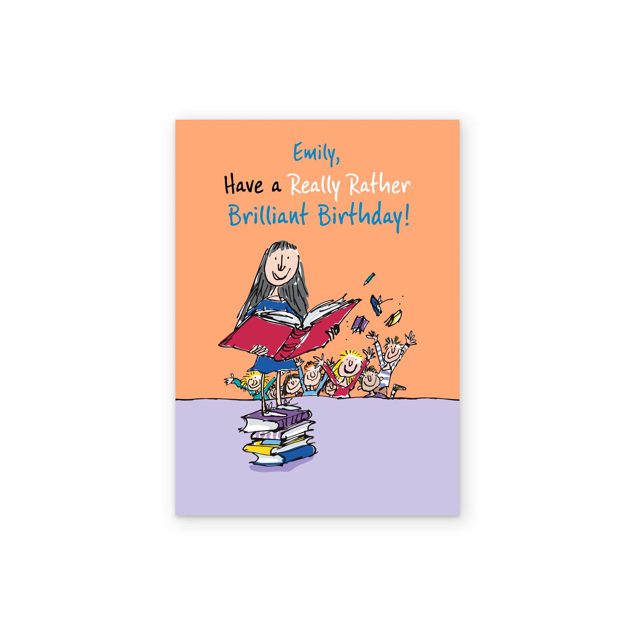 Printed on premium-quality board, this card features a classic illustration of Matilda perched on top of a pile of books against an orange background with white, blue and black lettering, with the message '[NAME], Have a Really Rather Brilliant Birthday!', space to personalise a name, and comes complete with a co-ordinating white envelope.