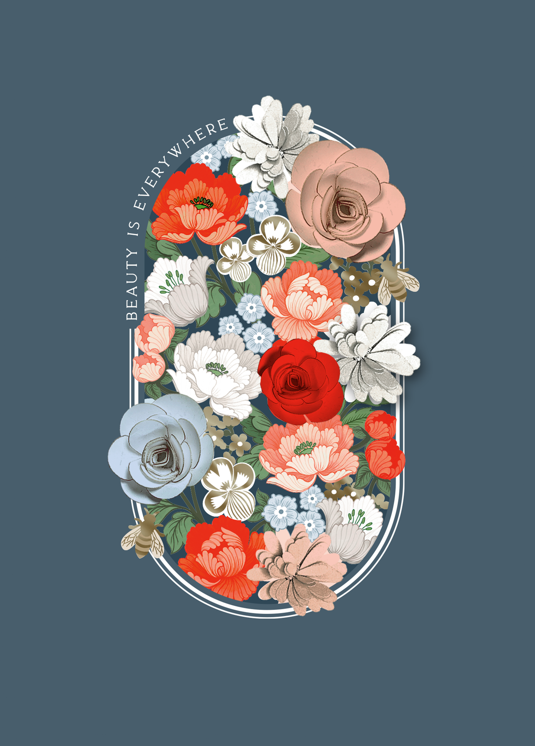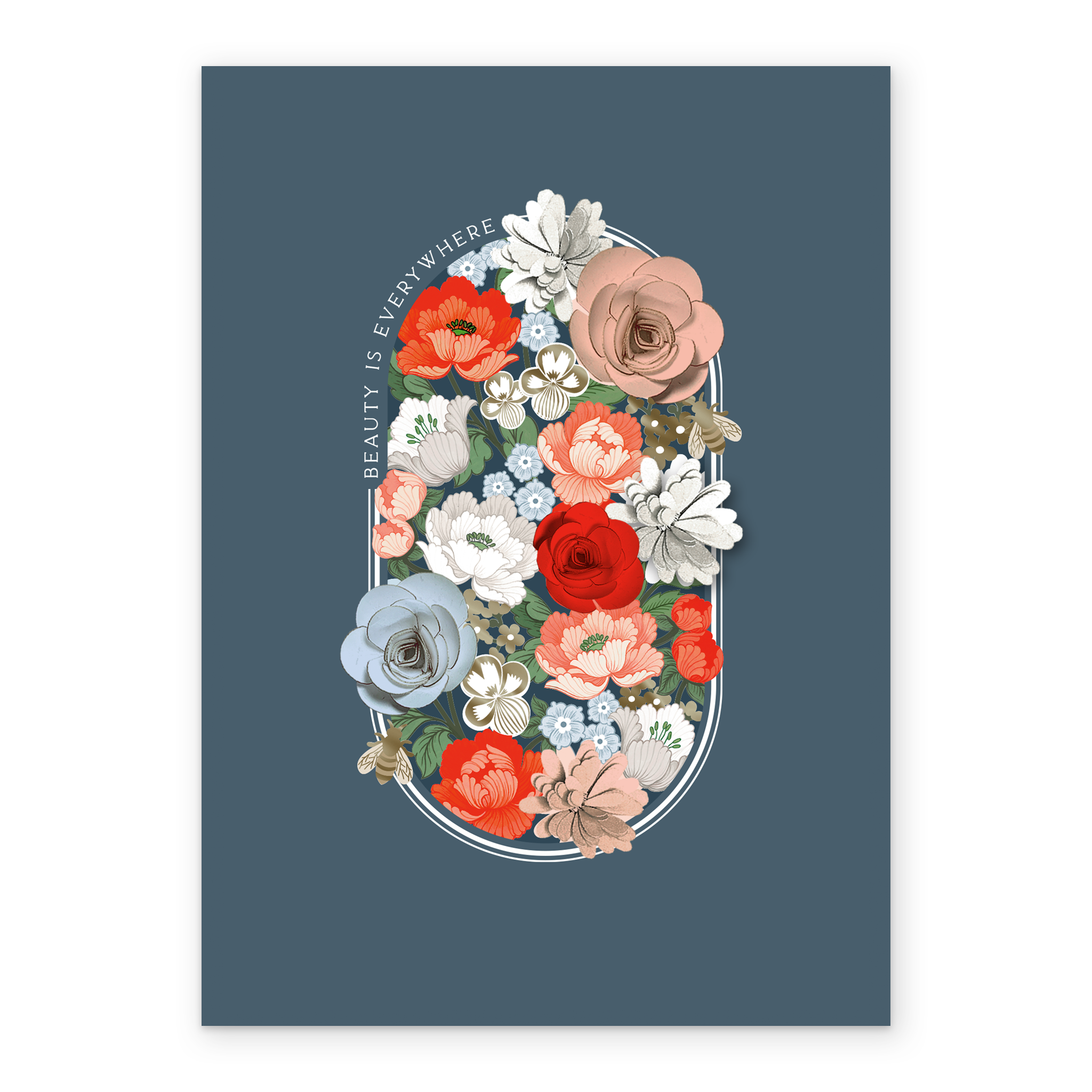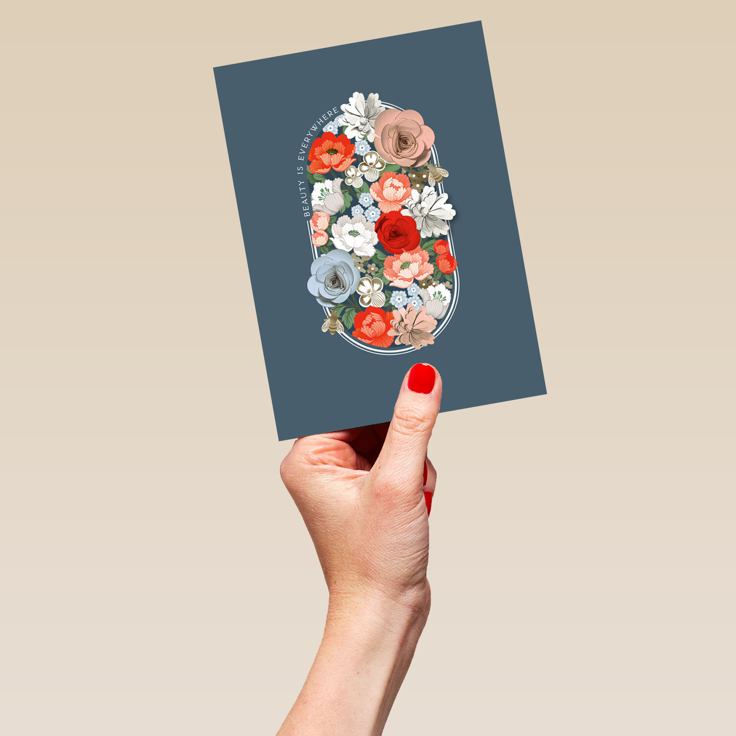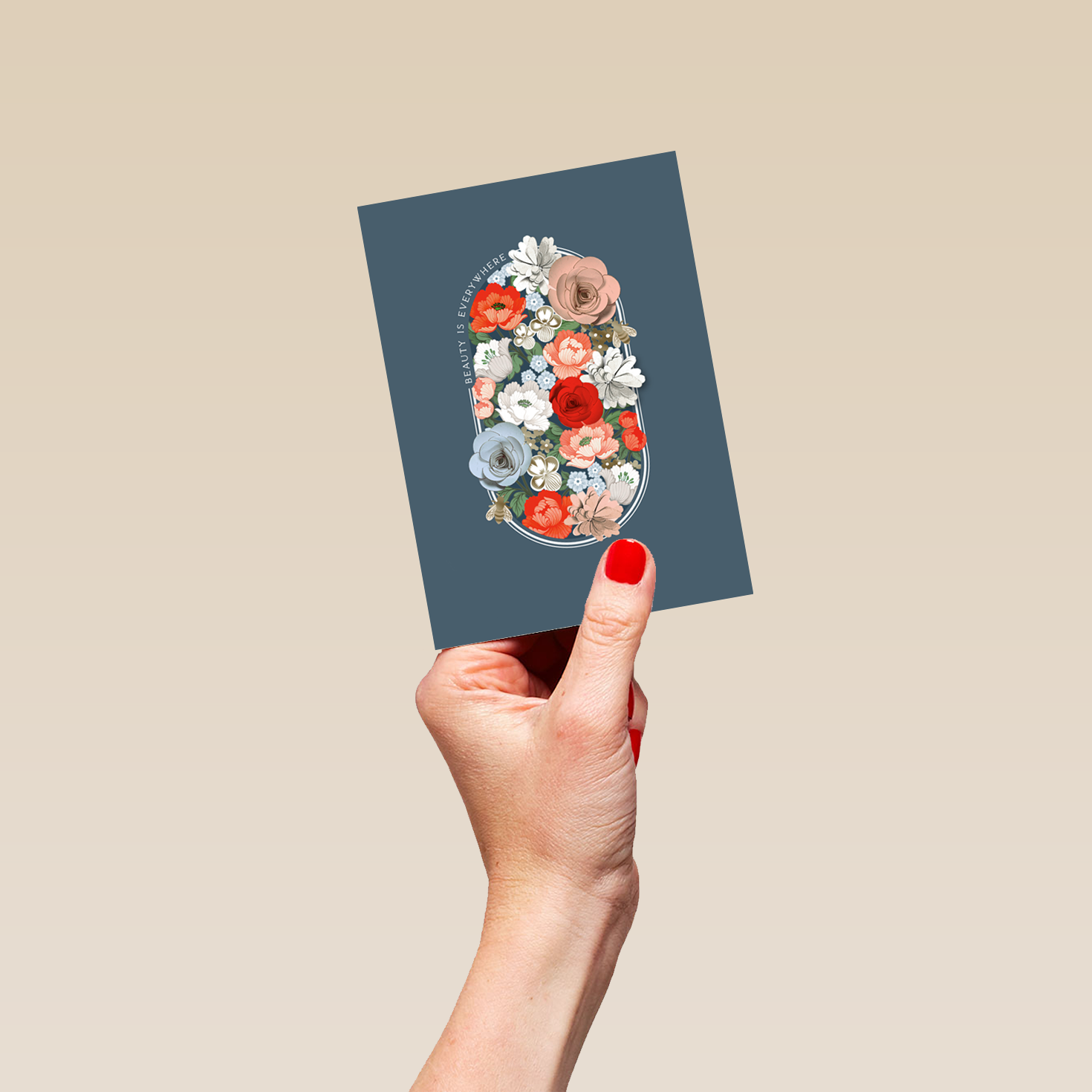 Printed on premium-quality board, this card features a blue/grey background with a lozenge shaped central 'panel' filled with beautifully detailed floral illustrations with white lettering around the top left of the 'panel', with the message 'Beauty is everywhere', and comes complete with a co-ordinating white envelope.