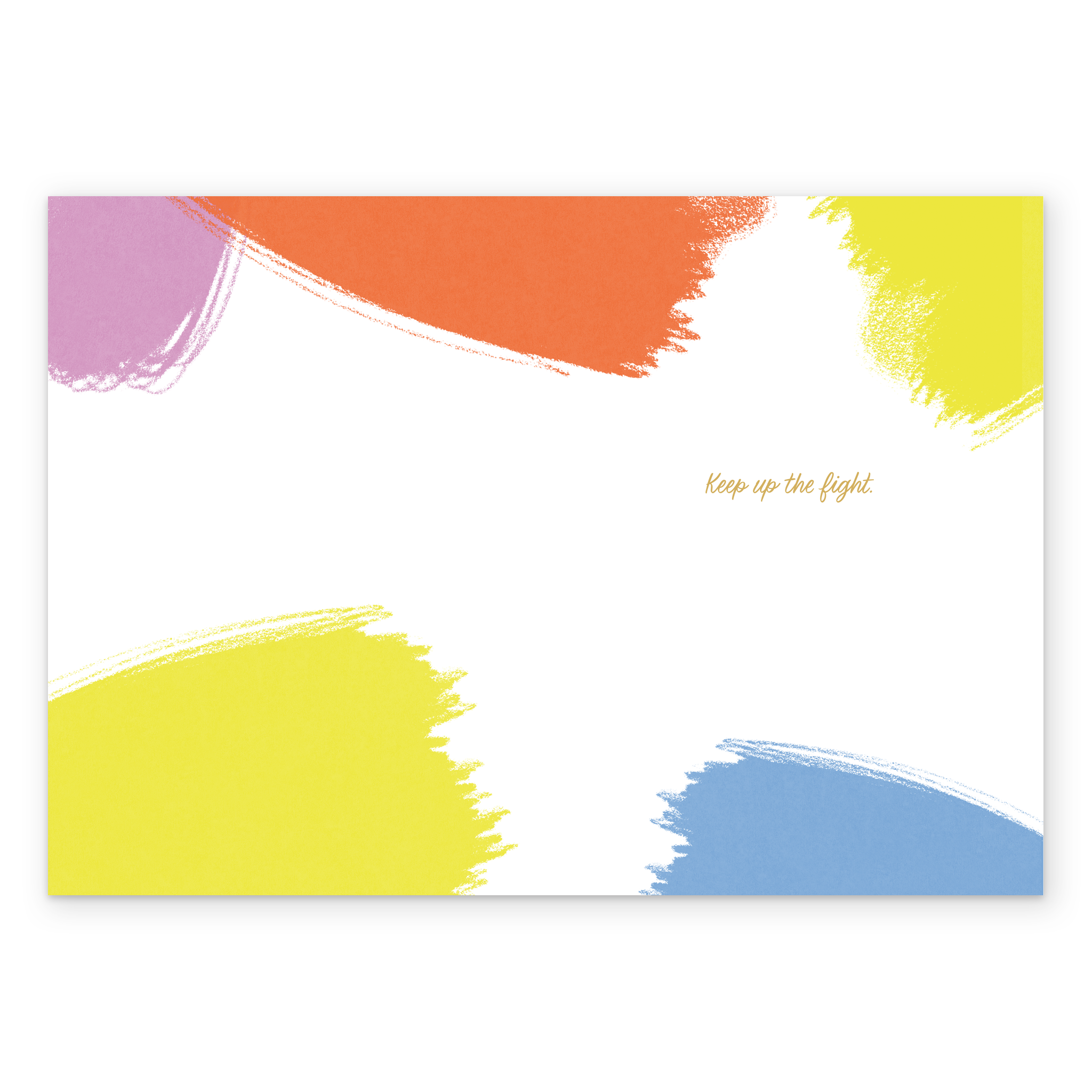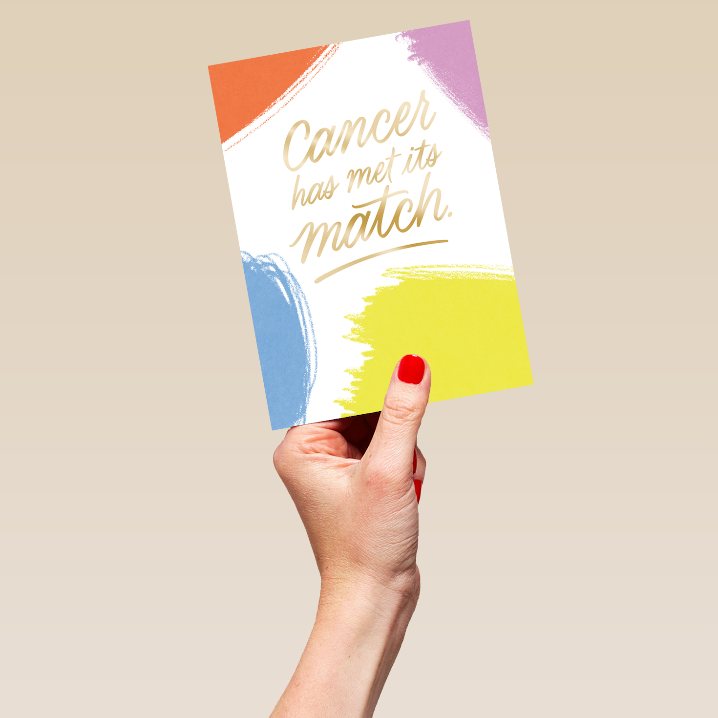 Printed on premium-quality board, this card features painterly daubs of colour against a plain white background, surrounding gold, handwritten style lettering, with the message 'Cancer has met its match', and comes complete with a co-ordinating white envelope.