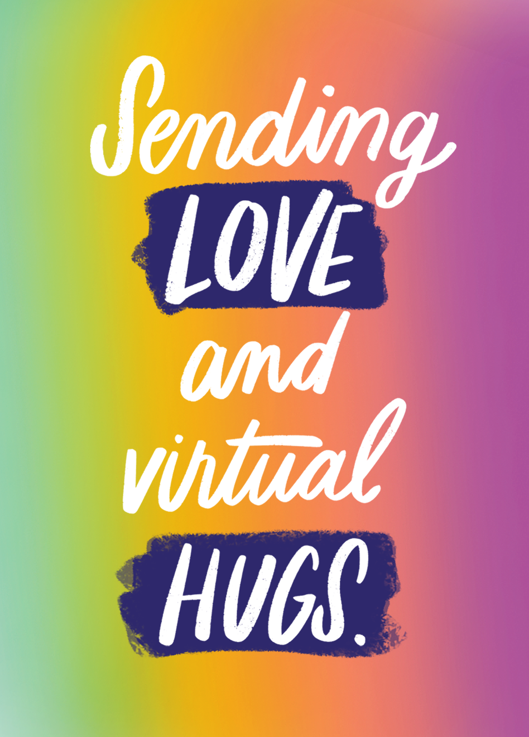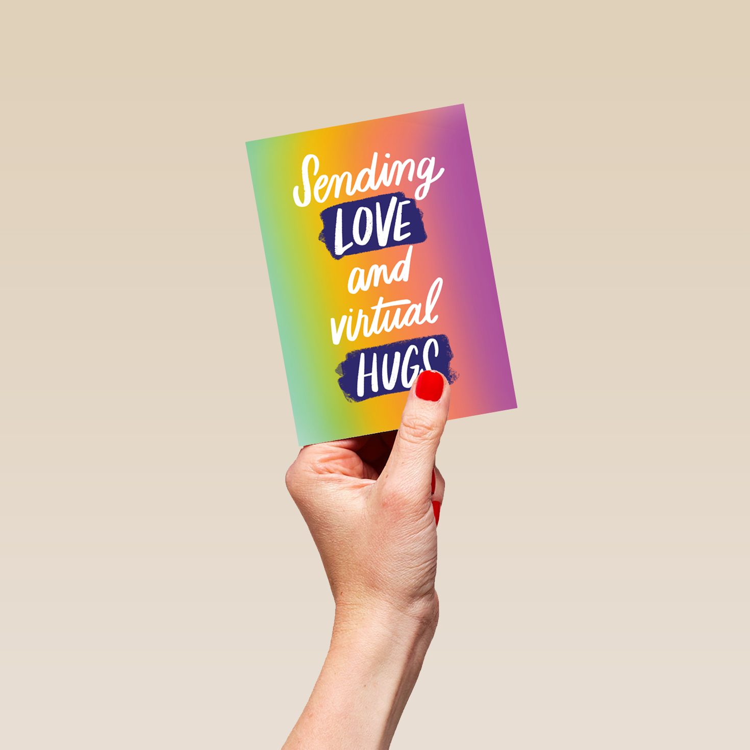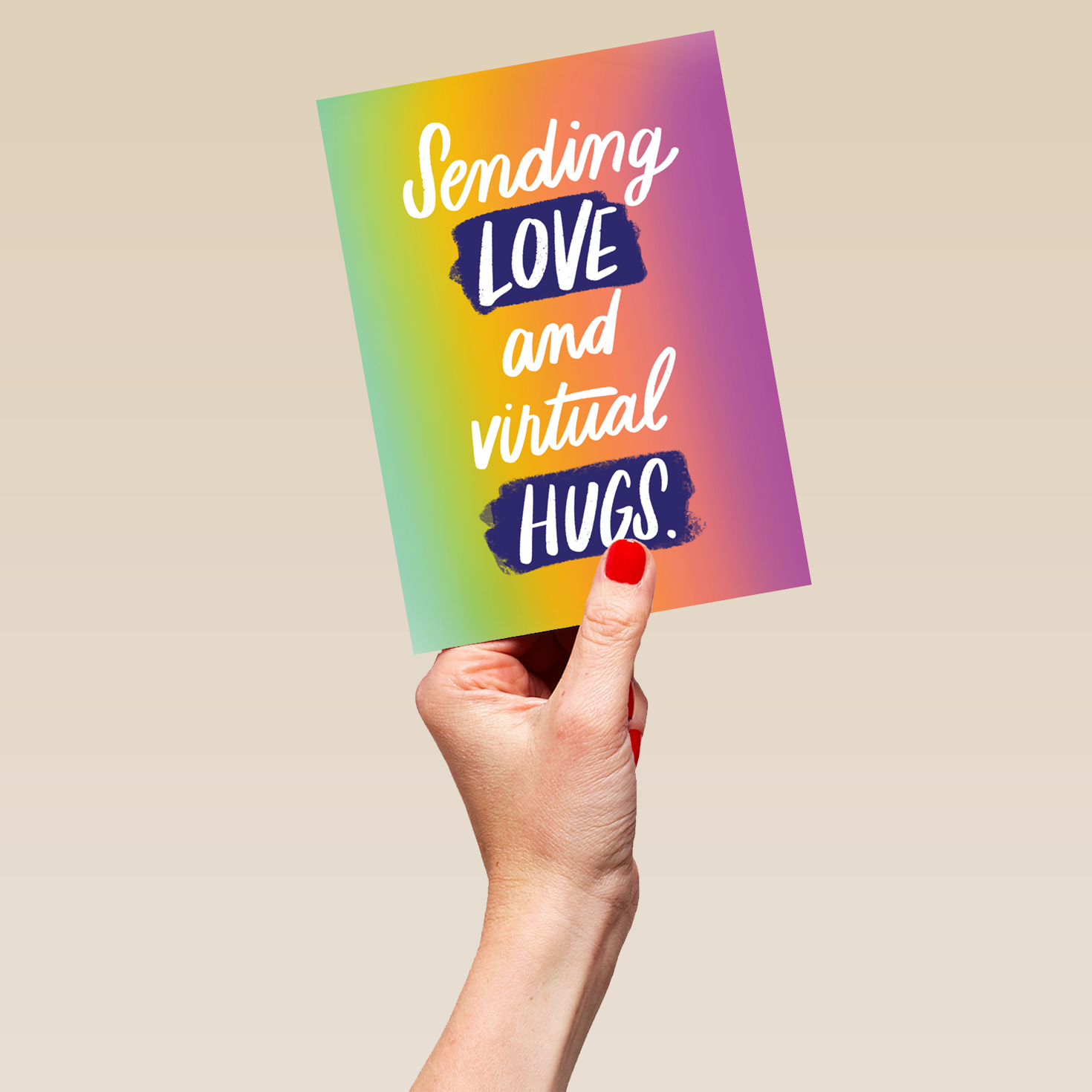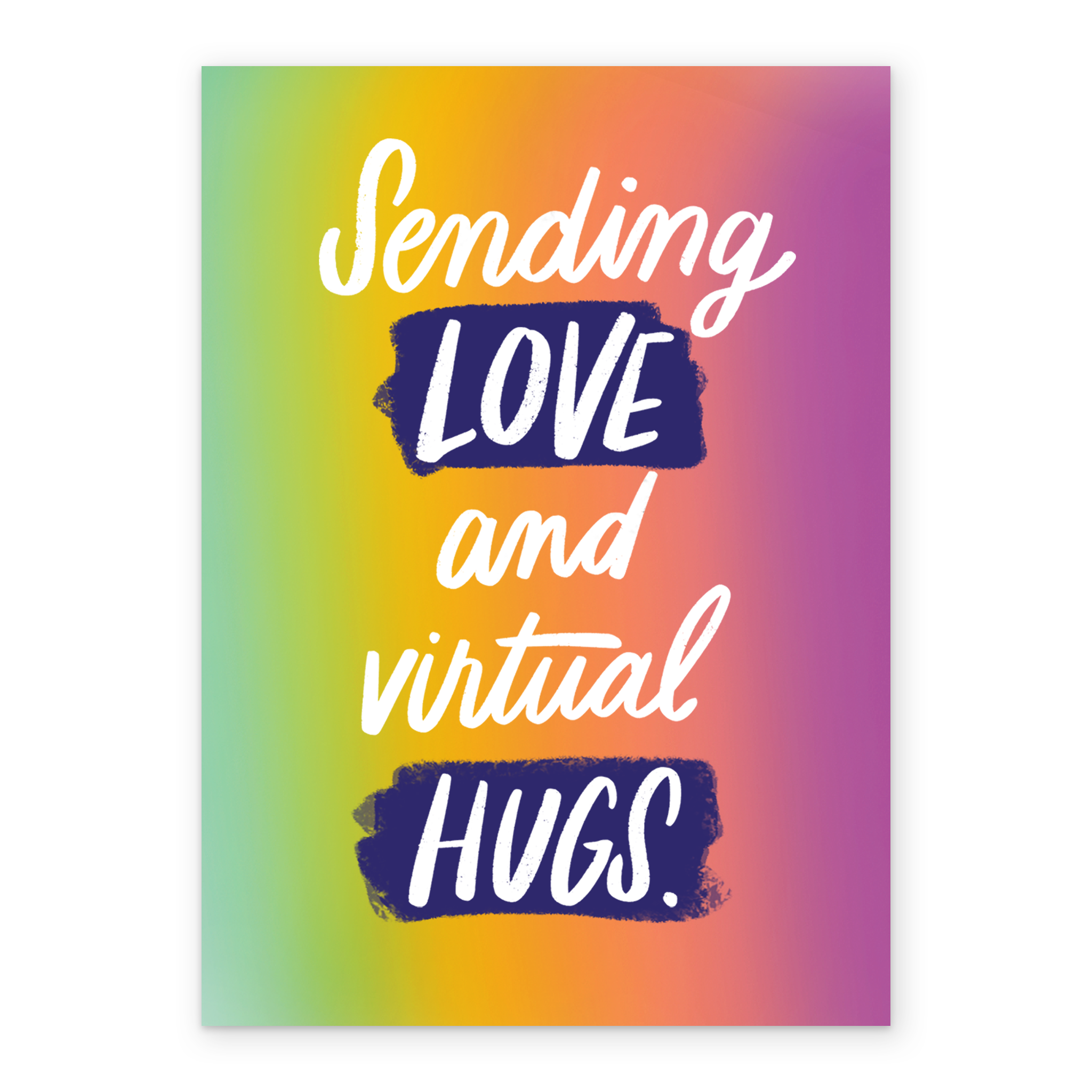 Printed on premium-quality board, this card features typography word art on a colourful background, with the message 'Sending love and virtual hugs', and comes complete with a co-ordinating white envelope.