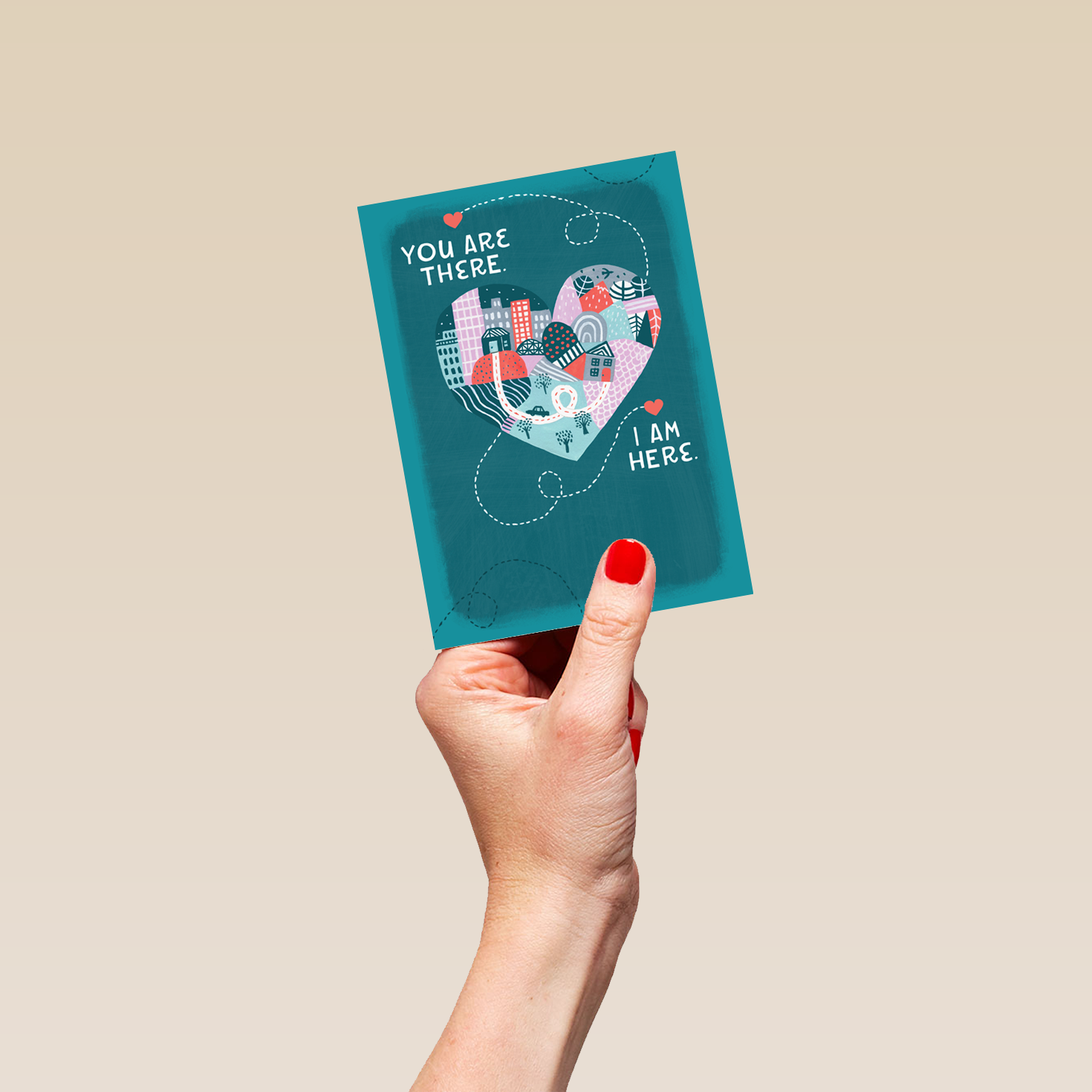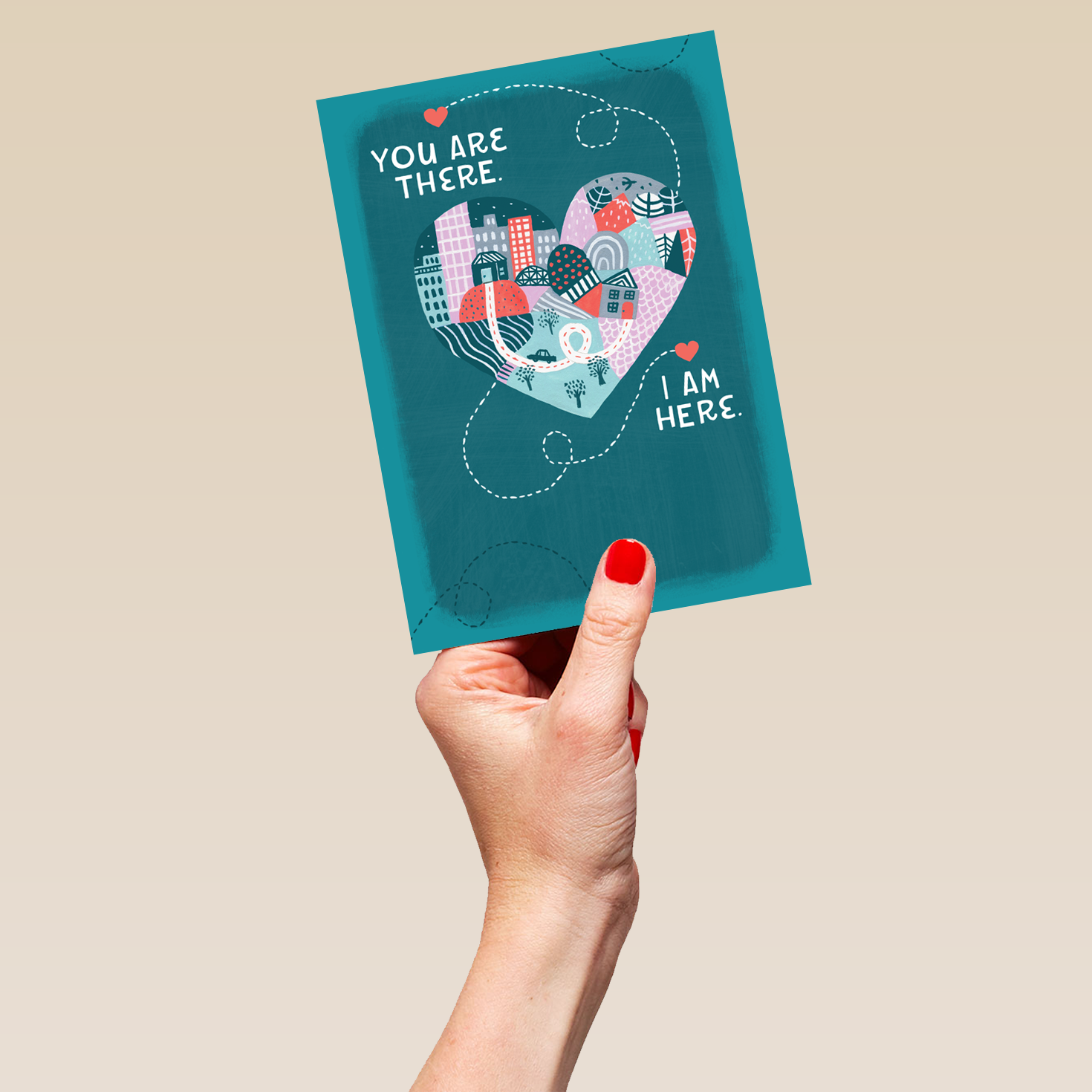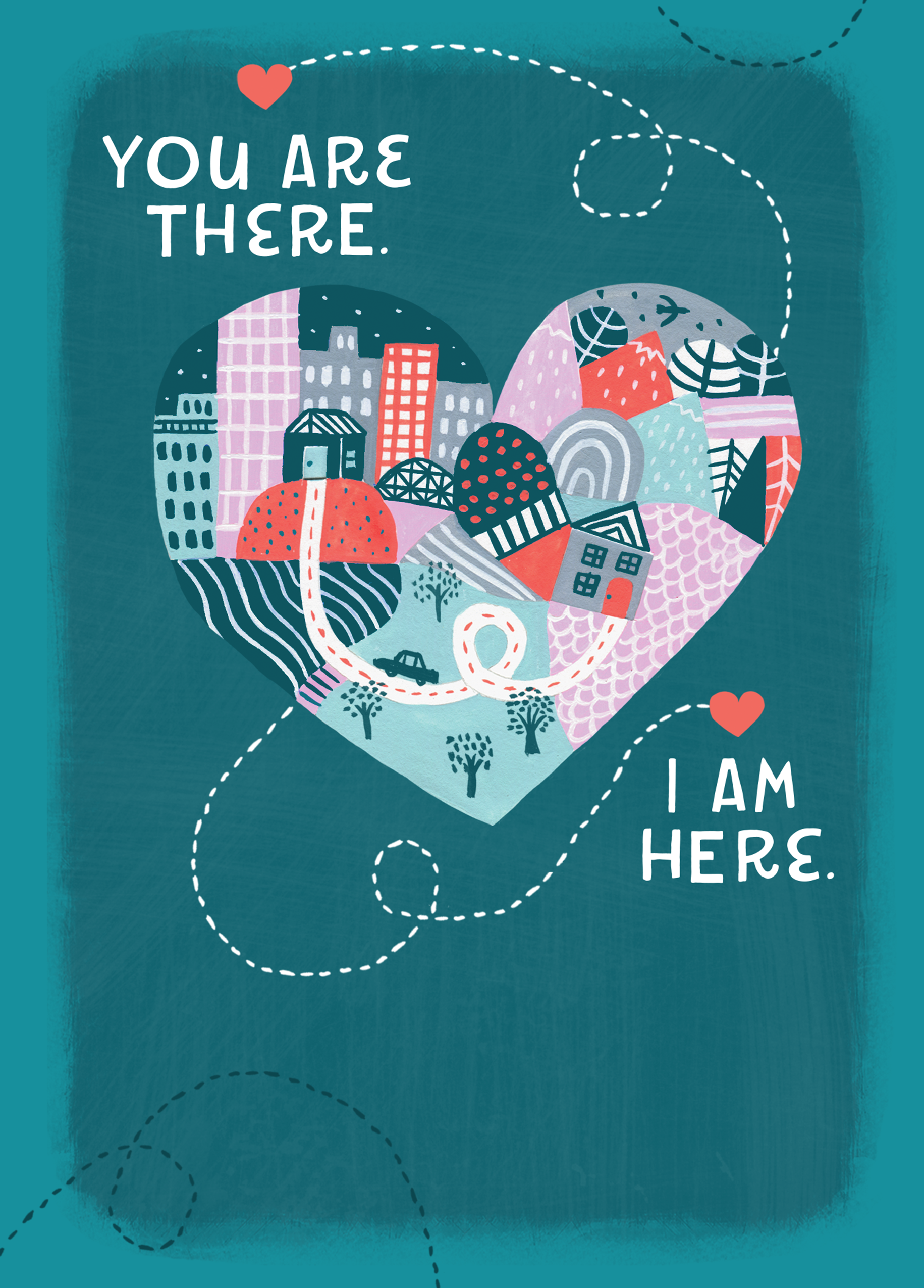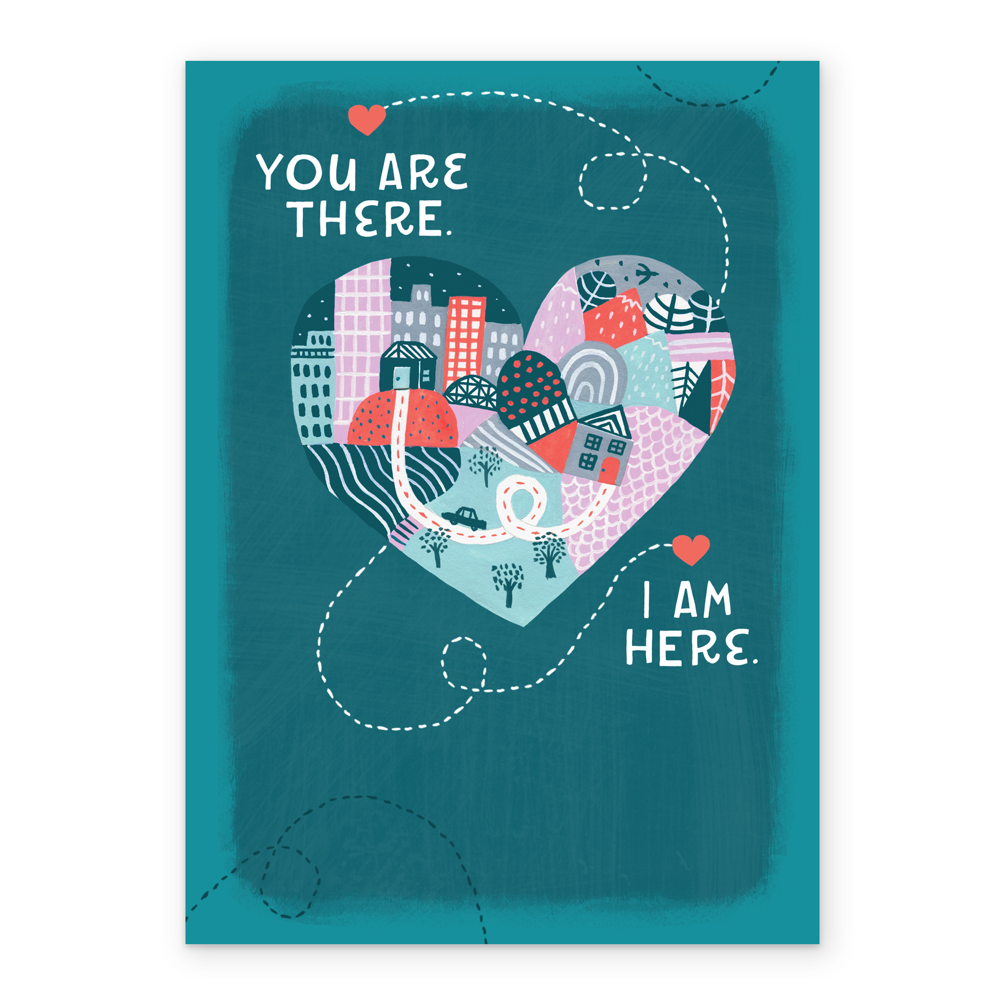 Printed on premium-quality board, this card features a blue background with a heart filled with hills and houses, with the message 'You Are There. I am Here.', and comes complete with a co-ordinating white envelope.