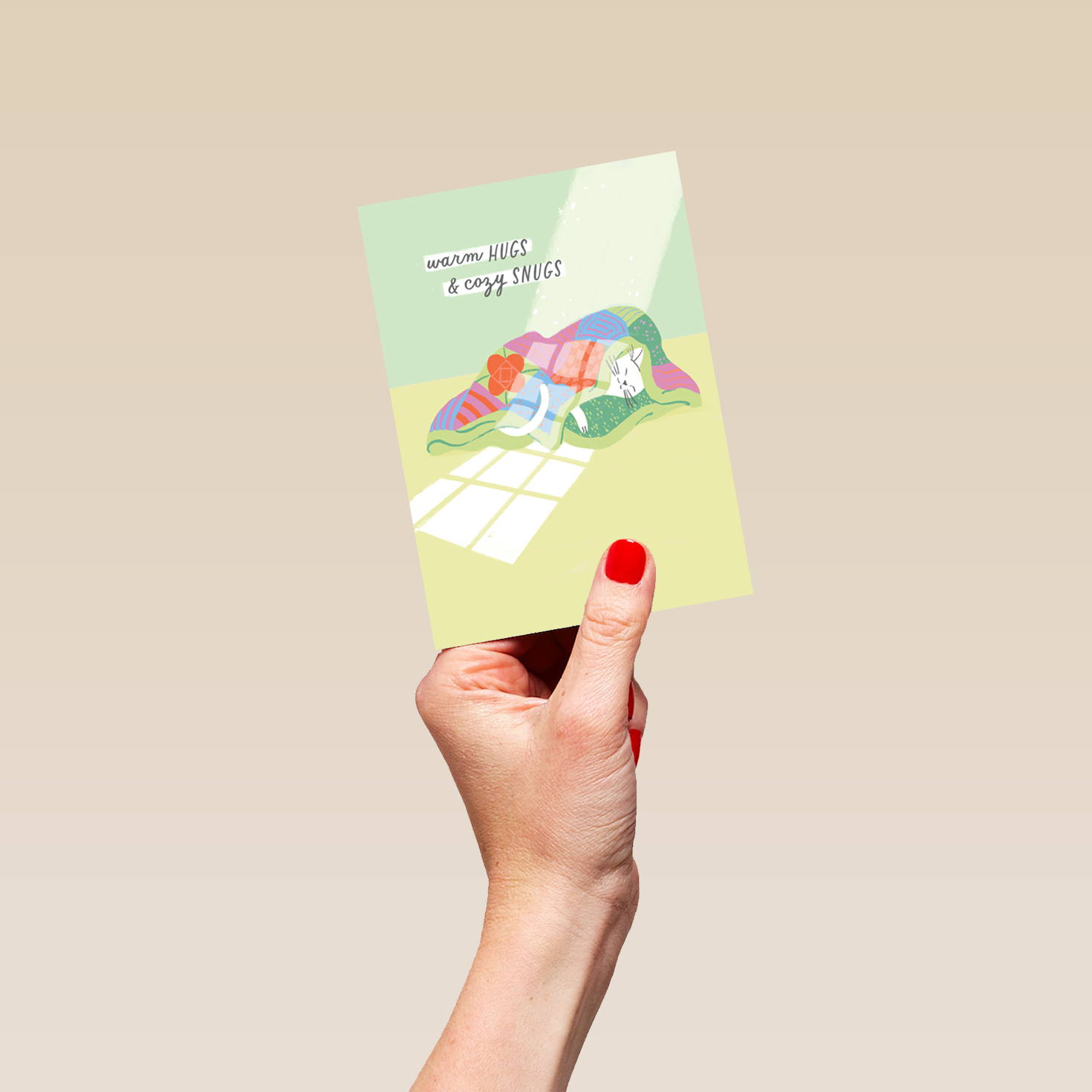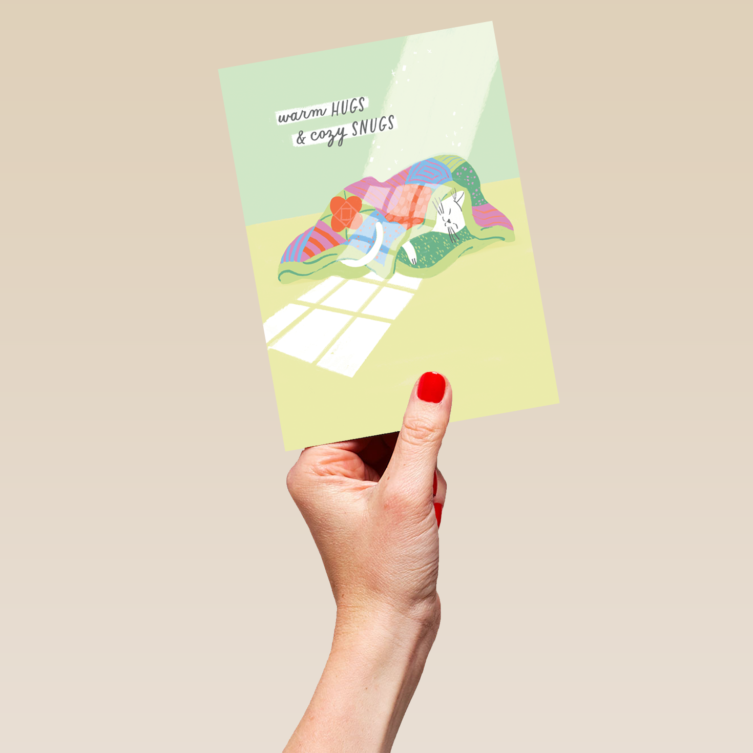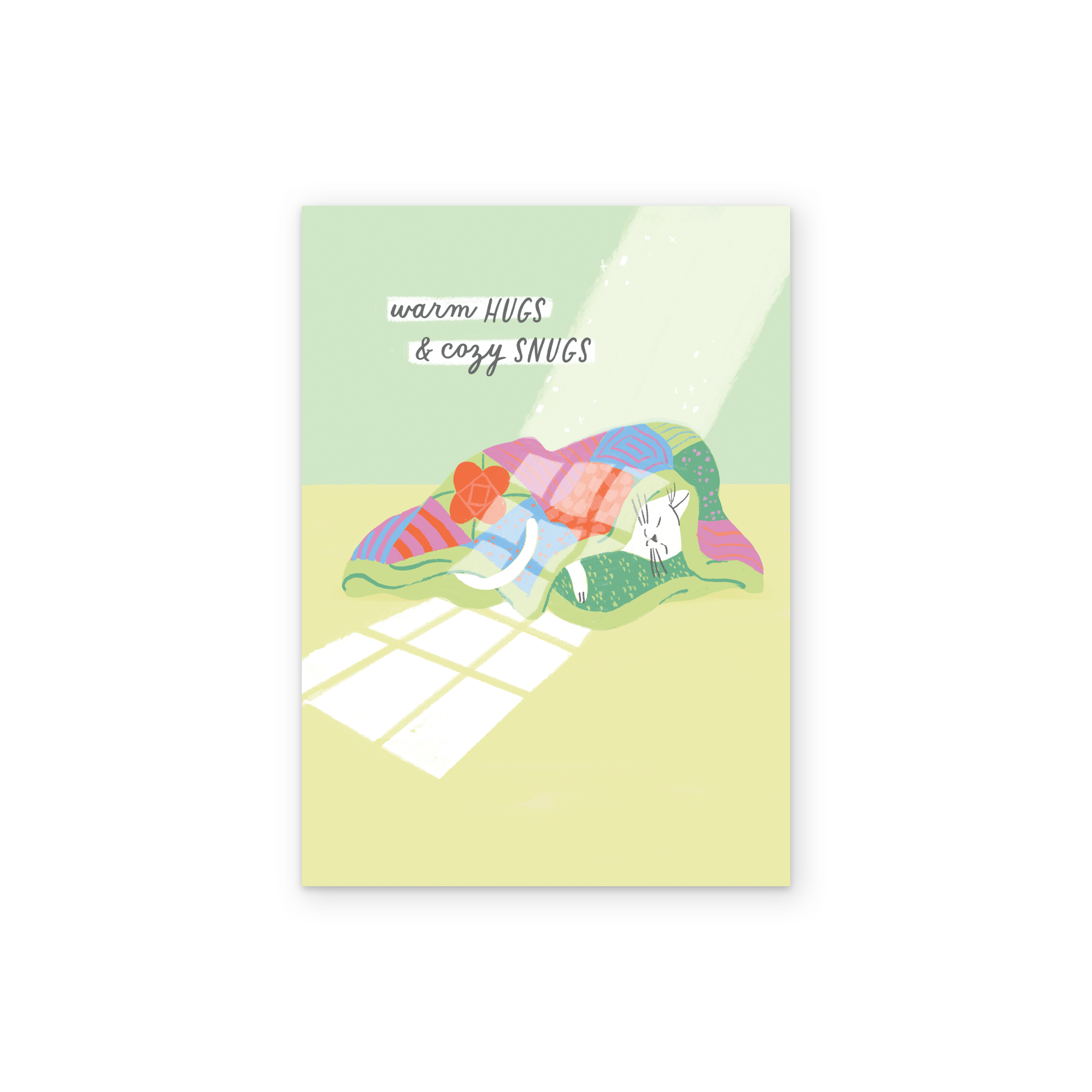 Printed on premium-quality board, this card features a super-cute illustration of a white cat cocooned in a pile of blankets, lying on a floor in a bright patch of sunlight below handwritten style black lettering, with the message 'Warm hugs & cosy snugs', and comes complete with a co-ordinating white envelope.