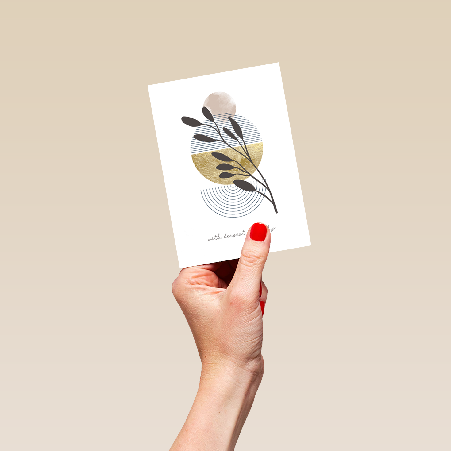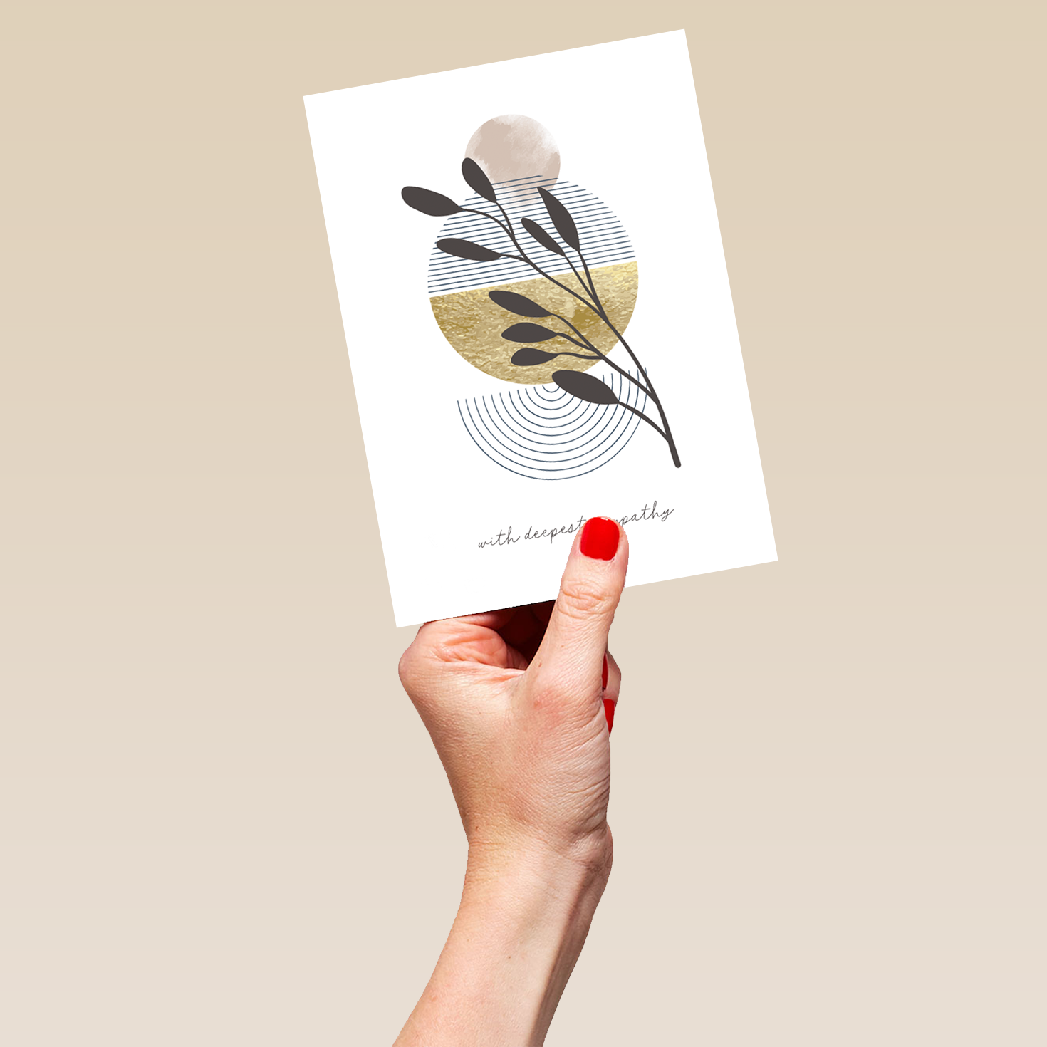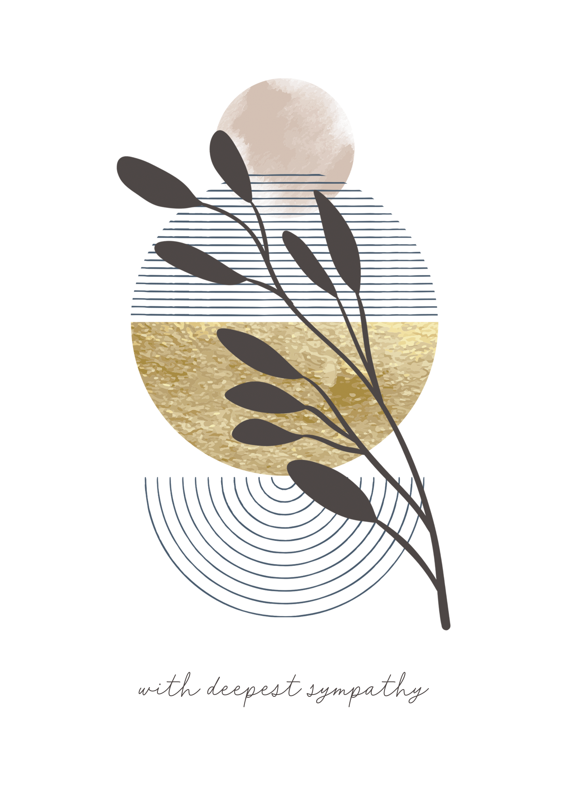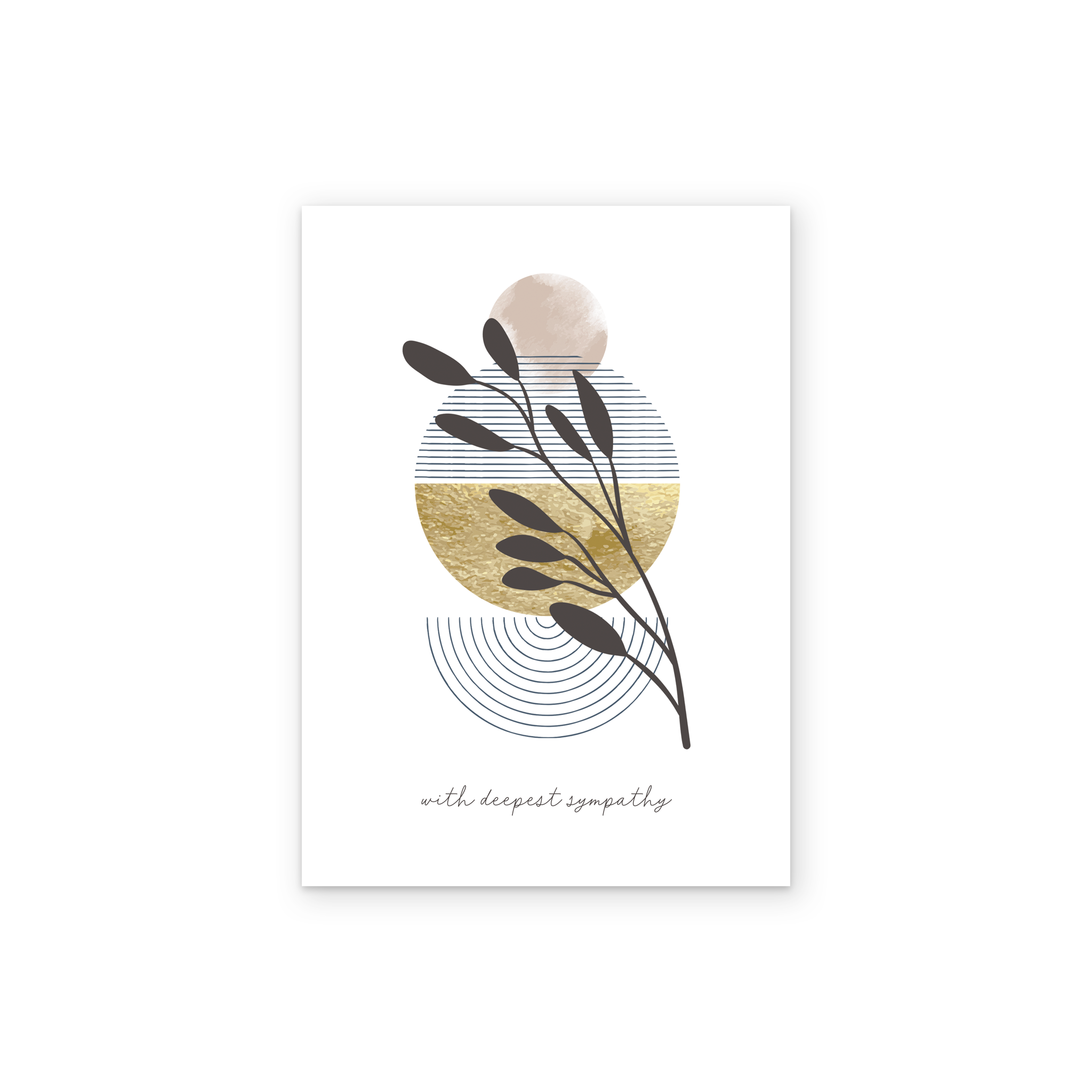 Printed on premium-quality board, this card features a silhouetted floral/grass stem set in front of circular and semi-circular stacked shapes in soft blues and neutral tones set against a white background above handwritten style black lettering, with the message 'With deepest sympathy.', space to personalise your message, and comes complete with a co-ordinating white envelope.