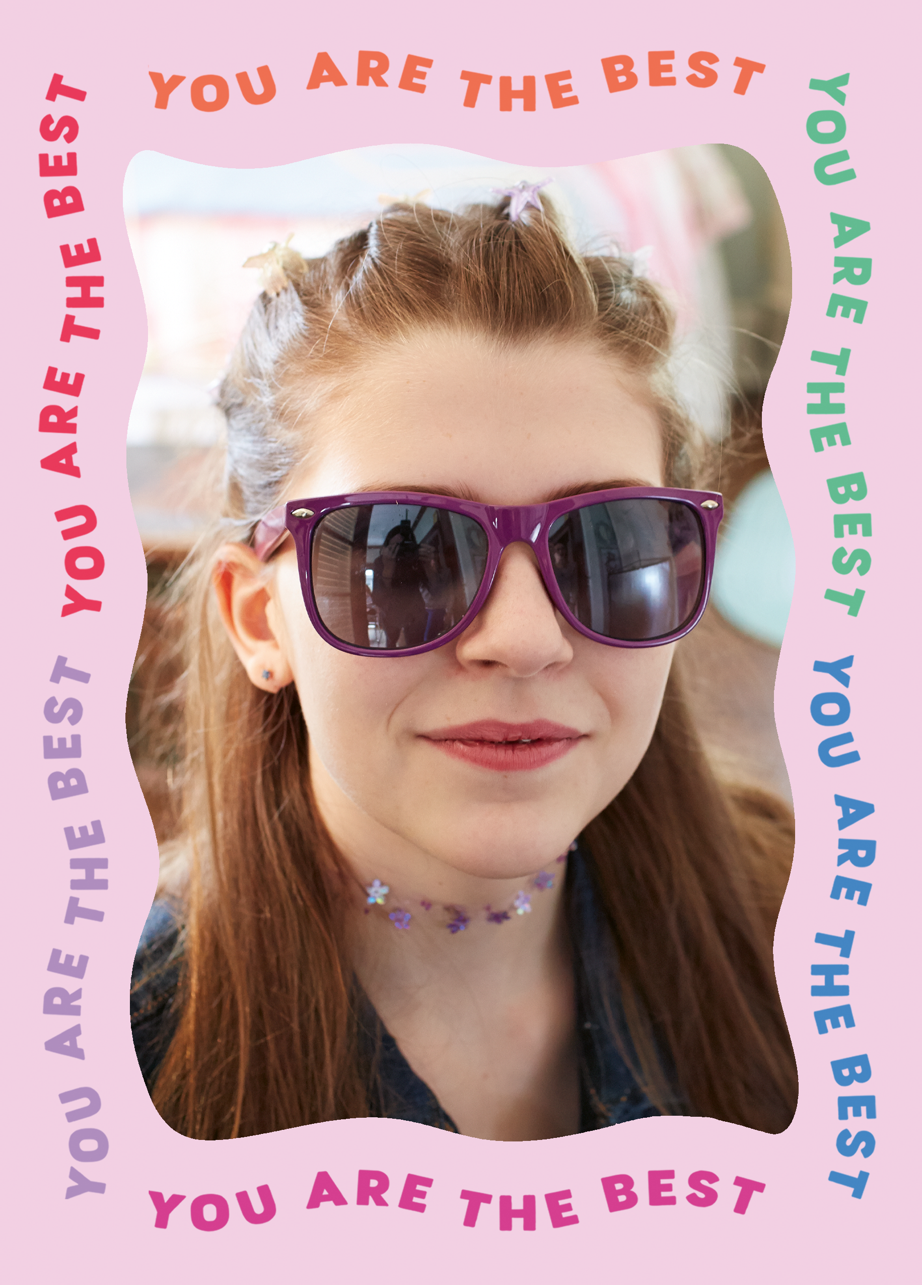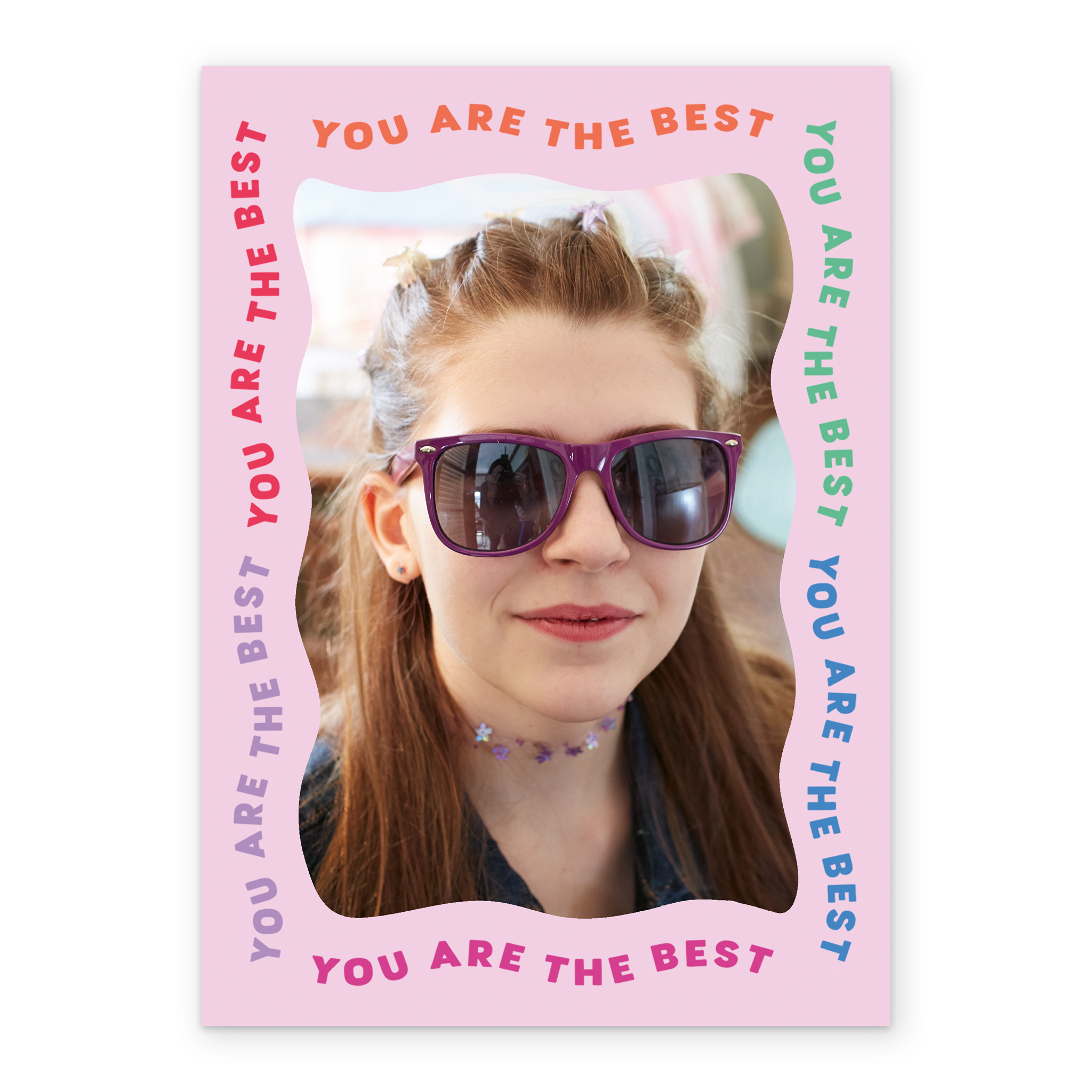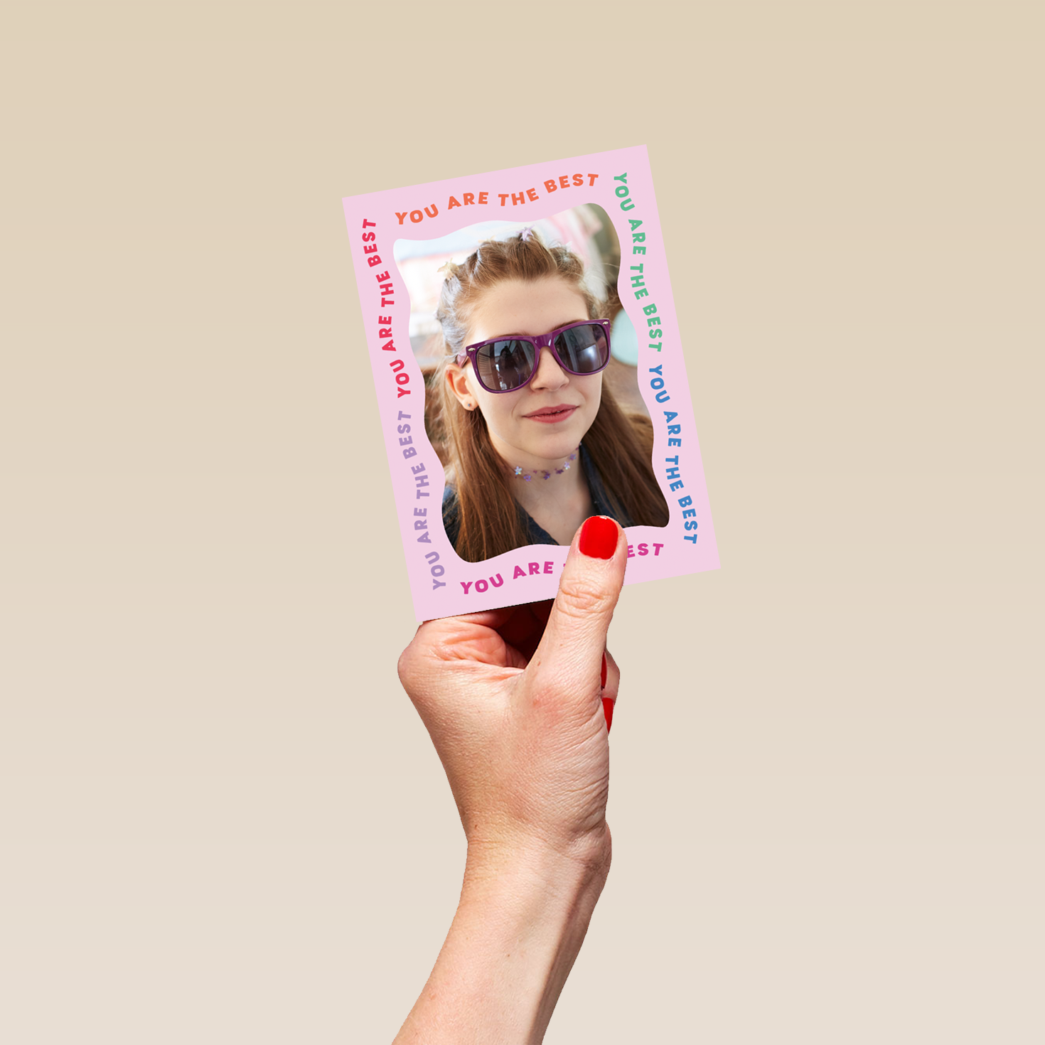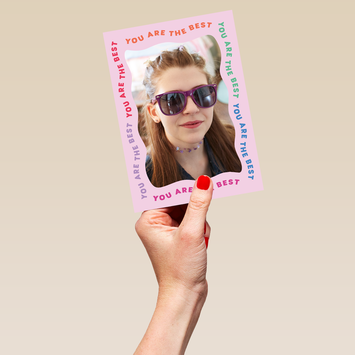Printed on premium-quality board, this card features a pink wavy photo frame border with colourful text, with the message 'You are the best', space to upload a photo, and comes complete with a co-ordinating white envelope.