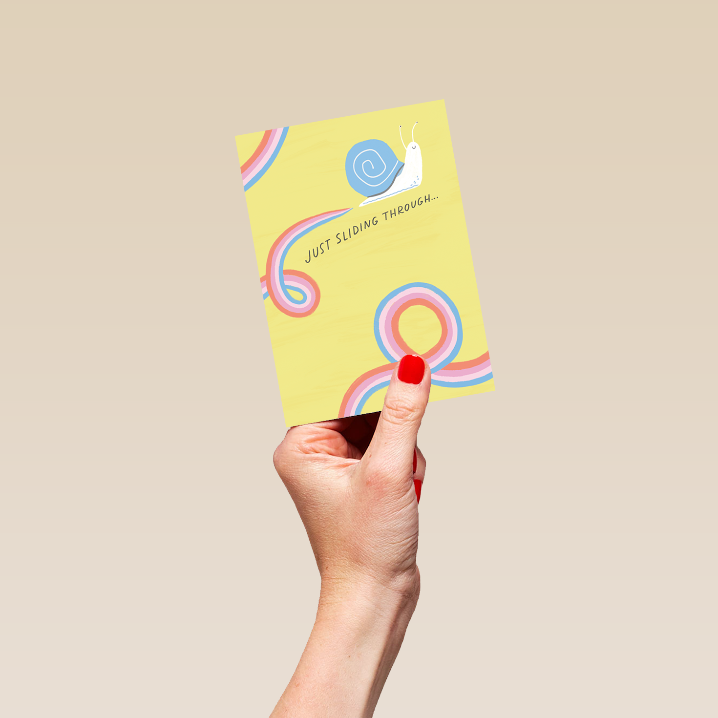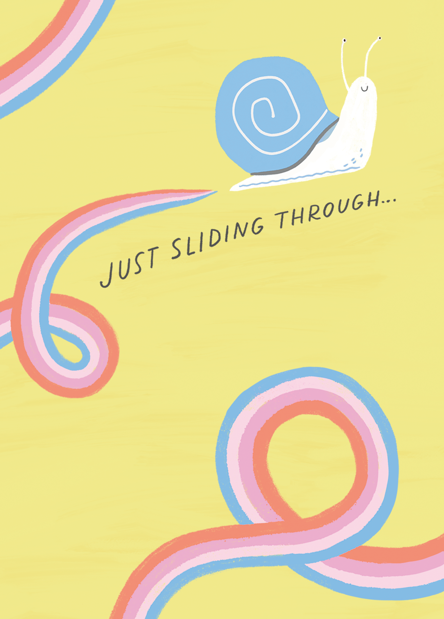 Printed on premium-quality board, this card features a cute, illustrated snail and rainbow snail tracks are shown against a greeny-yellow background alongside simple black lettering, with the message 'Just sliding through…', and comes complete with a co-ordinating white envelope.