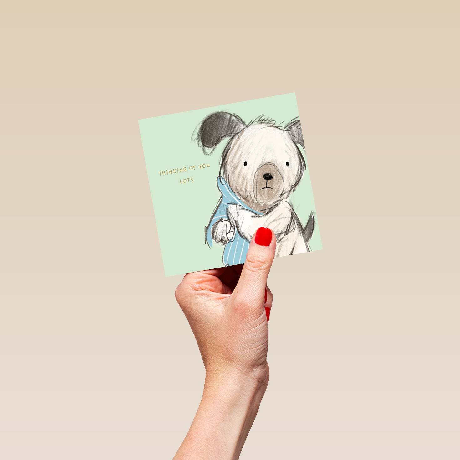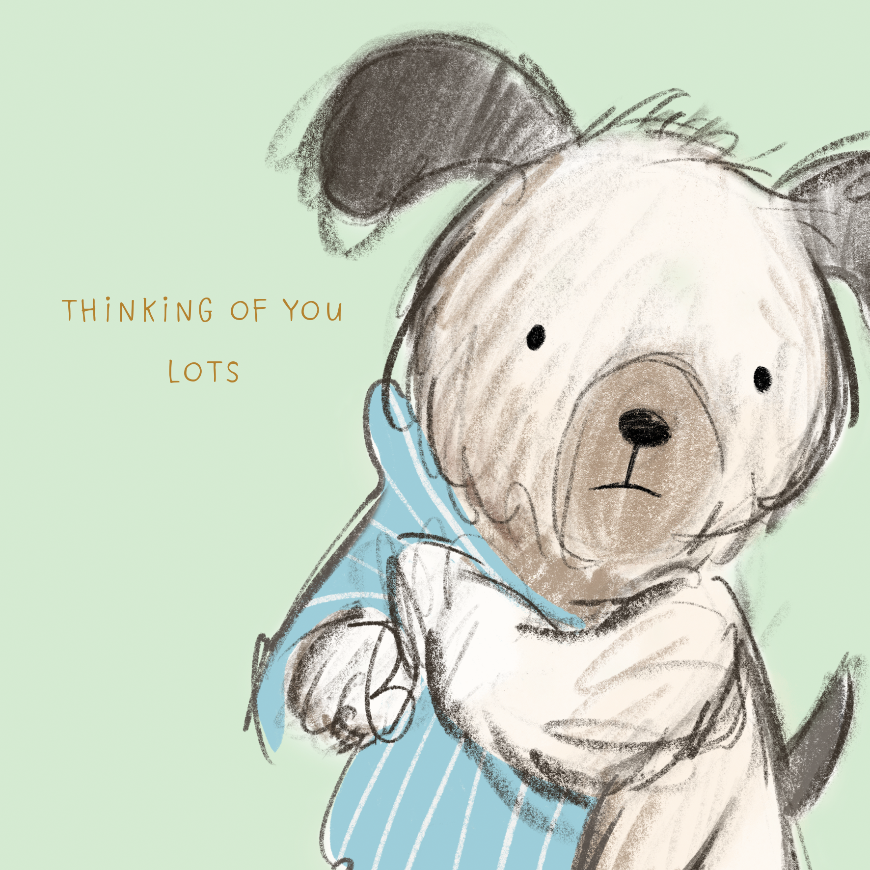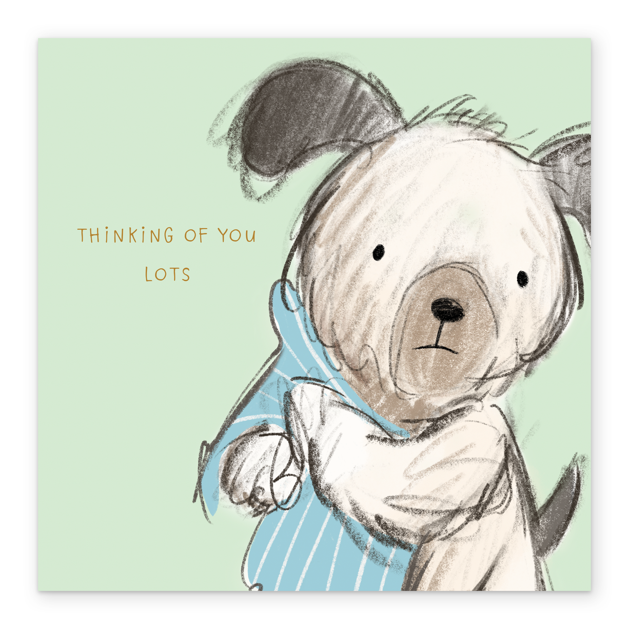 Printed on premium-quality board, this card features a cute, sketch style illustration of a sweet, black and white dog, cuddling a blue and white striped blanket, set against a pale green background with gold-coloured lettering, with the message 'Thinking of you lots', space to personalise your message, and comes complete with a co-ordinating white envelope.