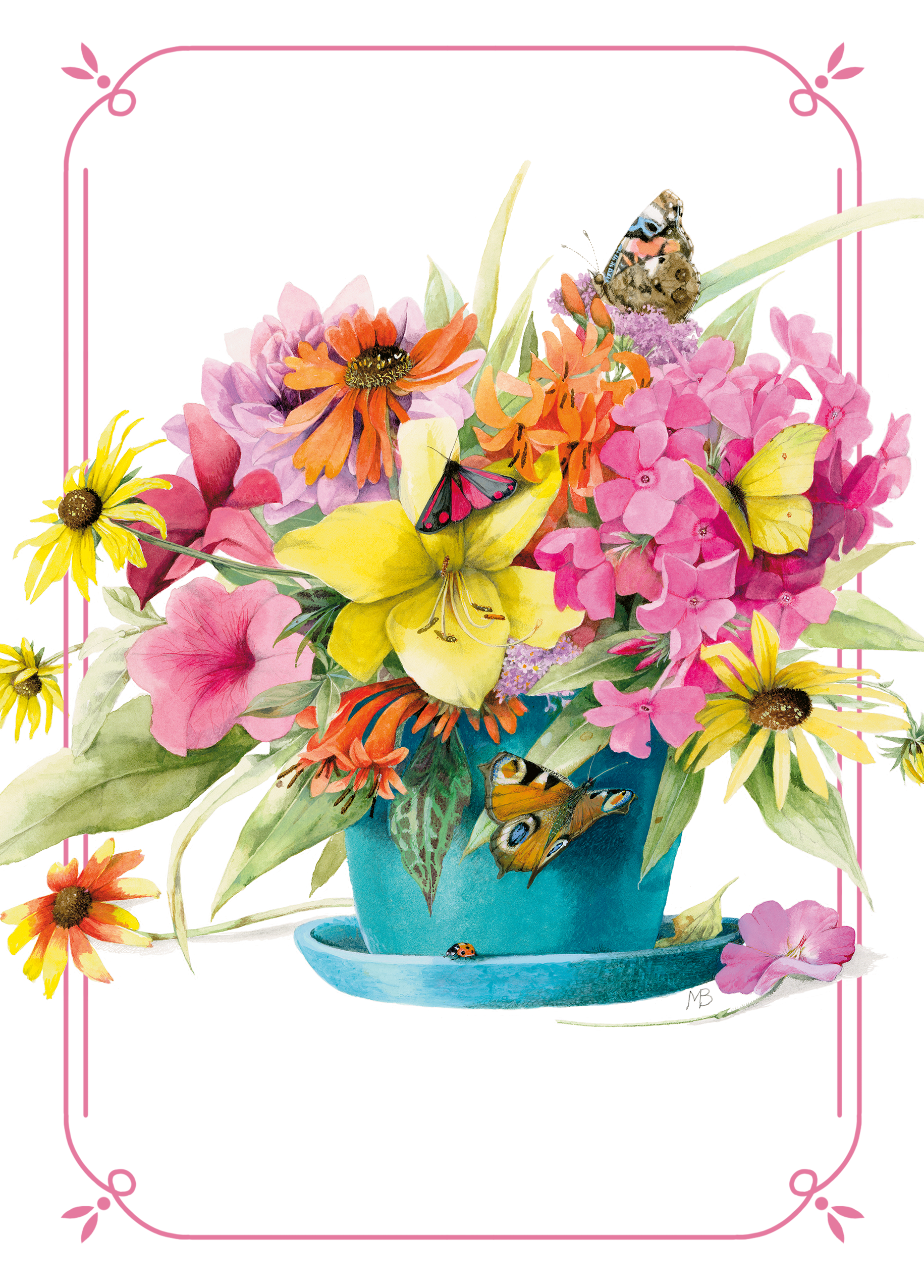 Printed on premium-quality board, this card features a traditional and colourful illustration of a blue vase filled with pink and yellow flowers set against a white background with a delicate pink border, and comes complete with a co-ordinating white envelope.