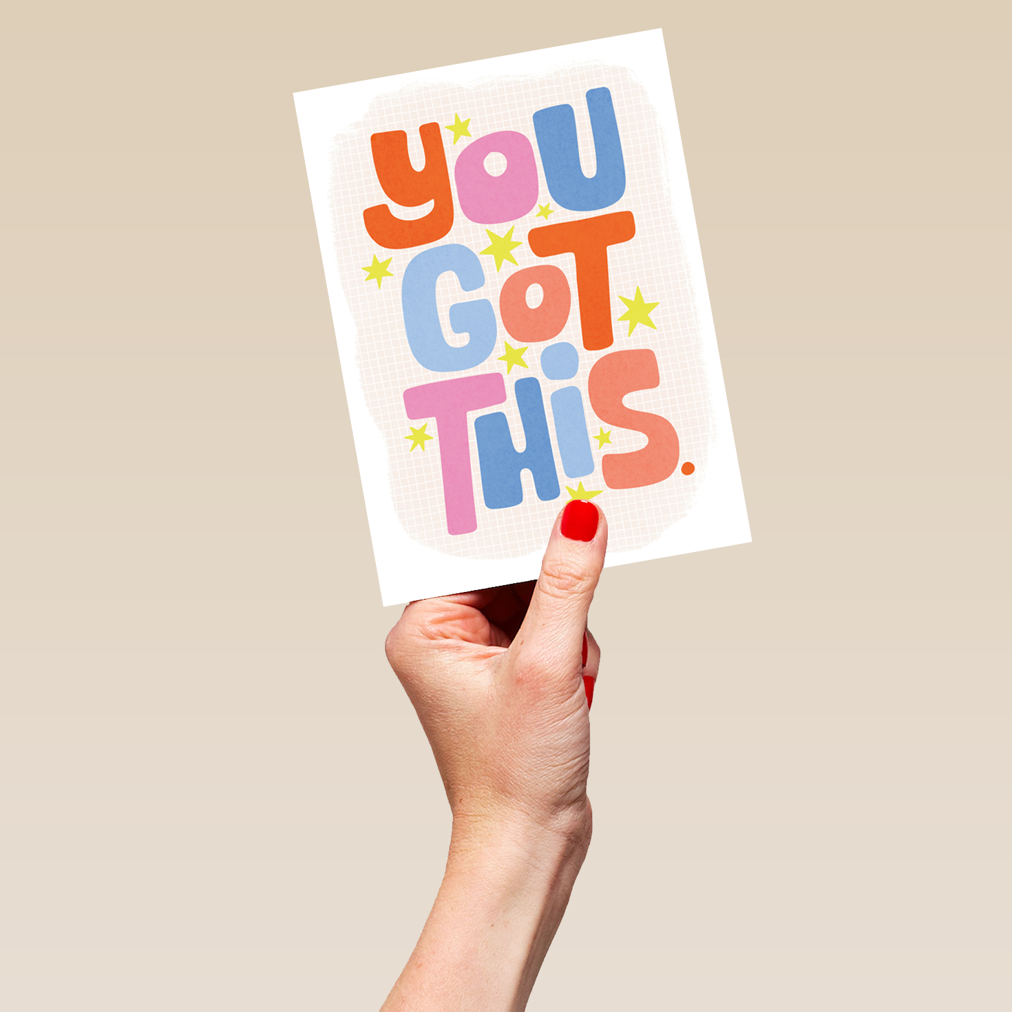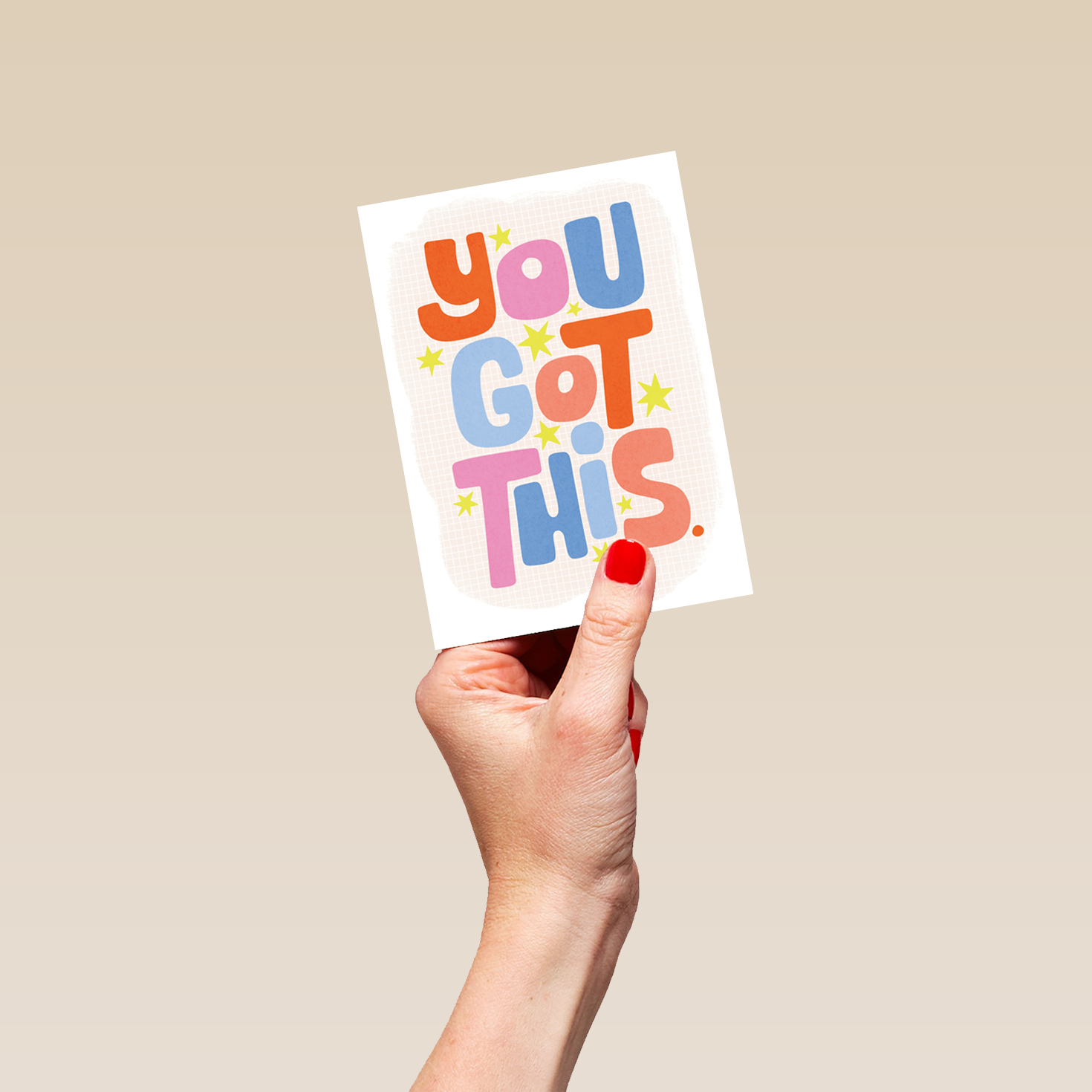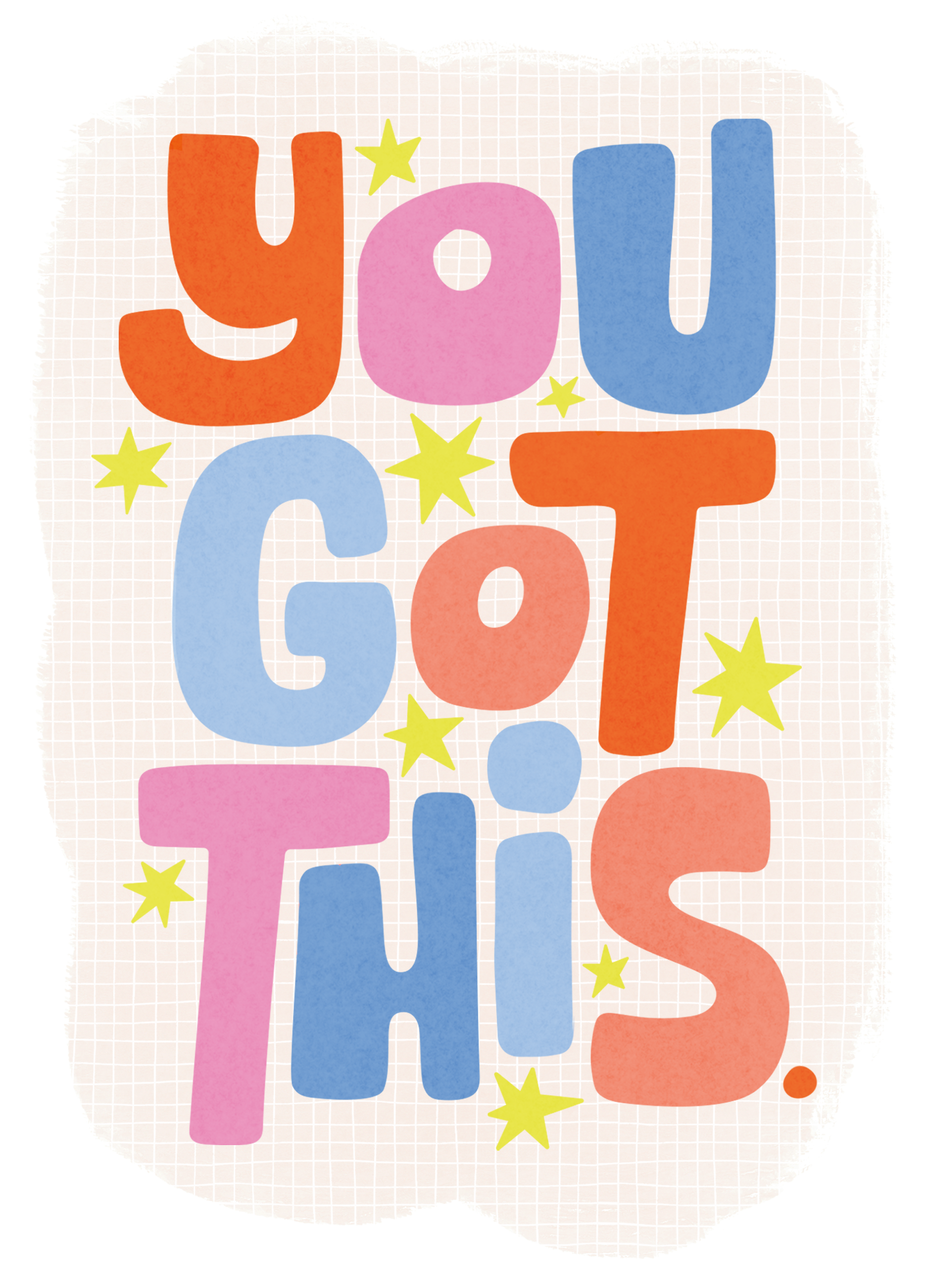 Printed on premium-quality board, this card features an off white background dotted with yellow stars, surrounding colourful retro style 'bubble' lettering in reds, blues and pinks, with the message 'You Got This.', and comes complete with a co-ordinating white envelope.