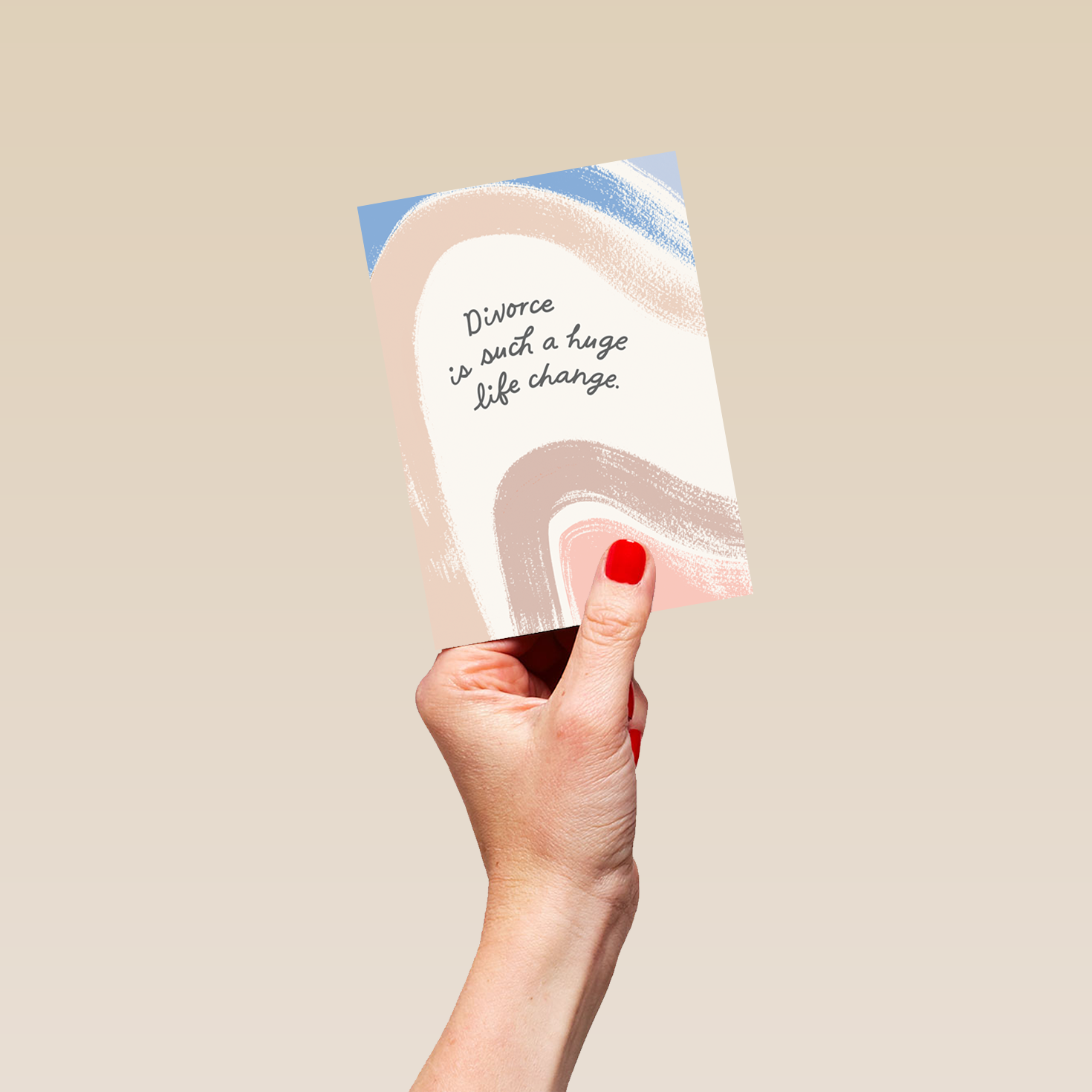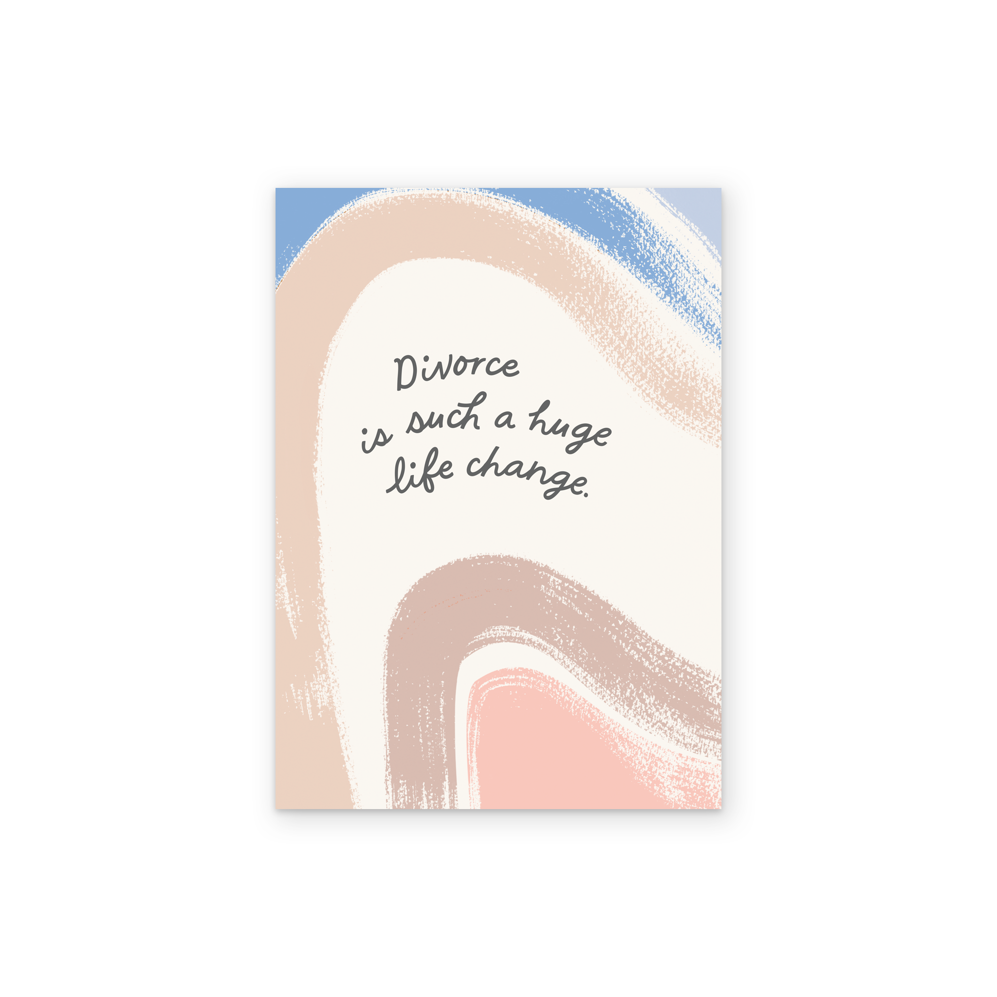 Printed on premium-quality board, this card features curved, painterly, brushstroke style marks set against an ivory background with delicate black, handwritten style lettering, with the message 'Divorce is such a huge life change.', and comes complete with a co-ordinating white envelope.