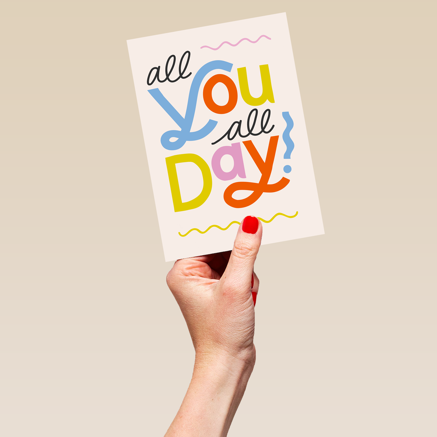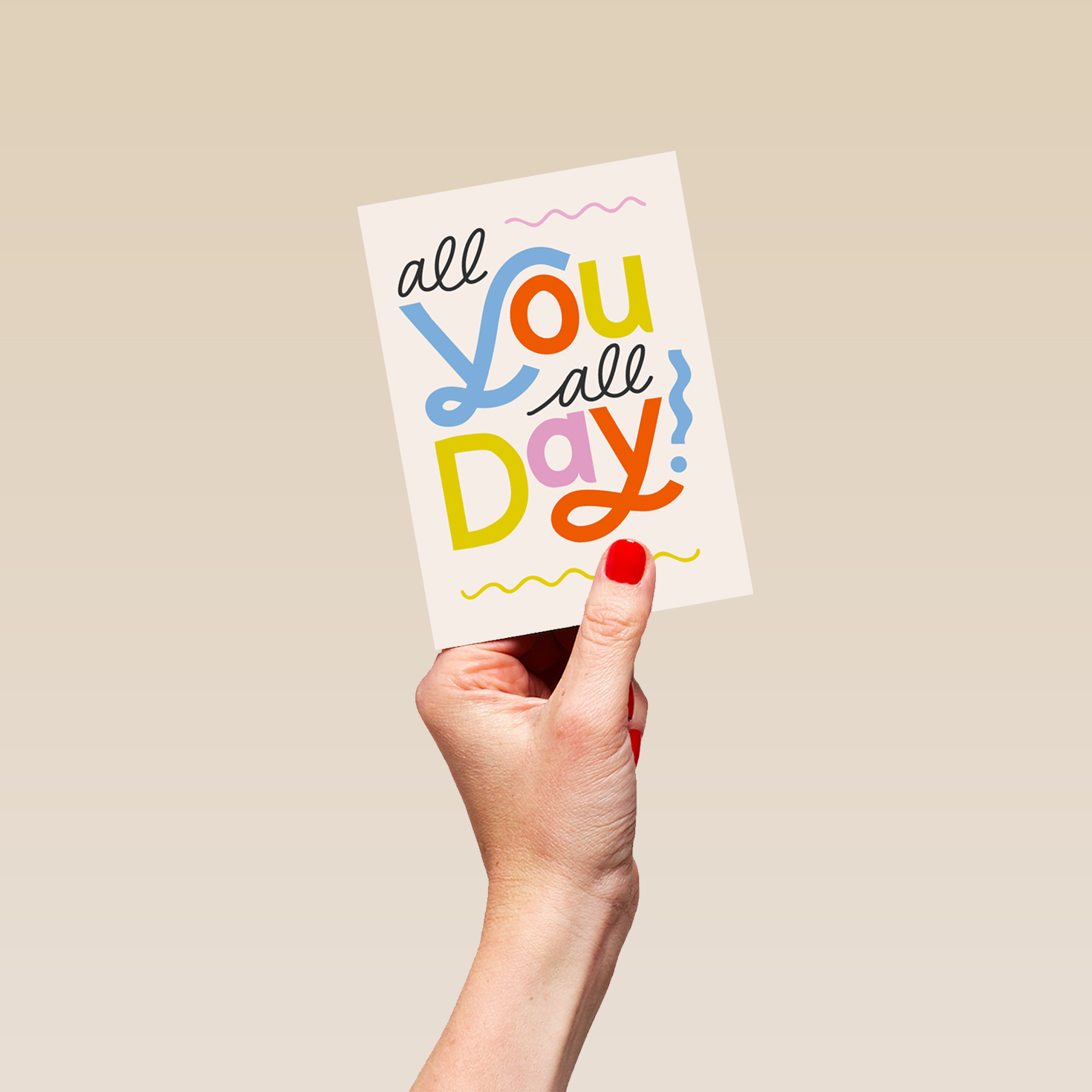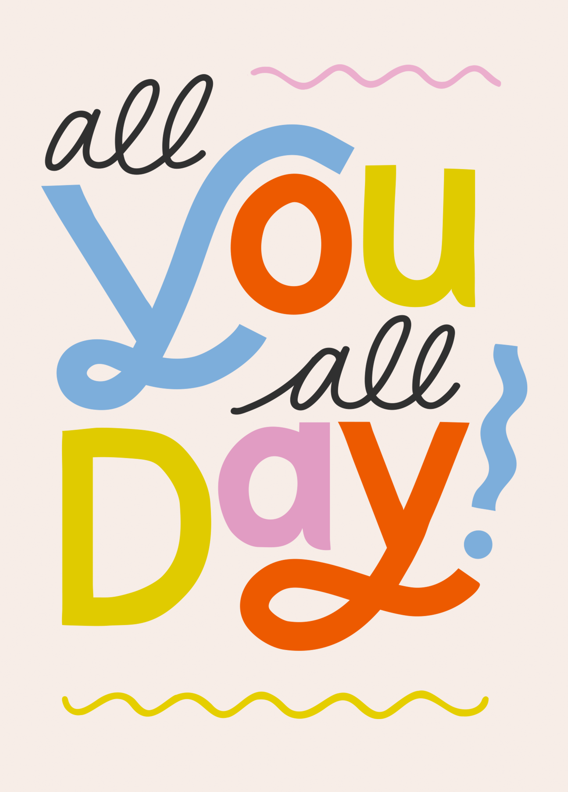Printed on premium-quality board, this card features an off white background overlaid with bold black, blue, yellow, orange and pink lettering, with the message 'All you all day!', and comes complete with a co-ordinating white envelope.
