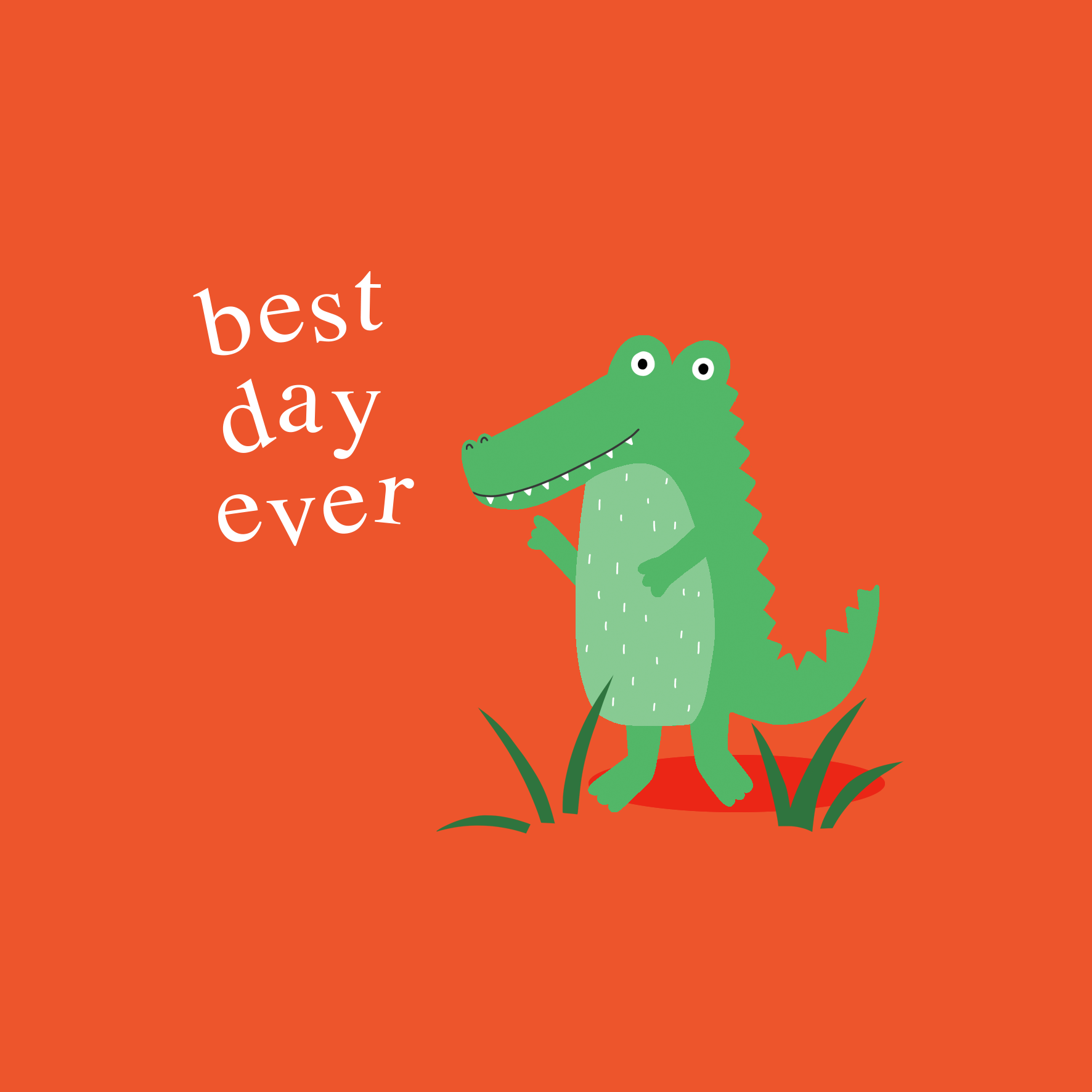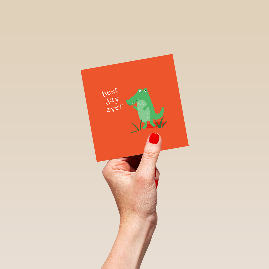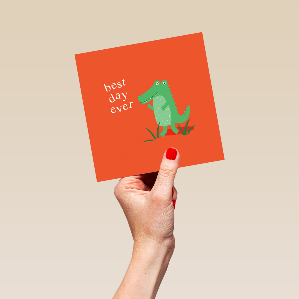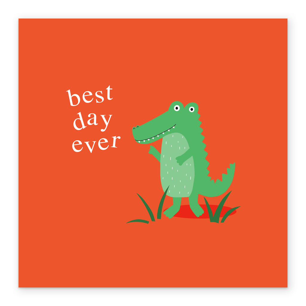Printed on premium-quality board, this card features a green crocodile on a red background, with the message 'Best Day Ever', and comes complete with a co-ordinating white envelope.