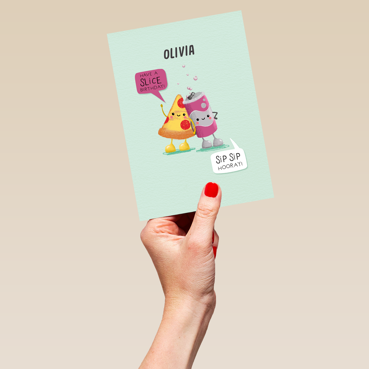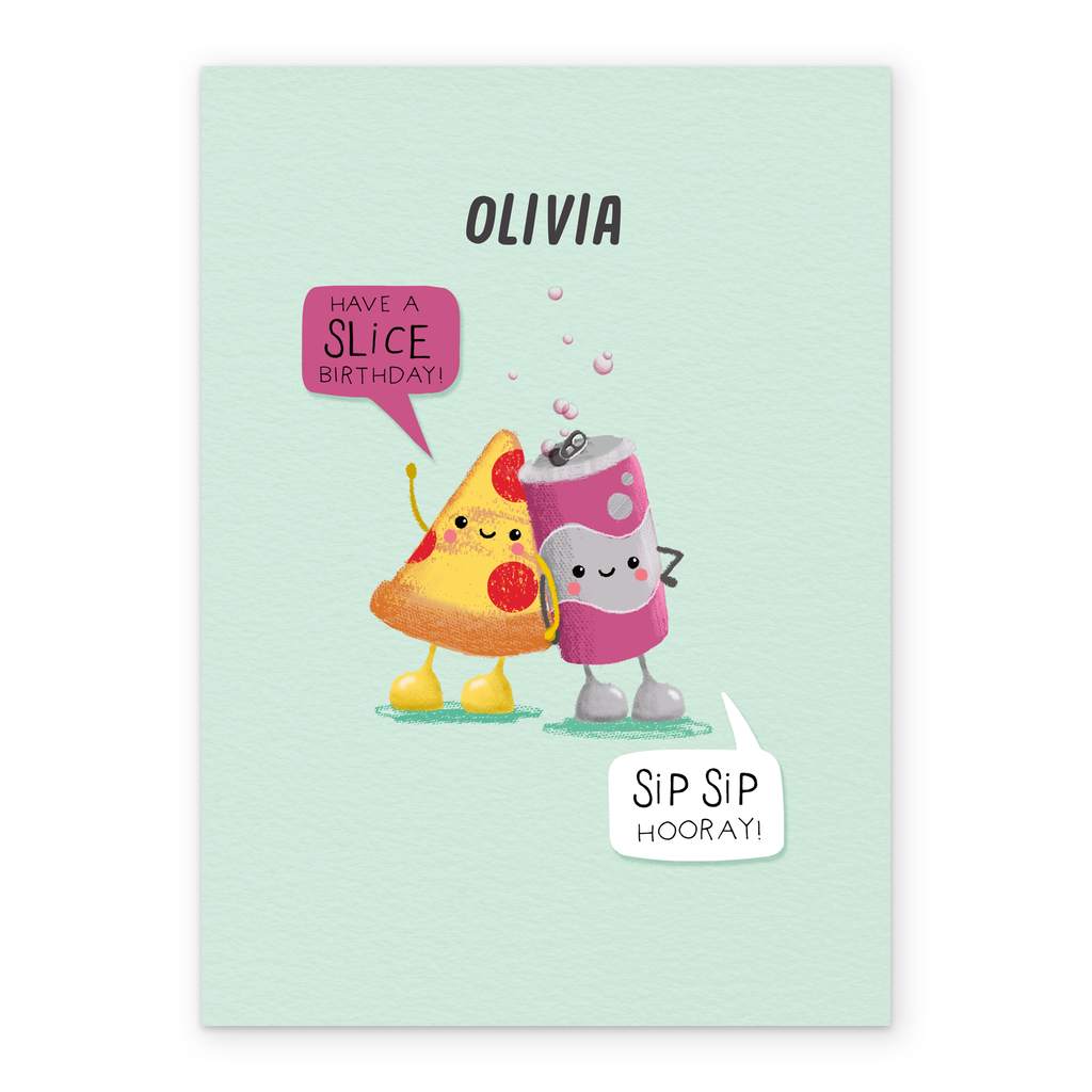 Printed on premium-quality board, this card features a pale green background with a cute illustration of a slice of pizza and a can of pop hugging each other and speech bubbles coming from each character, with the message '[NAME] Have a slice birthday! Sip sip hooray!', space to personalise a name, and comes complete with a co-ordinating white envelope.