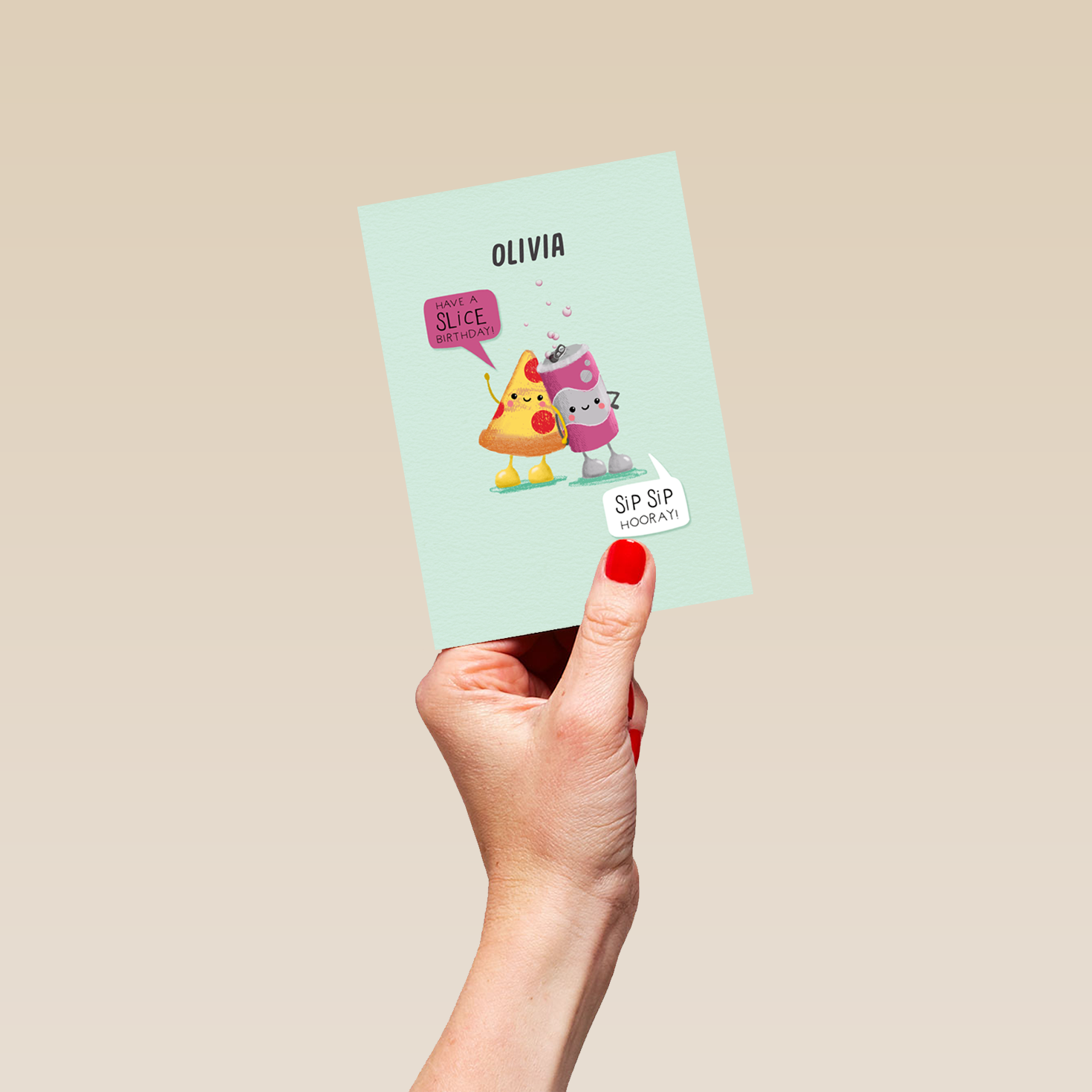 Celebrate their special day with the ultimate birthday combo of Pizza and Pop! This super-cute, personalised card is a great way to join in the fun and make them smile.