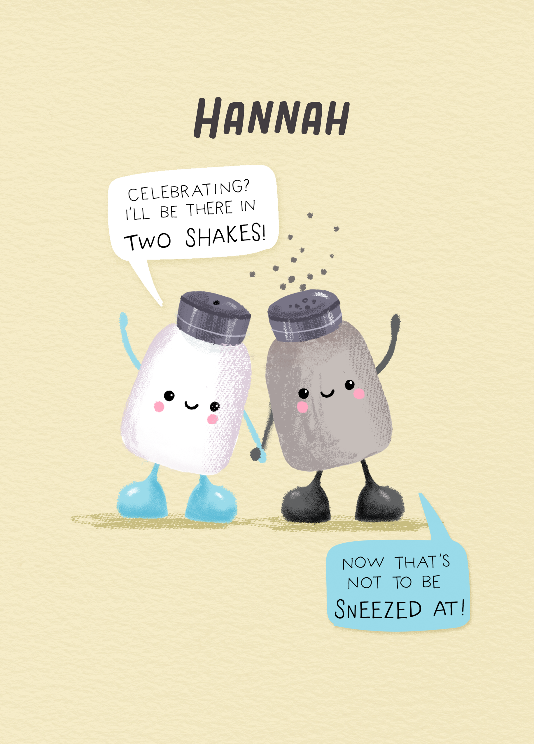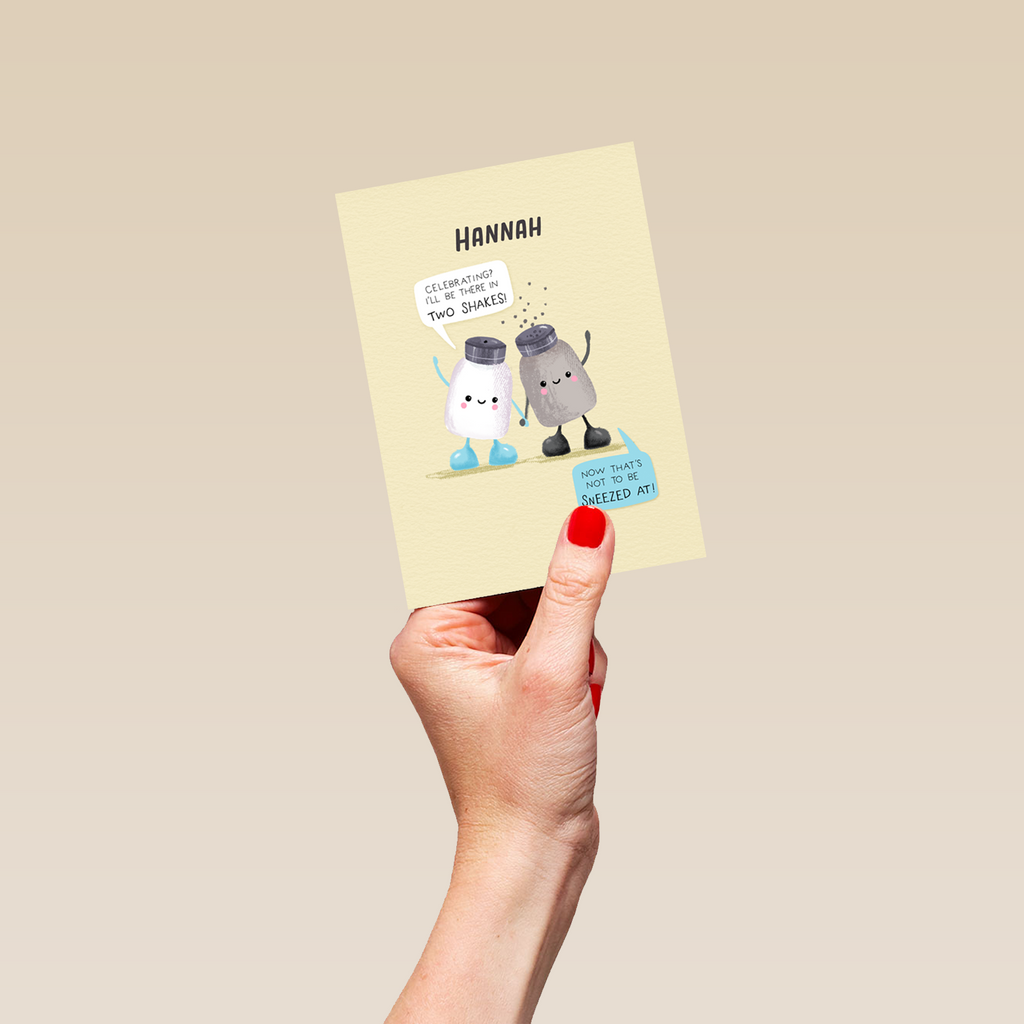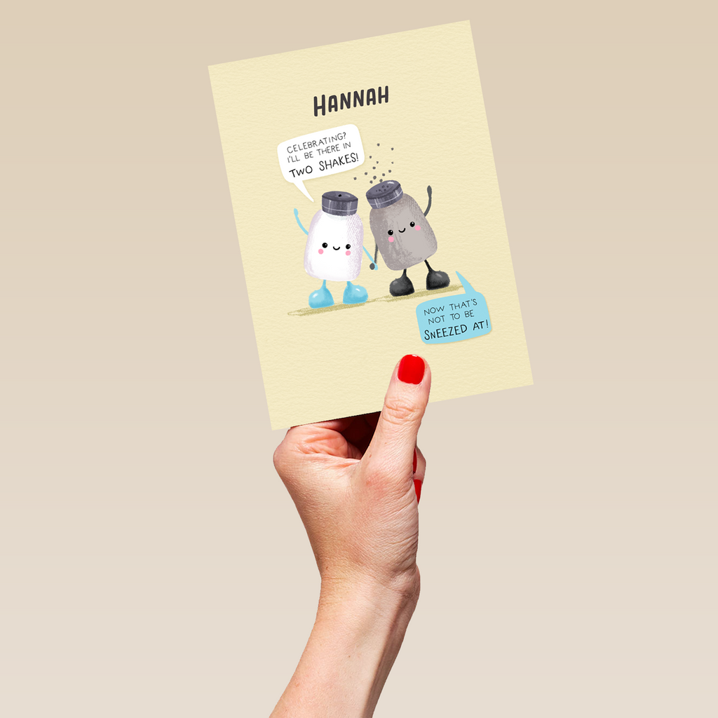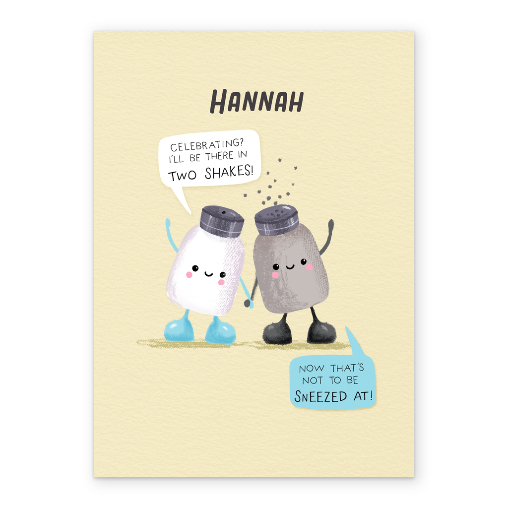 Printed on premium-quality board, this card features a beige background with a super-cute illustration of a salt and pepper shaker holding hands and waving, with speech bubbles coming from each of them , with the message '[NAME] Celebrating? I'll be there in two shakes! Now that's not to be sneezed at!', space to personalise a name, and comes complete with a co-ordinating white envelope.