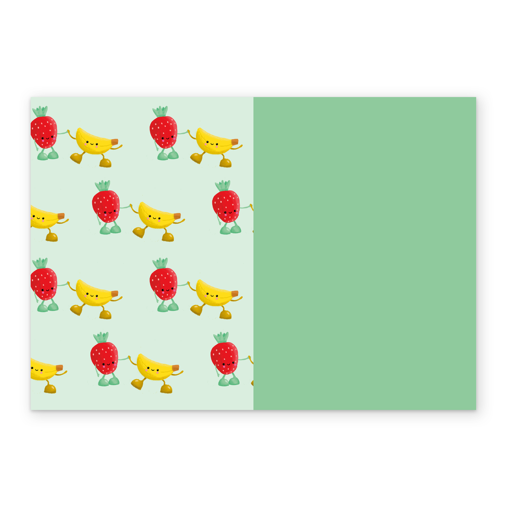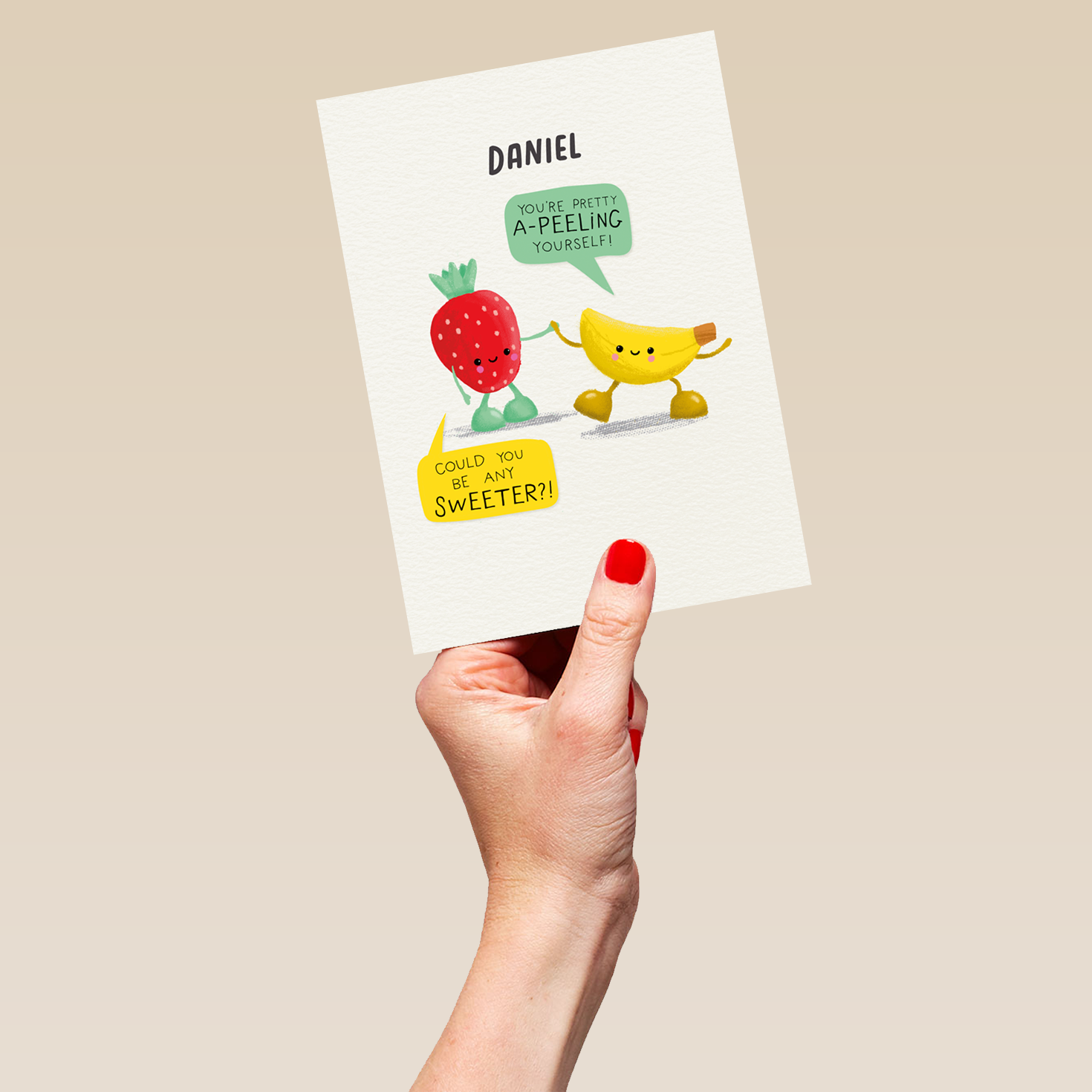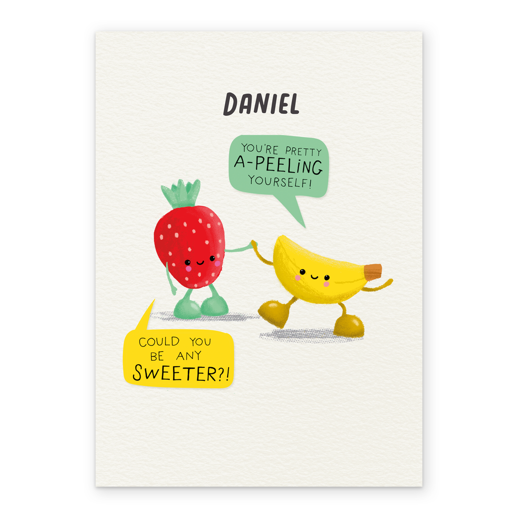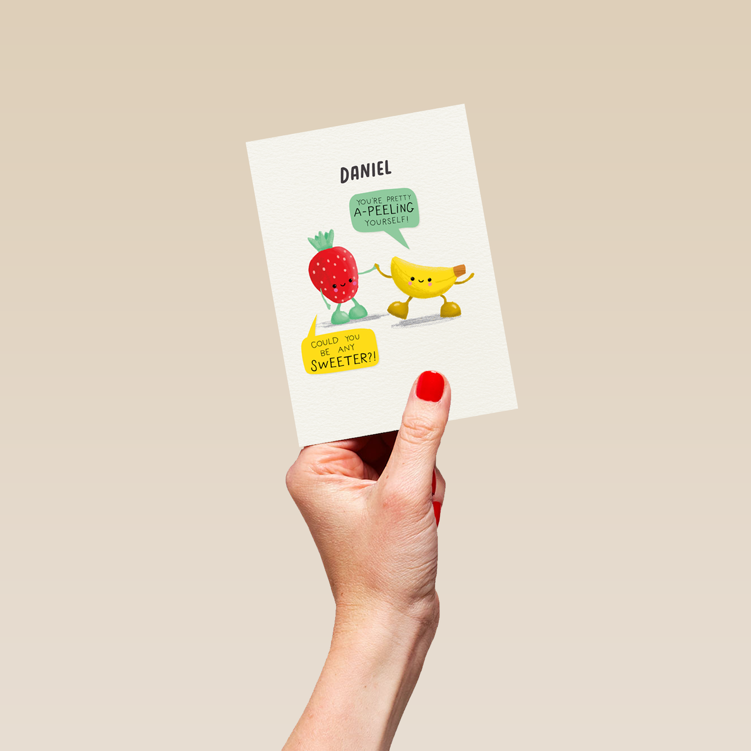 Printed on premium-quality board, this card features an off-white background with a cute illustration of a strawberry and a banana holding hands and speech bubbles coming from each character, with the message '[NAME] Could you be any sweeter?! You're pretty a-peeling yourself!', space to personalise a name, and comes complete with a co-ordinating white envelope.