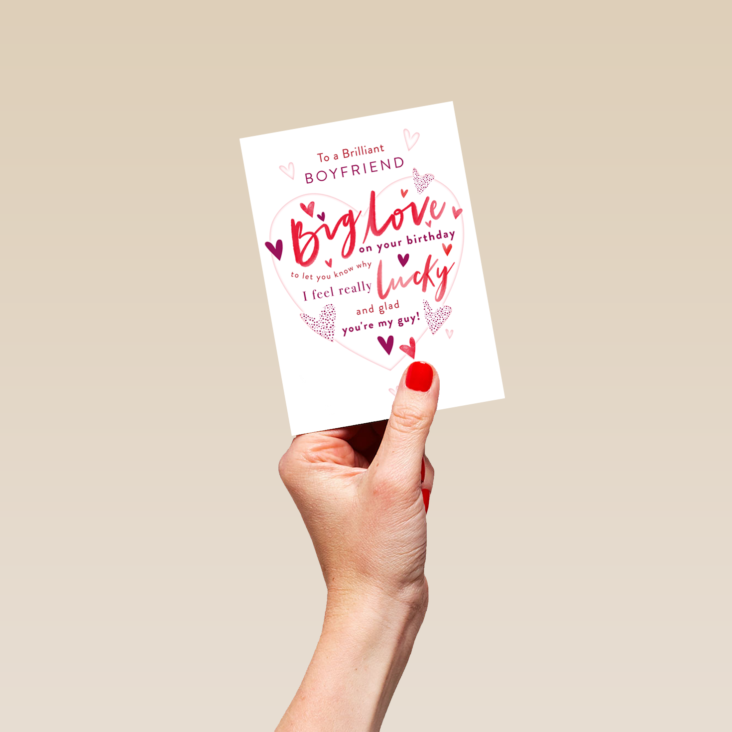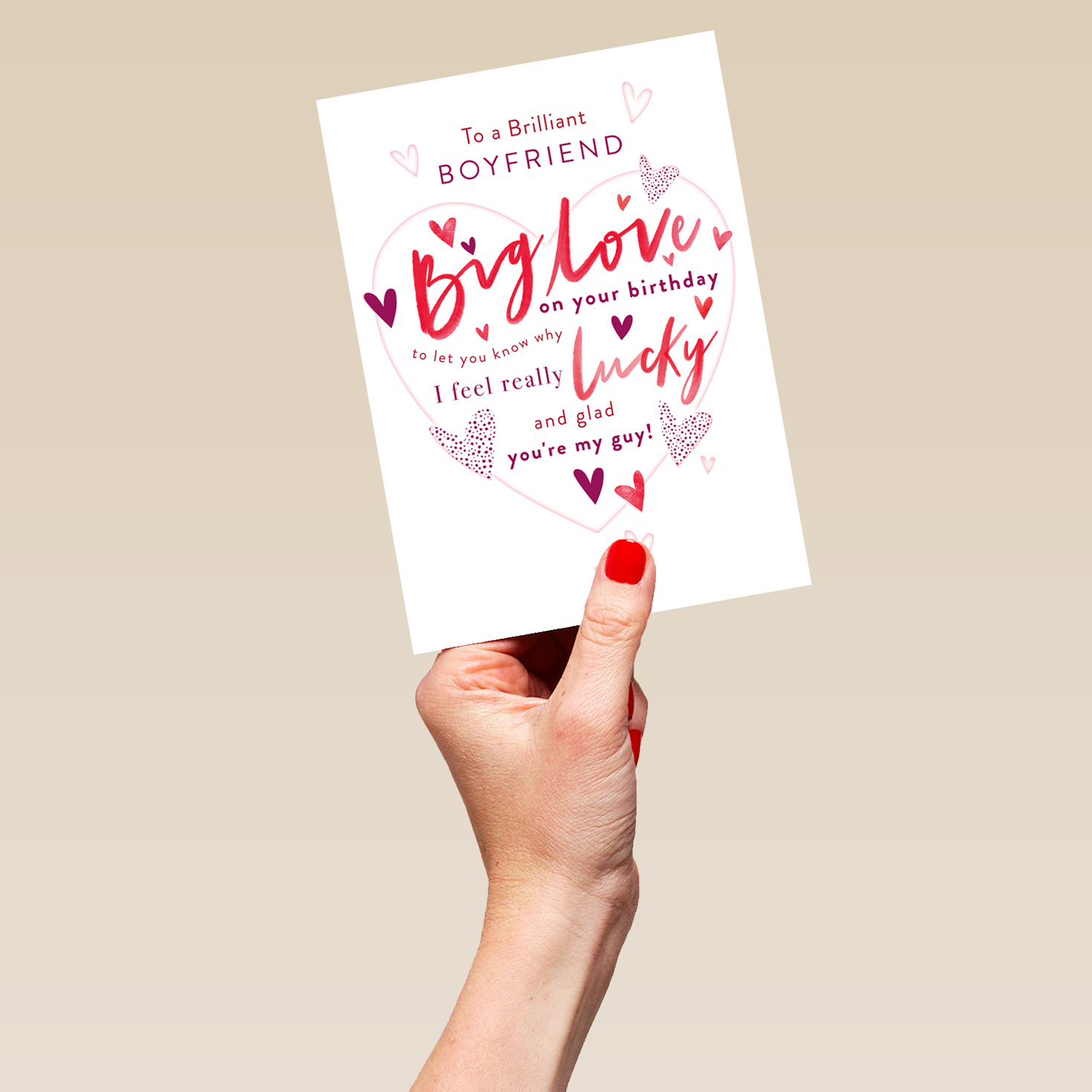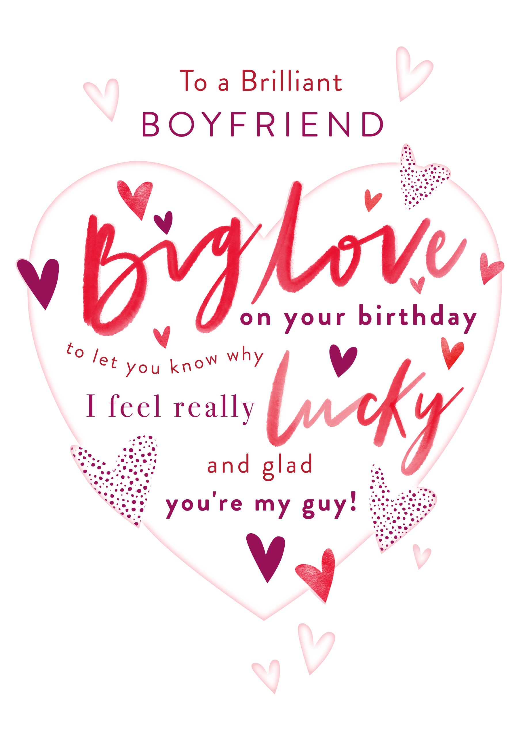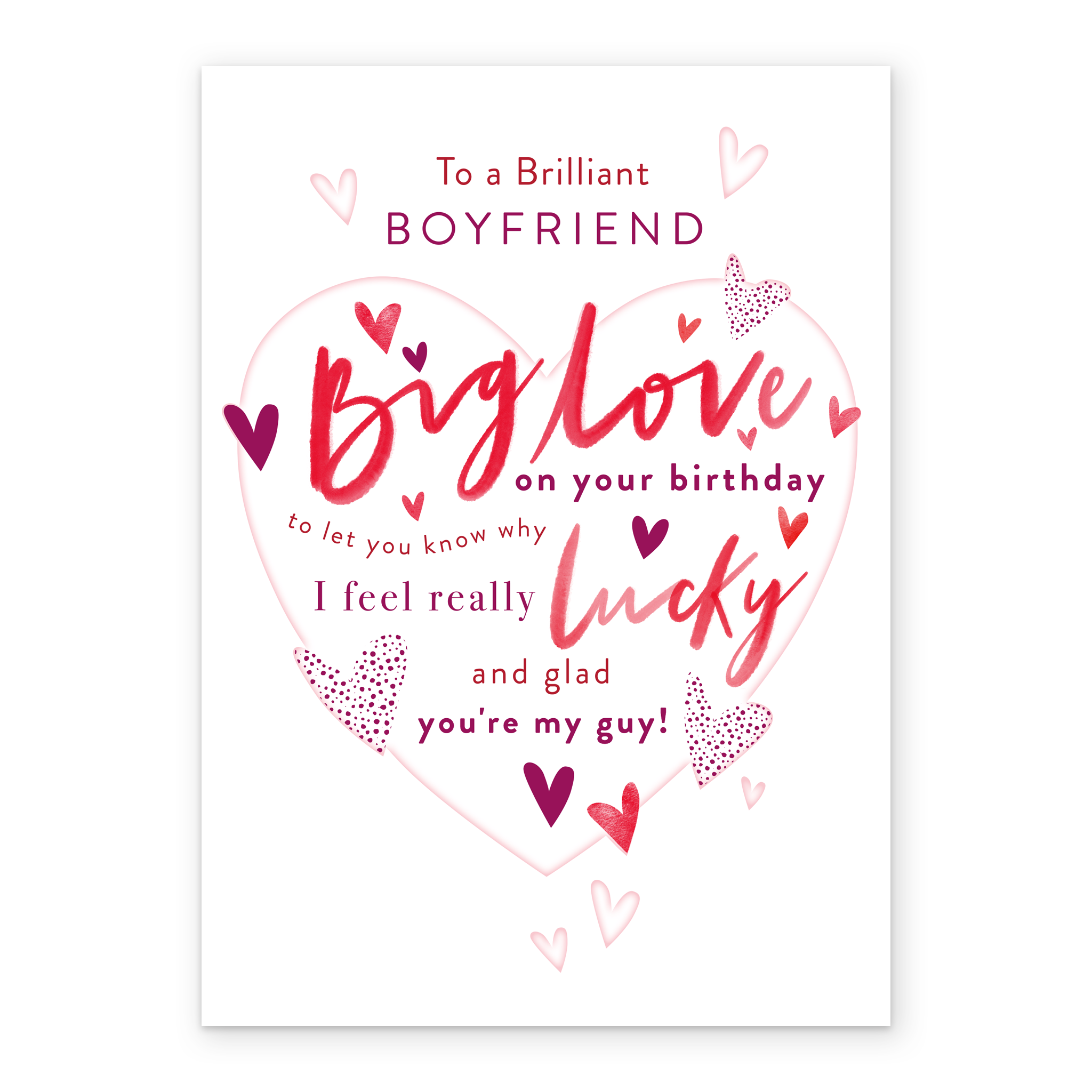 Printed on premium-quality board, this card features a white background with a large pink heart-shape, surrounded by smaller heart shapes, with red and burgundy lettering above and filled with burgundy, red and purple lettering, with the message 'TO A BRILLIANT BOYFRIEND. BIG LOVE on your birthday to let you know why I feel really LUCKY and glad you're my guy!', and comes complete with a co-ordinating white envelope.