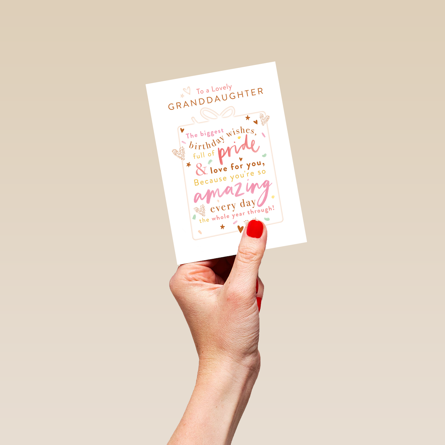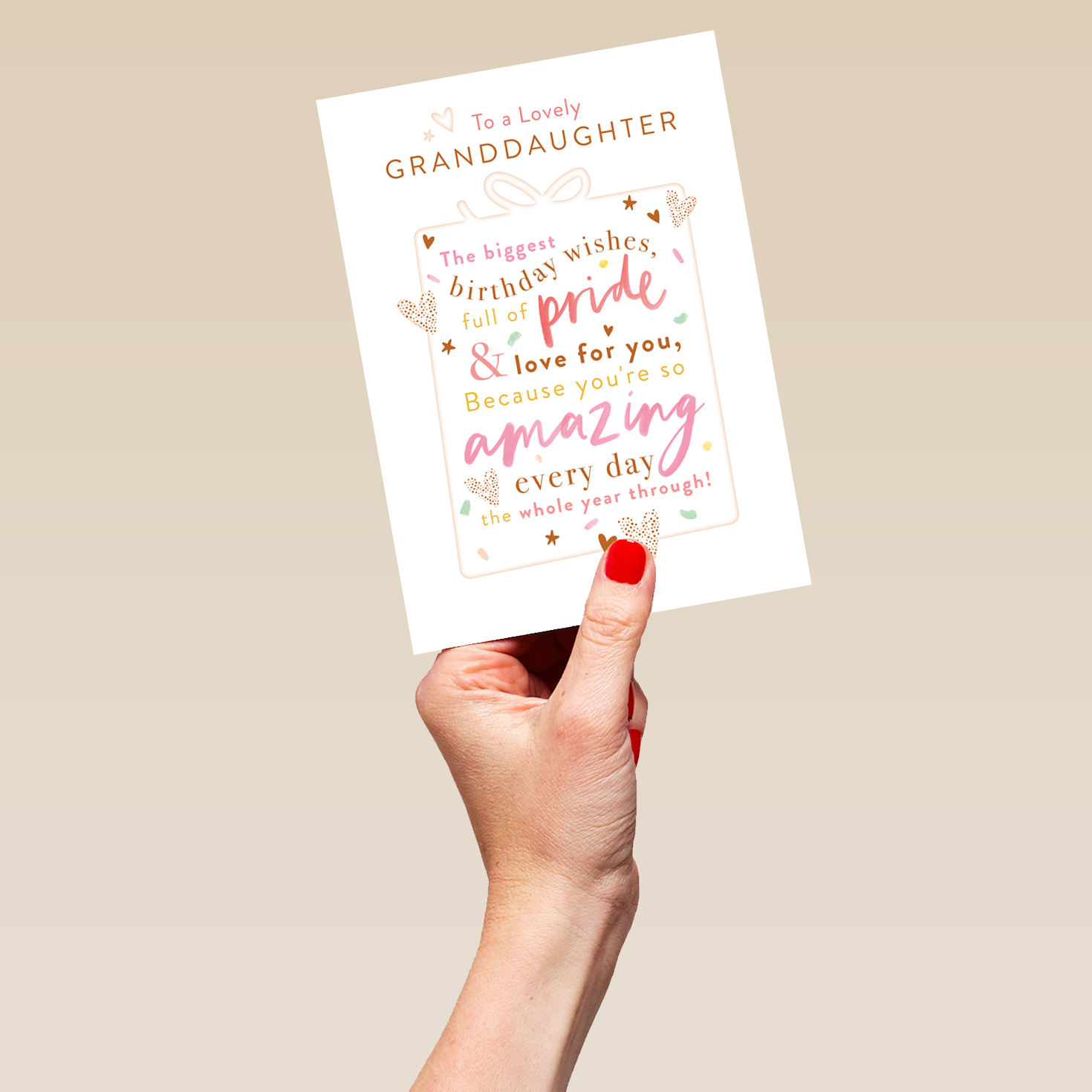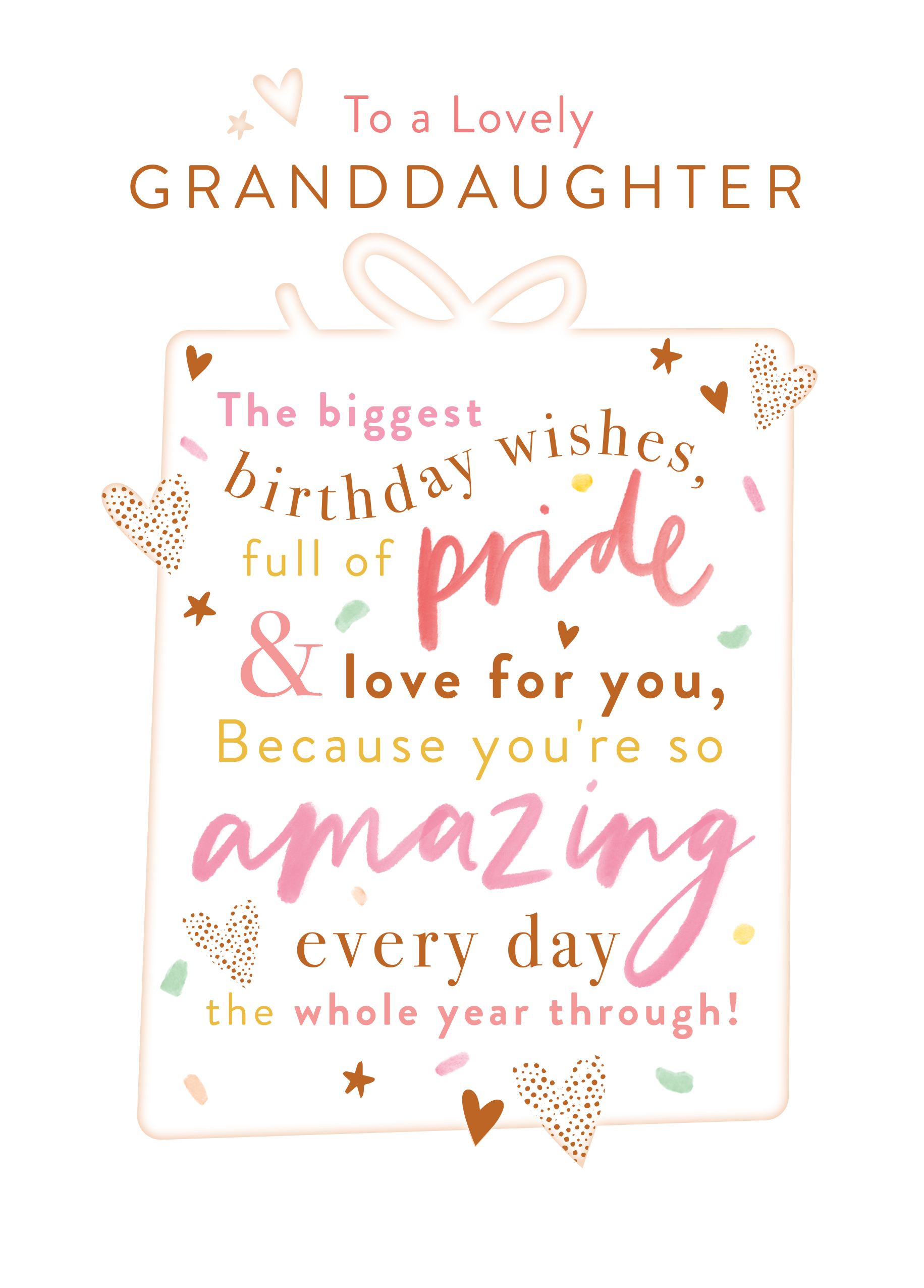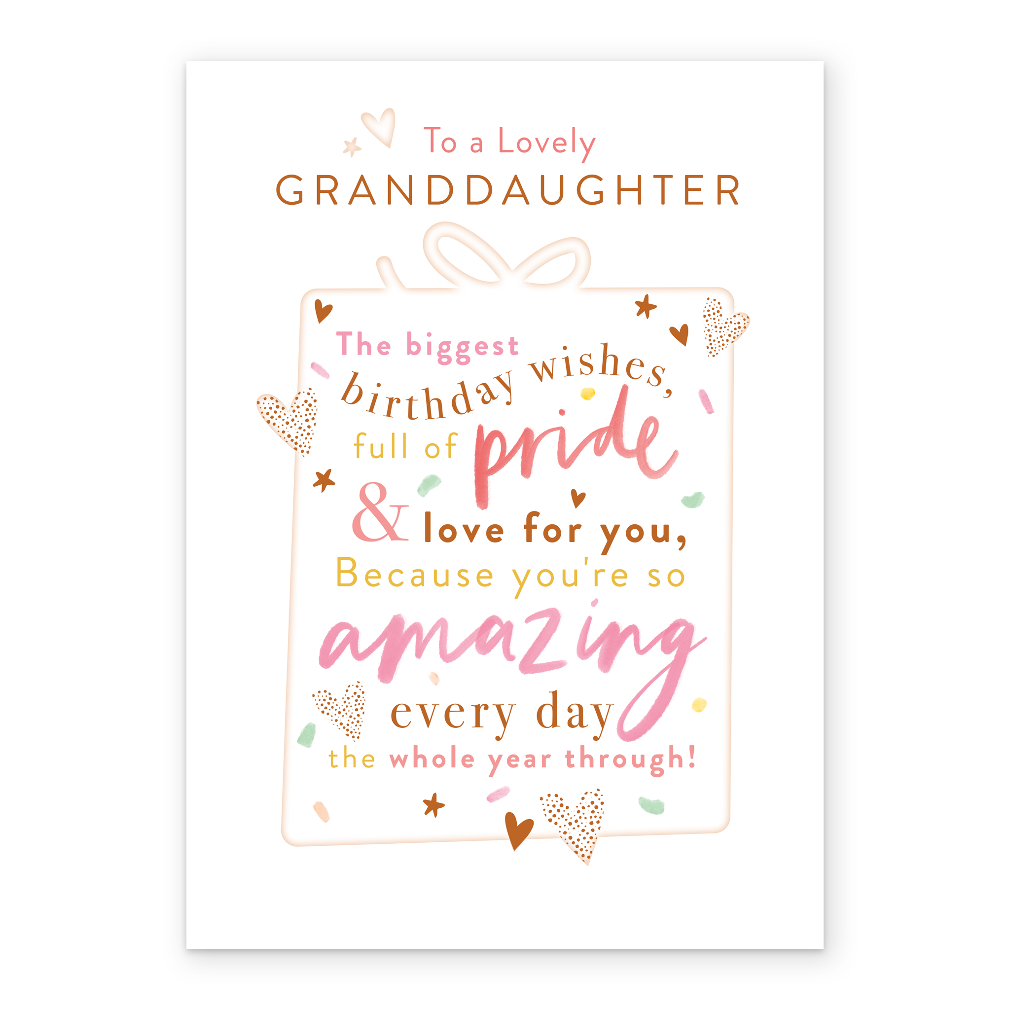 Printed on premium-quality board, this card features a white background with an outline illustration of a gift, surrounded by small heart shapes, with pink and tan lettering above and filled with gold, pink and tan lettering, with the message 'TO A LOVELY GRANDDAUGHTER. The biggest birthday wishes, full of PRIDE & love for you, Because you're so AMAZING every day the whole year through!', and comes complete with a co-ordinating white envelope.