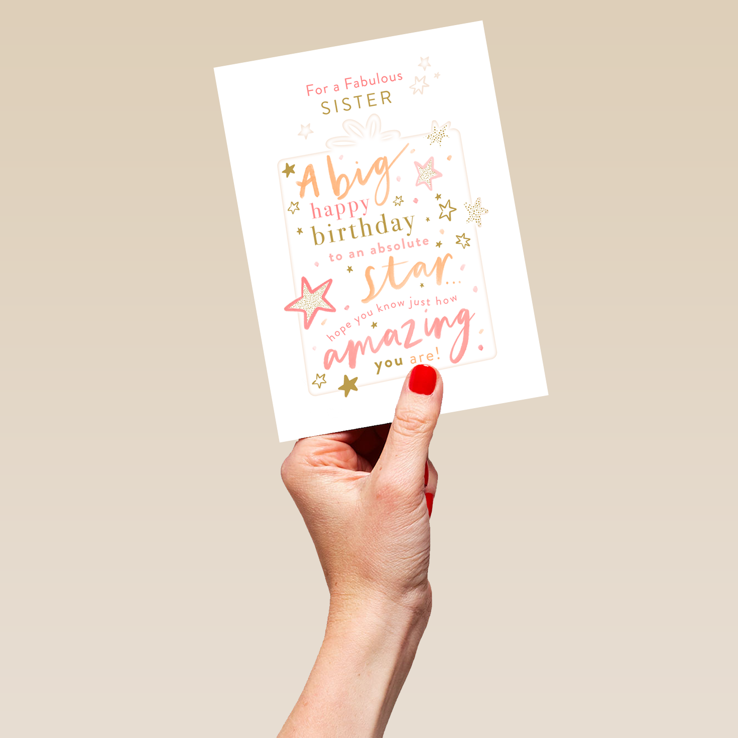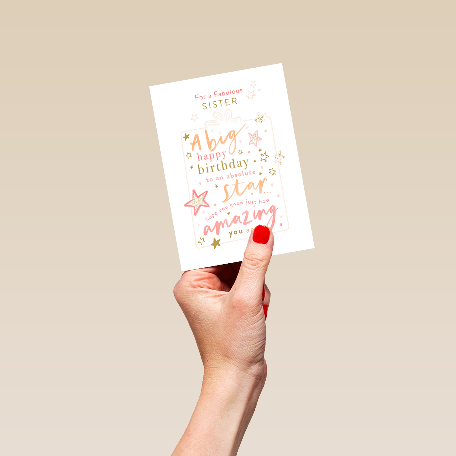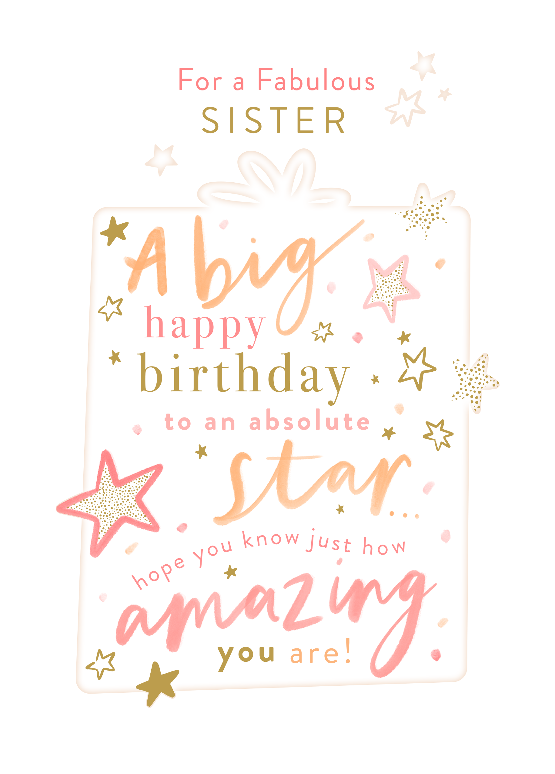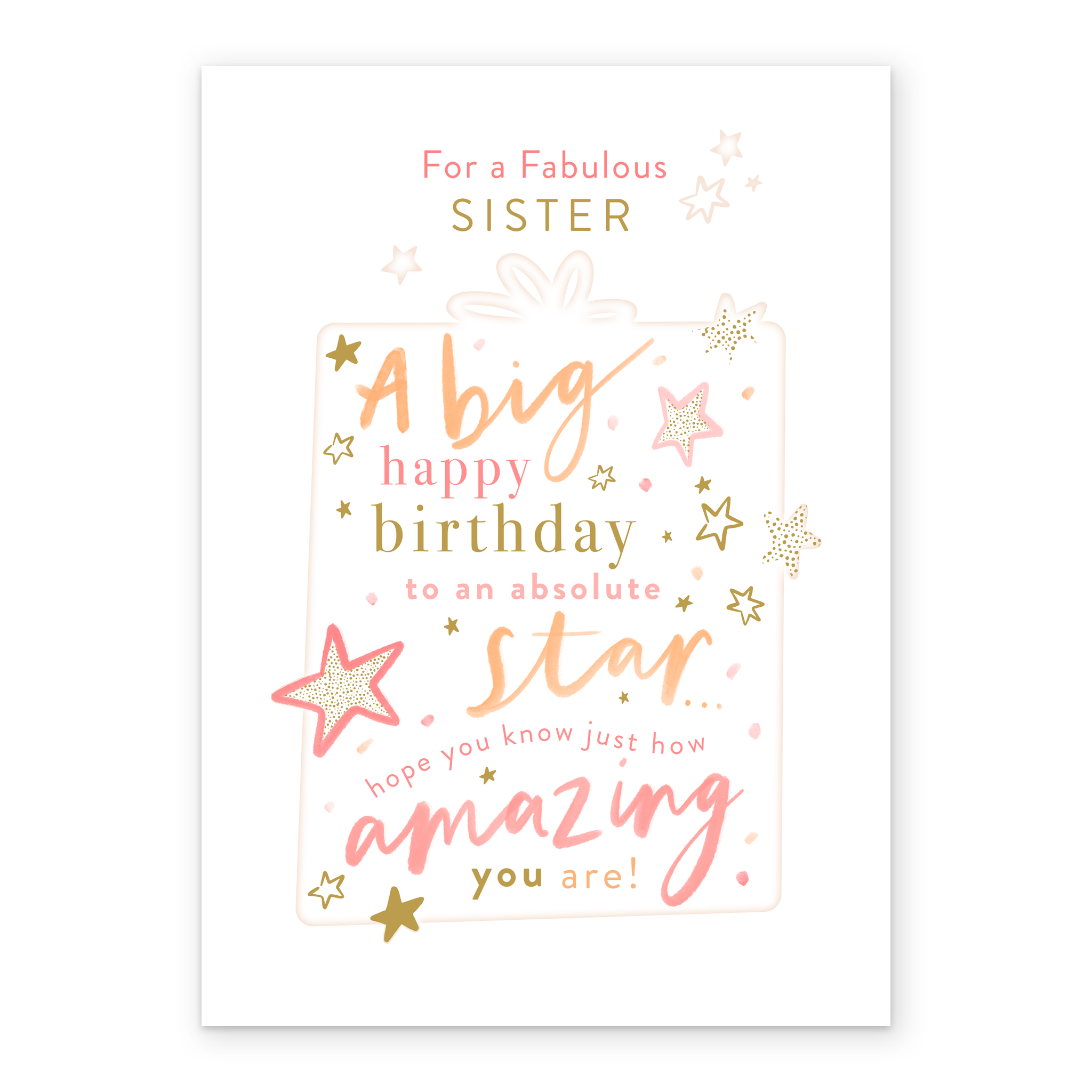 Printed on premium-quality board, this card features a white background with an outline illustration of a gift, surrounded by small star shapes, with pink and gold lettering above and filled with peach, pink and gold lettering, with the message 'For a Fabulous SISTER. A BIG happy birthday to an absolute STAR... hope you know just how AMAZING you are!', and comes complete with a co-ordinating white envelope.