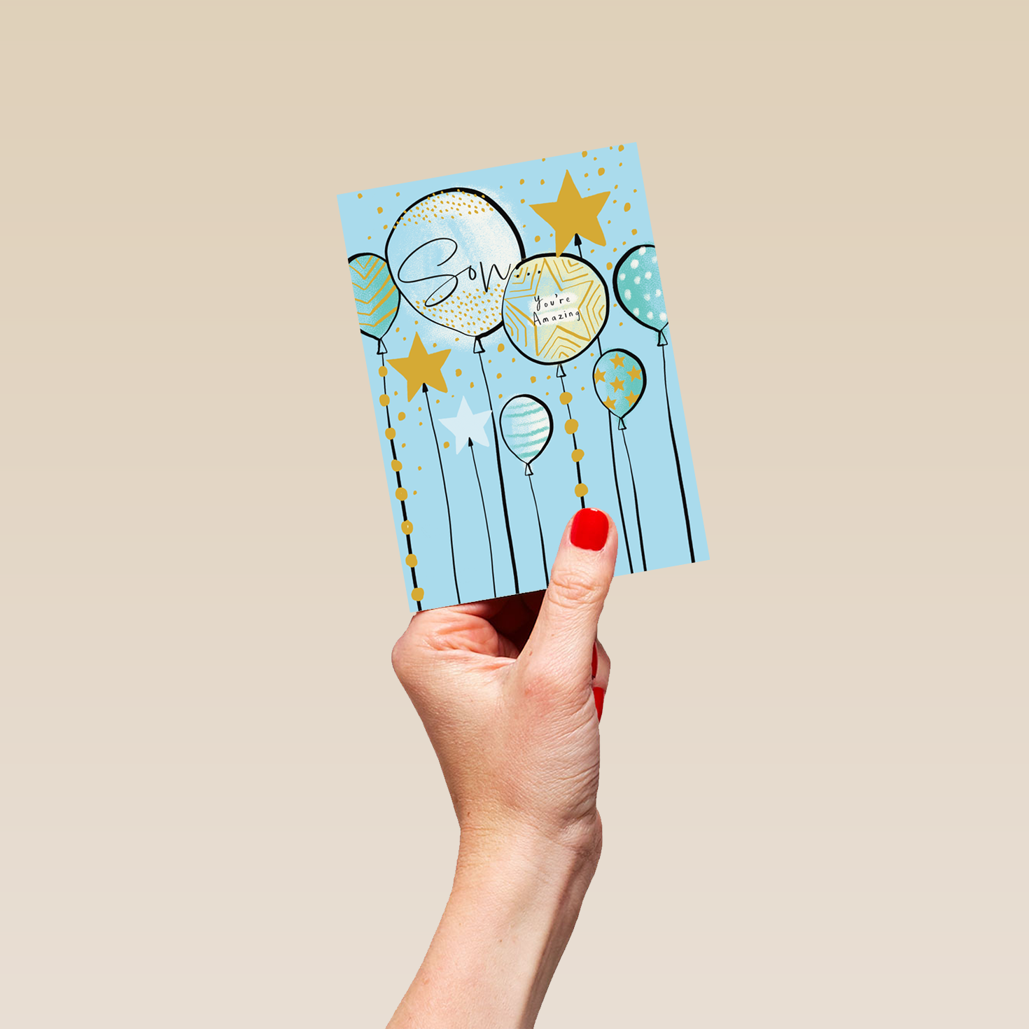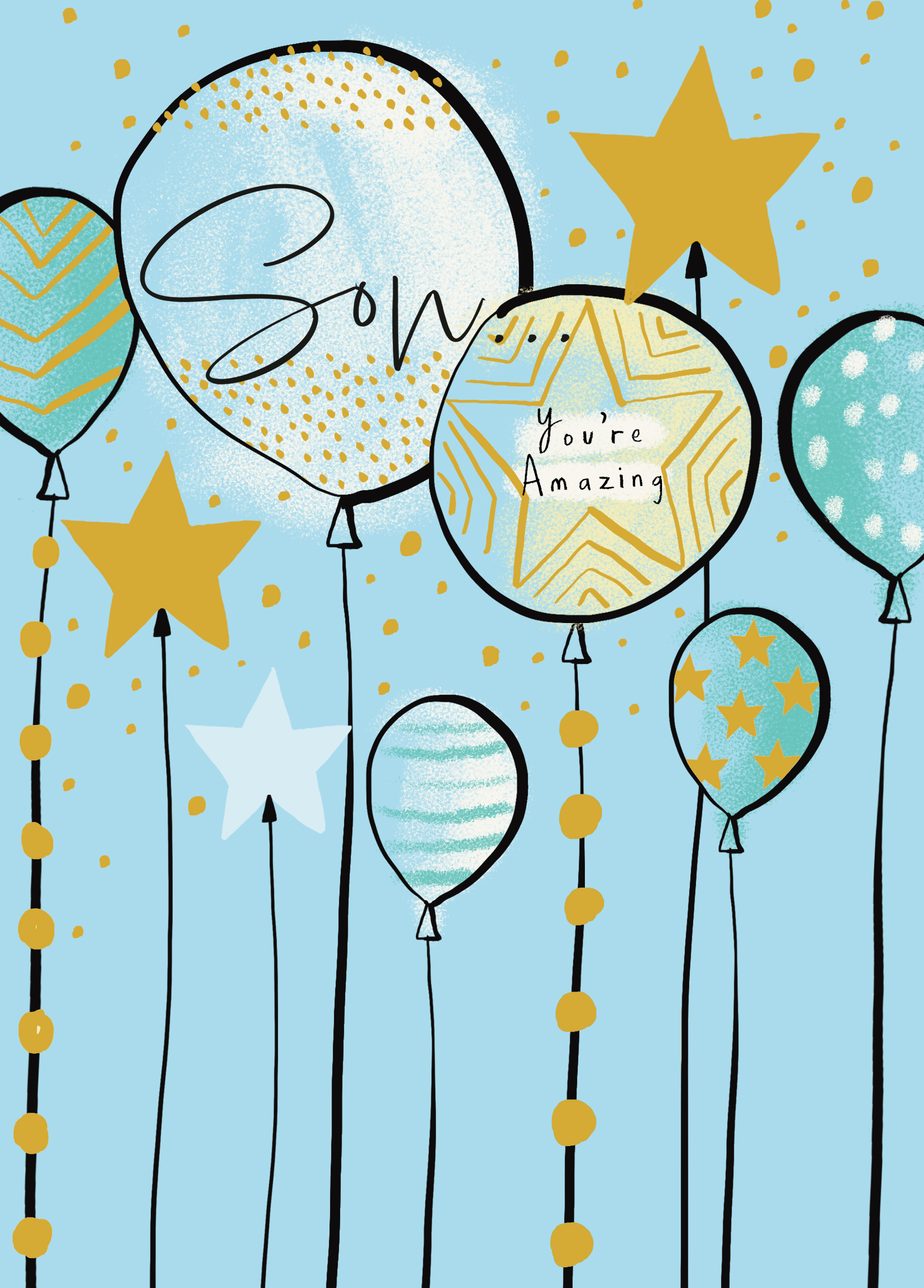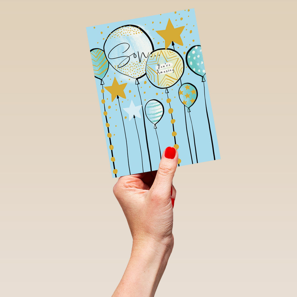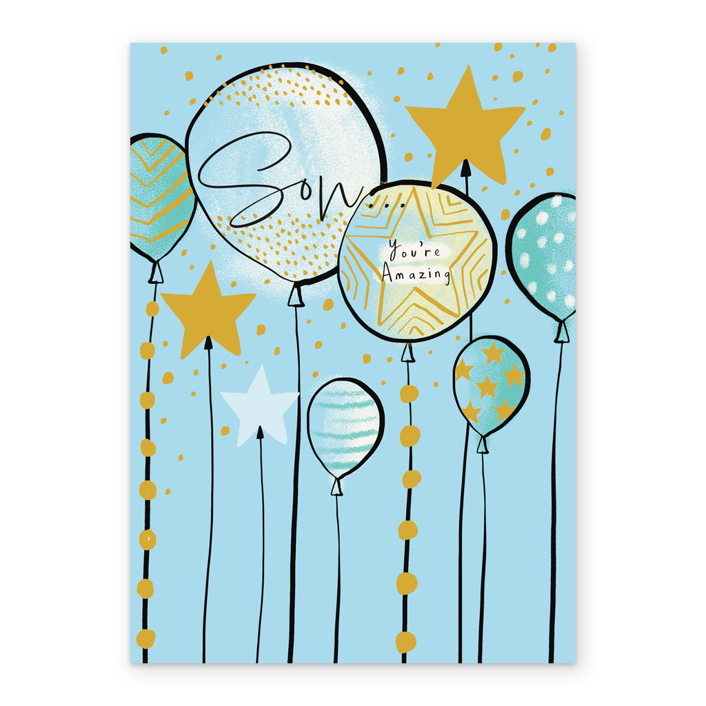 Printed on premium-quality board, this card features a blue background with balloons and stars, with the message 'Son... You're Amazing', and comes complete with a co-ordinating white envelope.