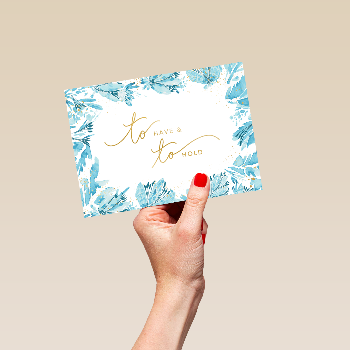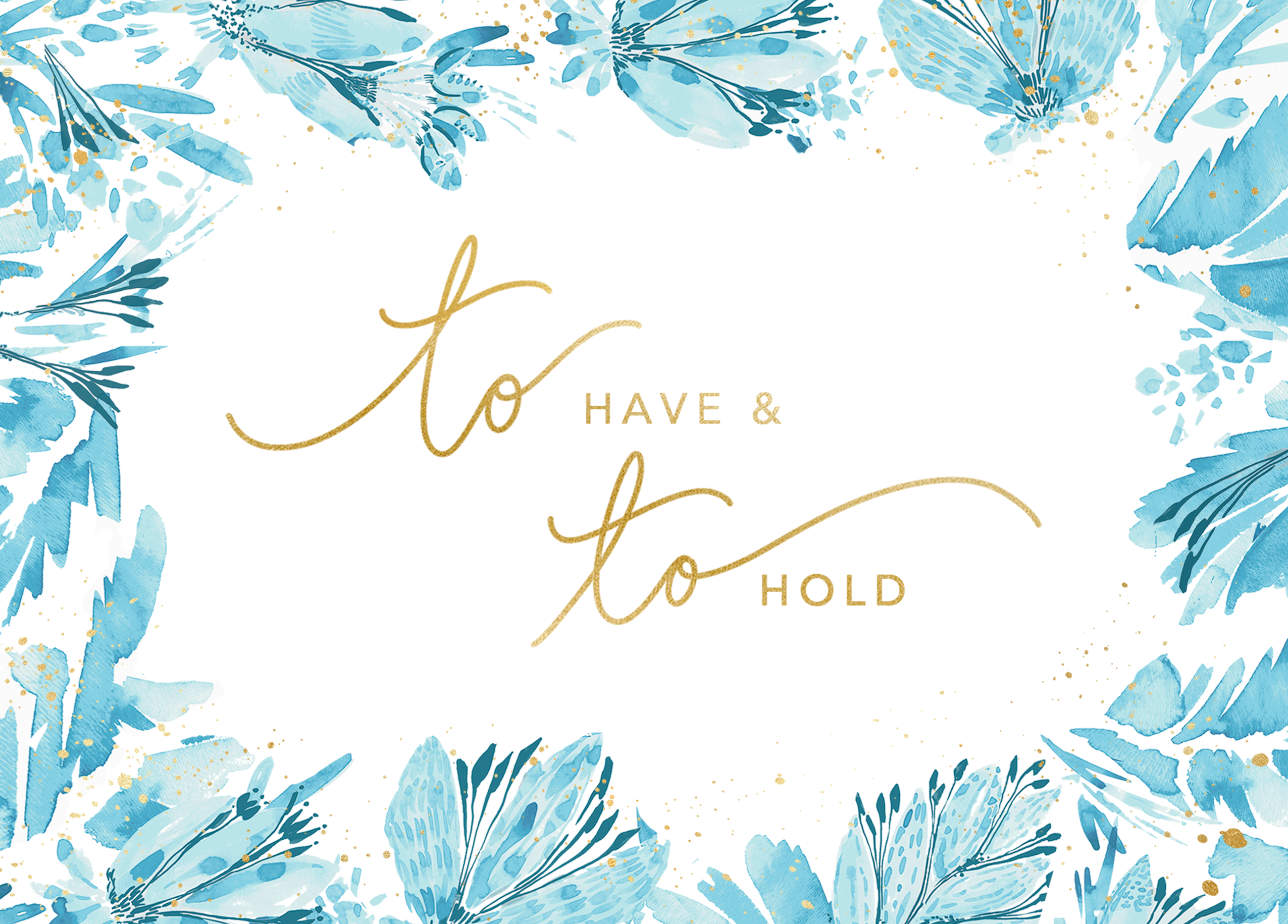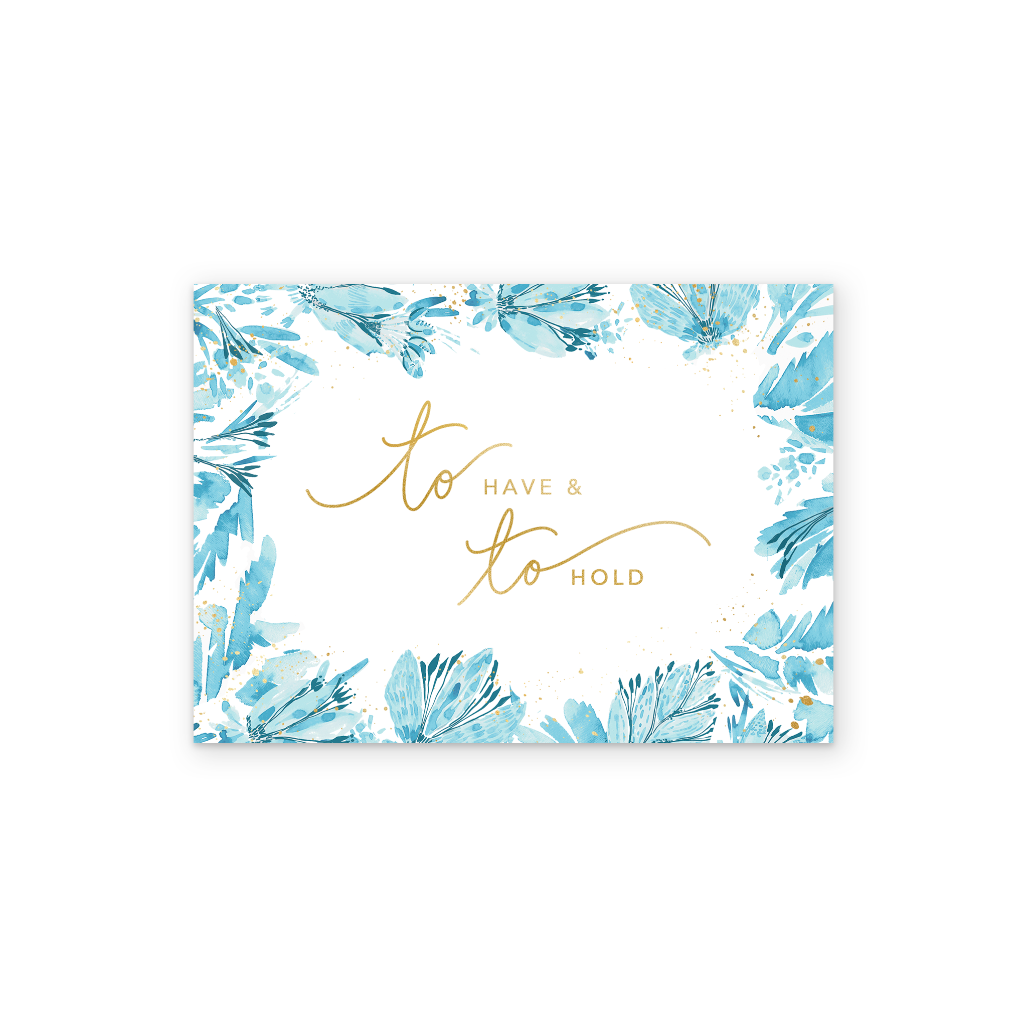 Printed on premium-quality board, this card features vibrant blue and turquoise leaves and flowers forming a border around a white central panel containing gold lettering, with the message 'To have & to hold', and comes complete with a co-ordinating white envelope.