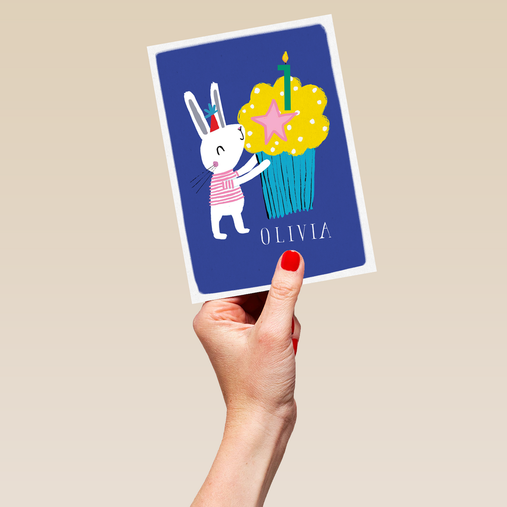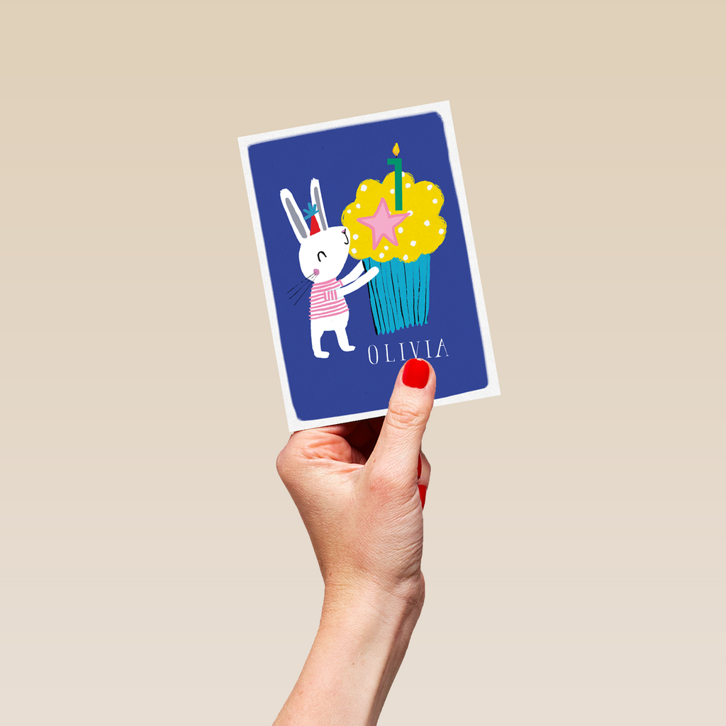 Printed on premium-quality board, this card features a cute illustrated white bunny rabbit and colourful cupcake, with editable green number candle, on a blue background, space to personalise a name and the age, and comes complete with a co-ordinating white envelope.