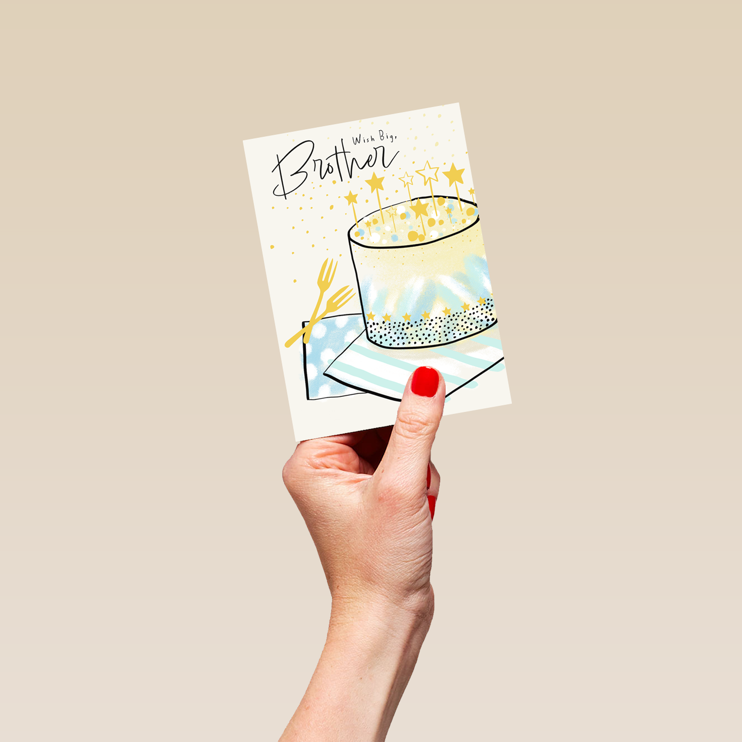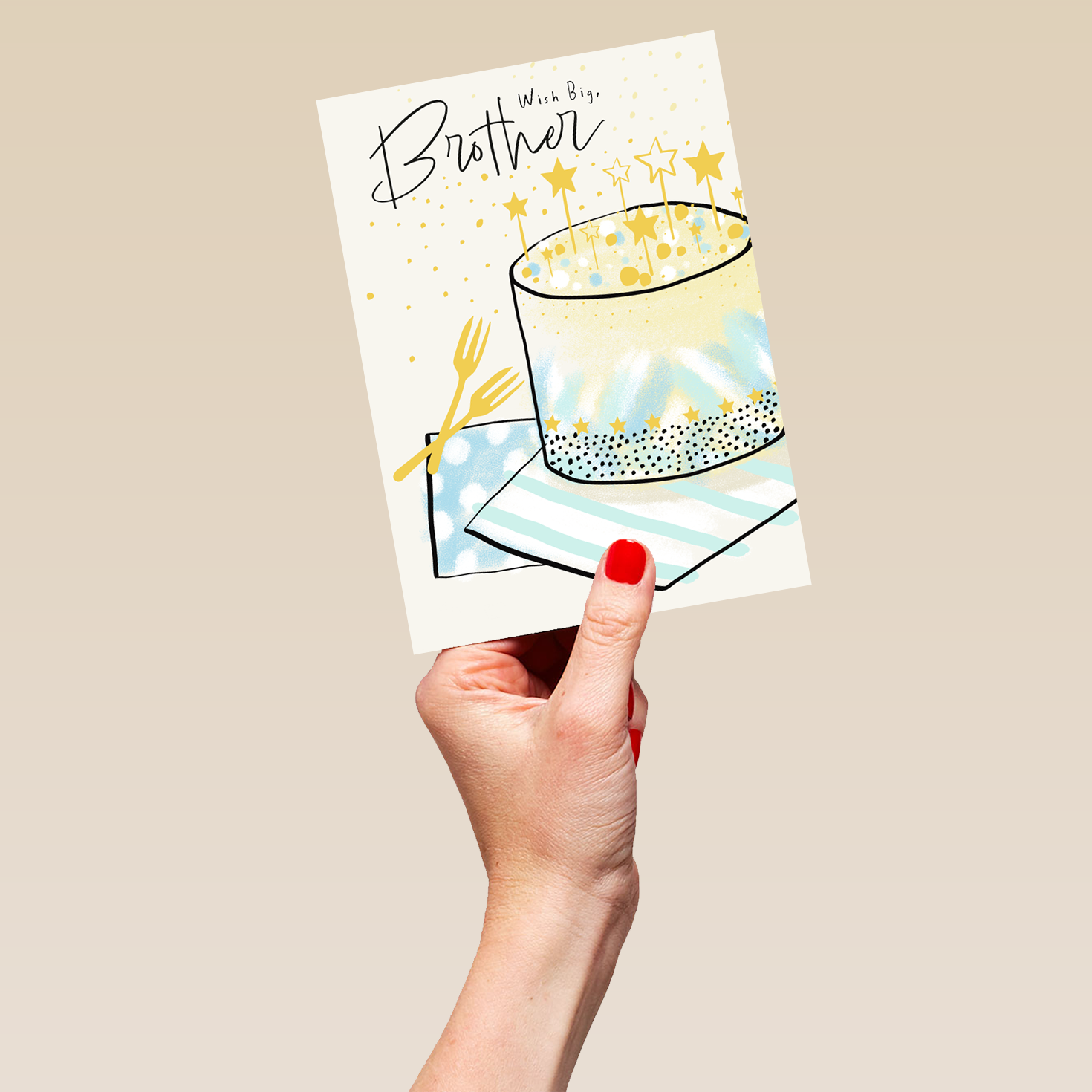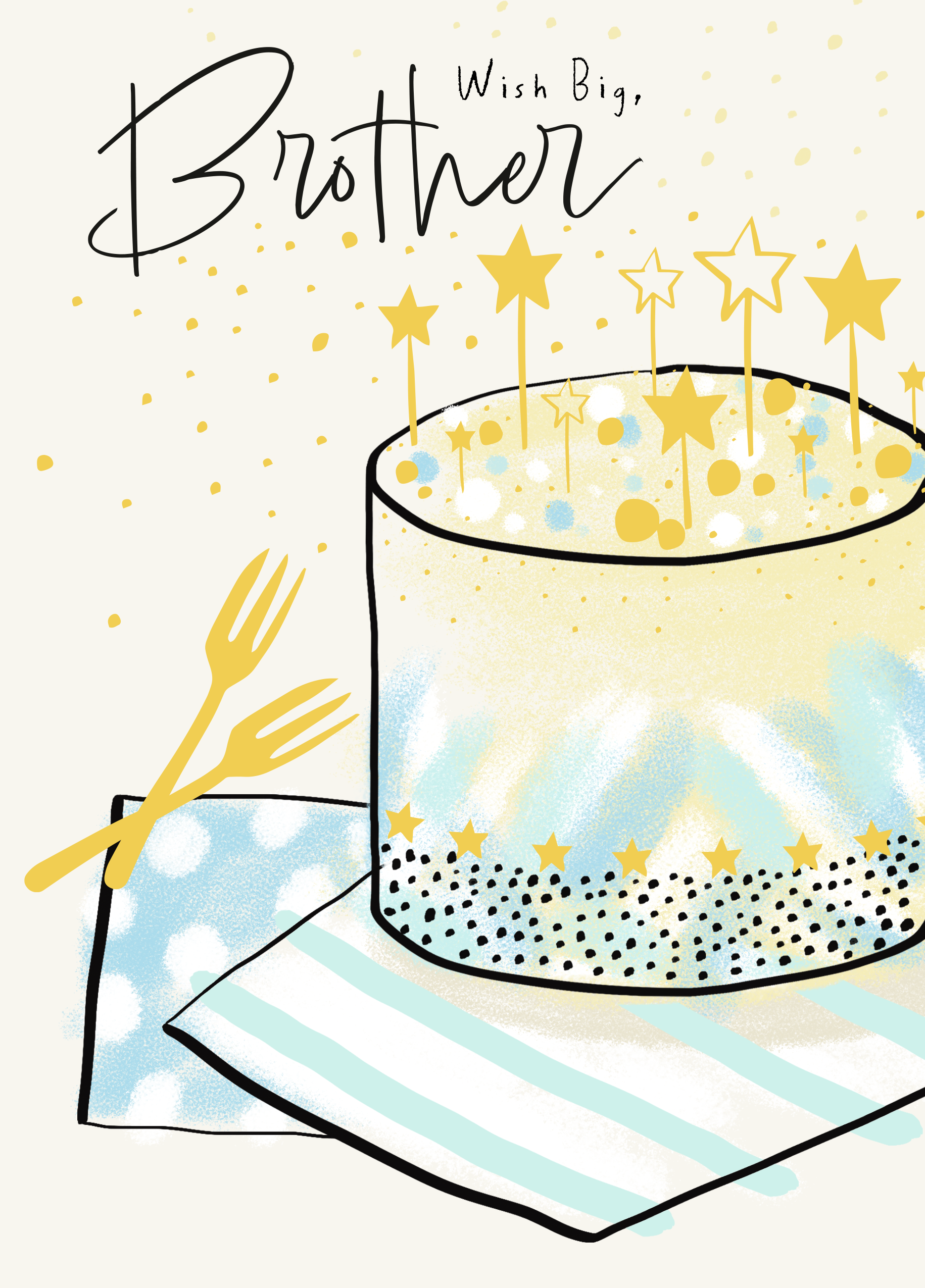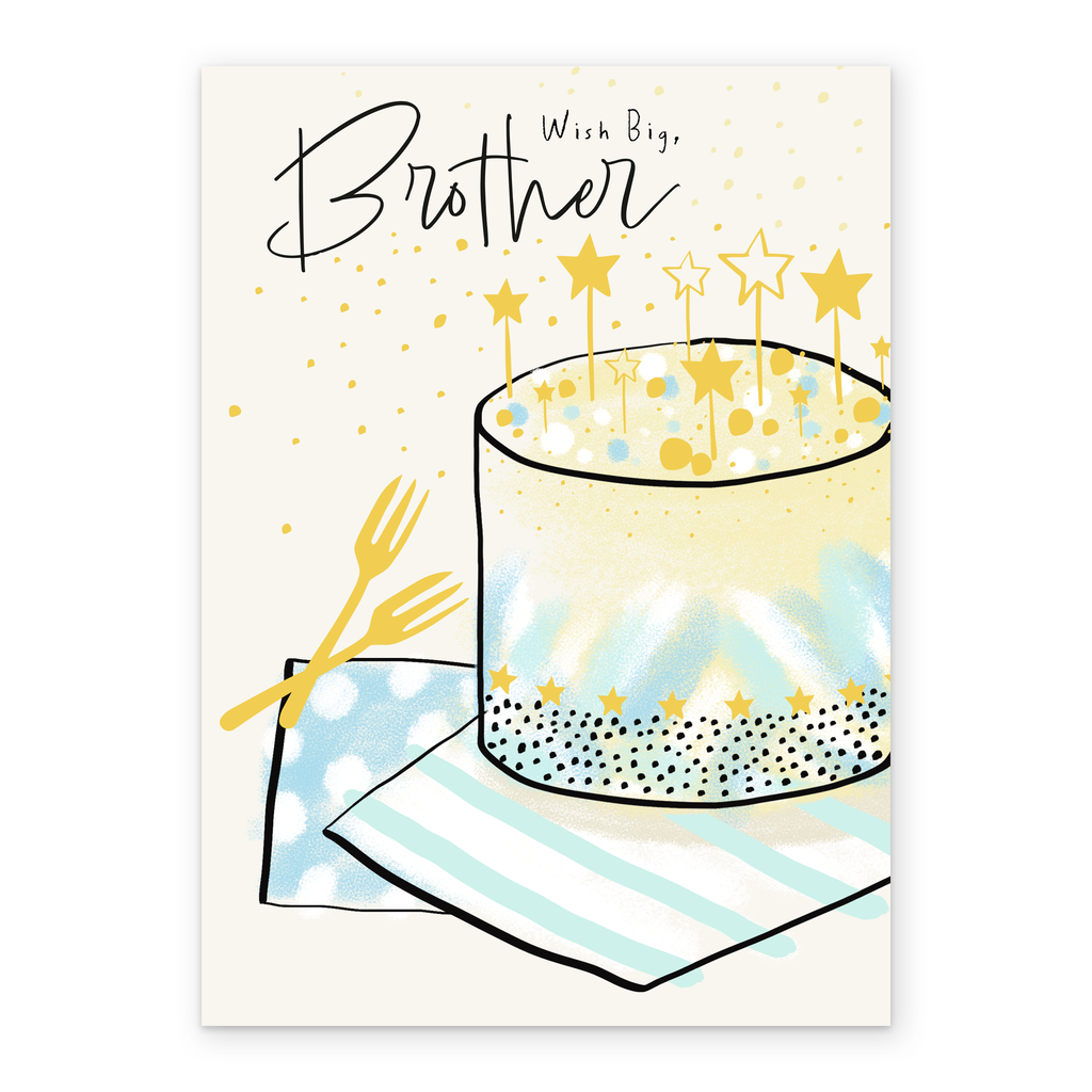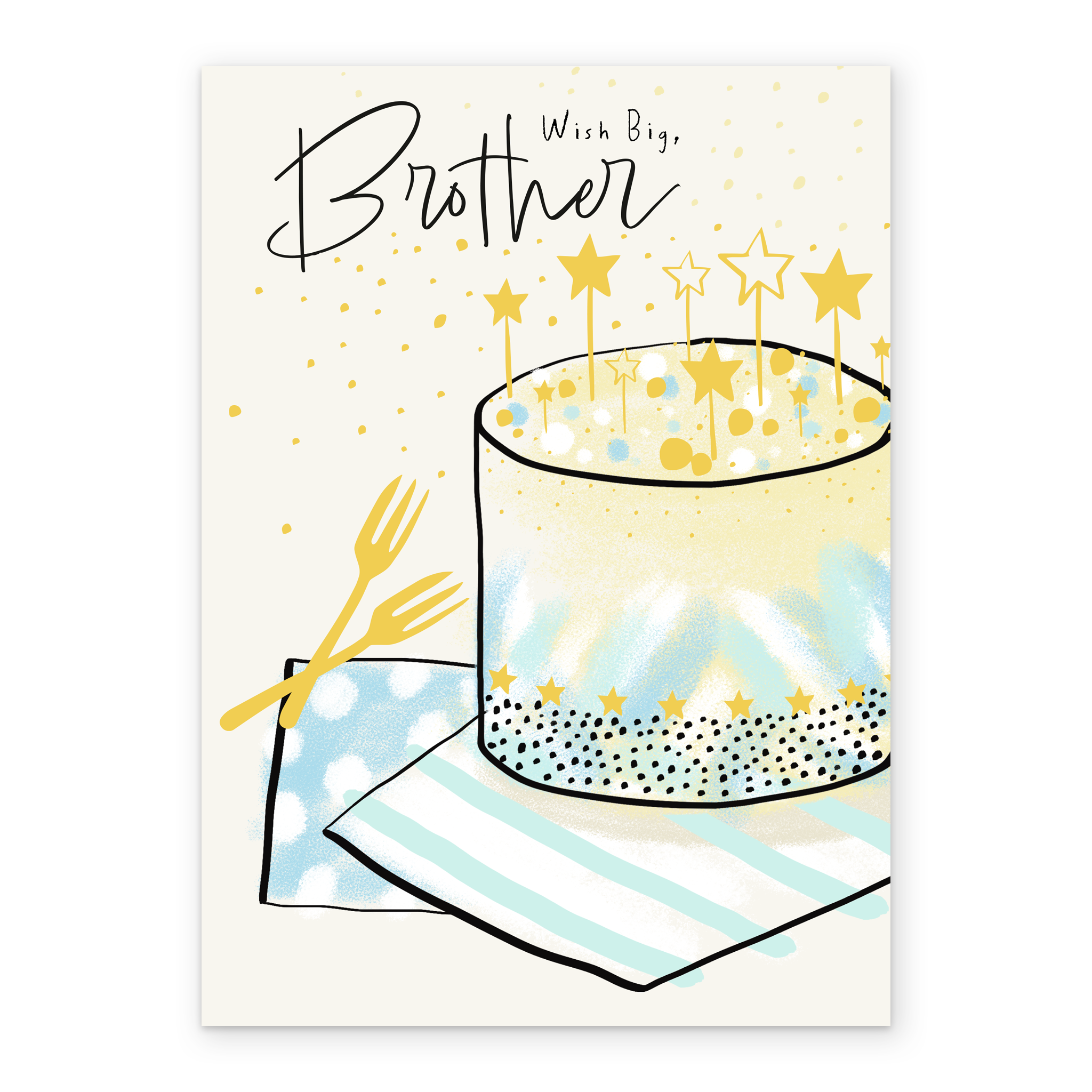Printed on premium-quality board, this card features a Birthday cake with stars, with the message 'Wish Big, Brother', and comes complete with a co-ordinating white envelope.
