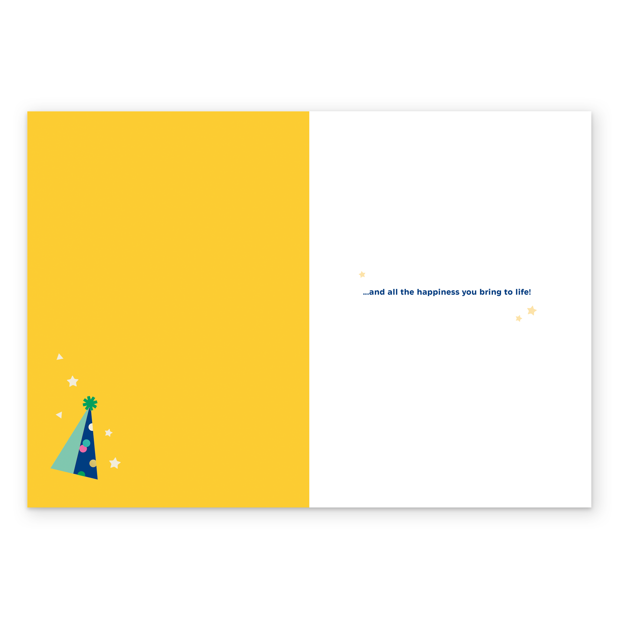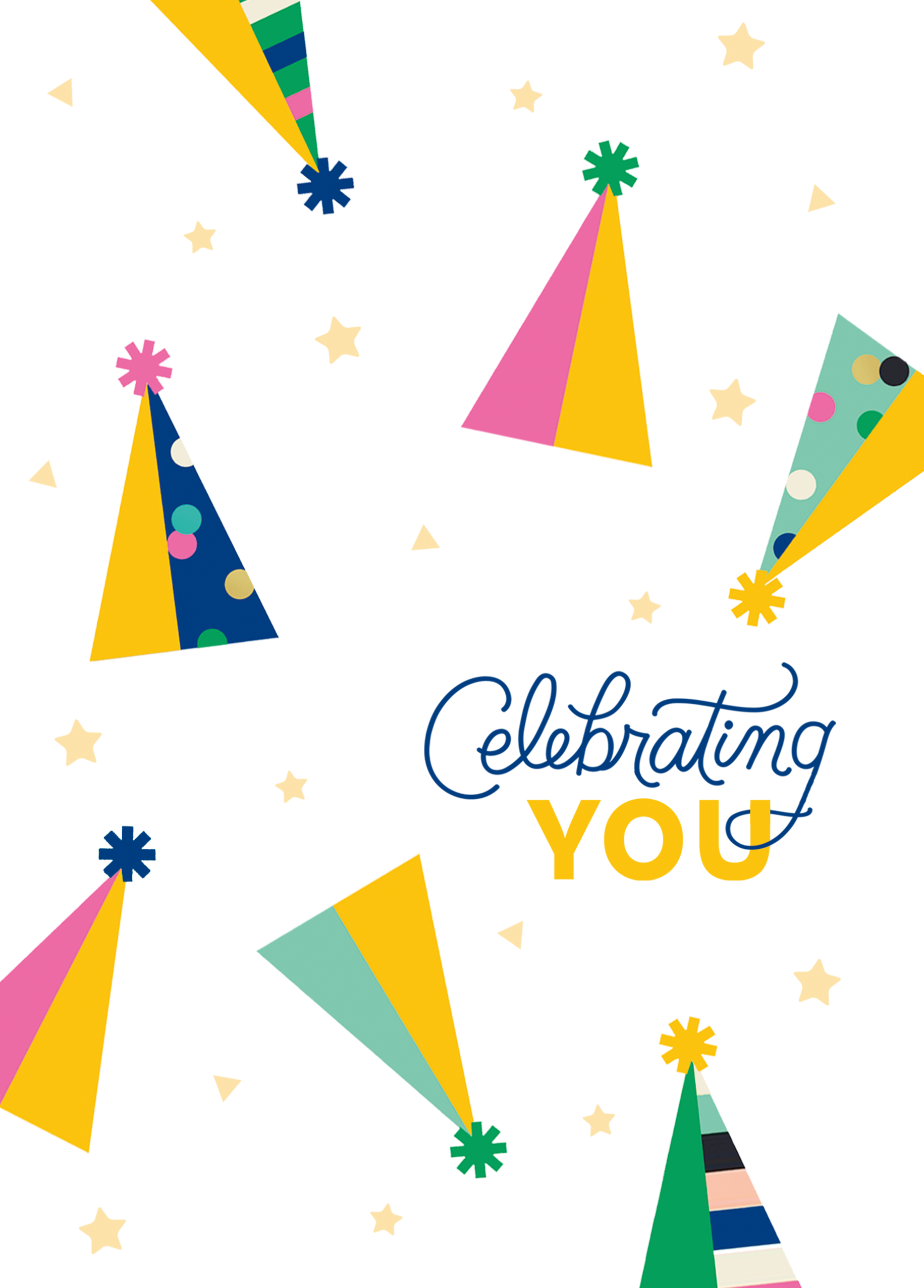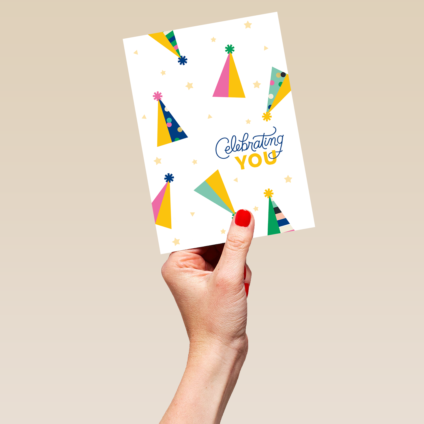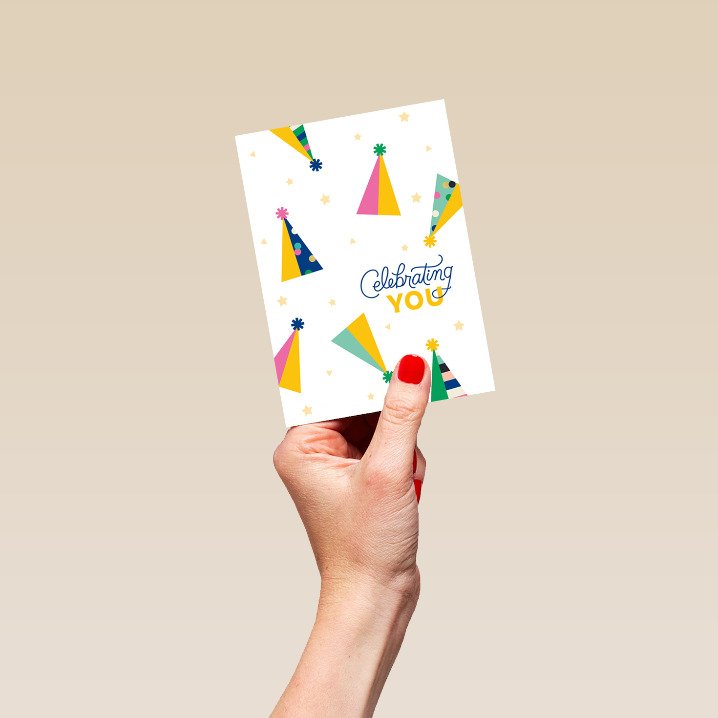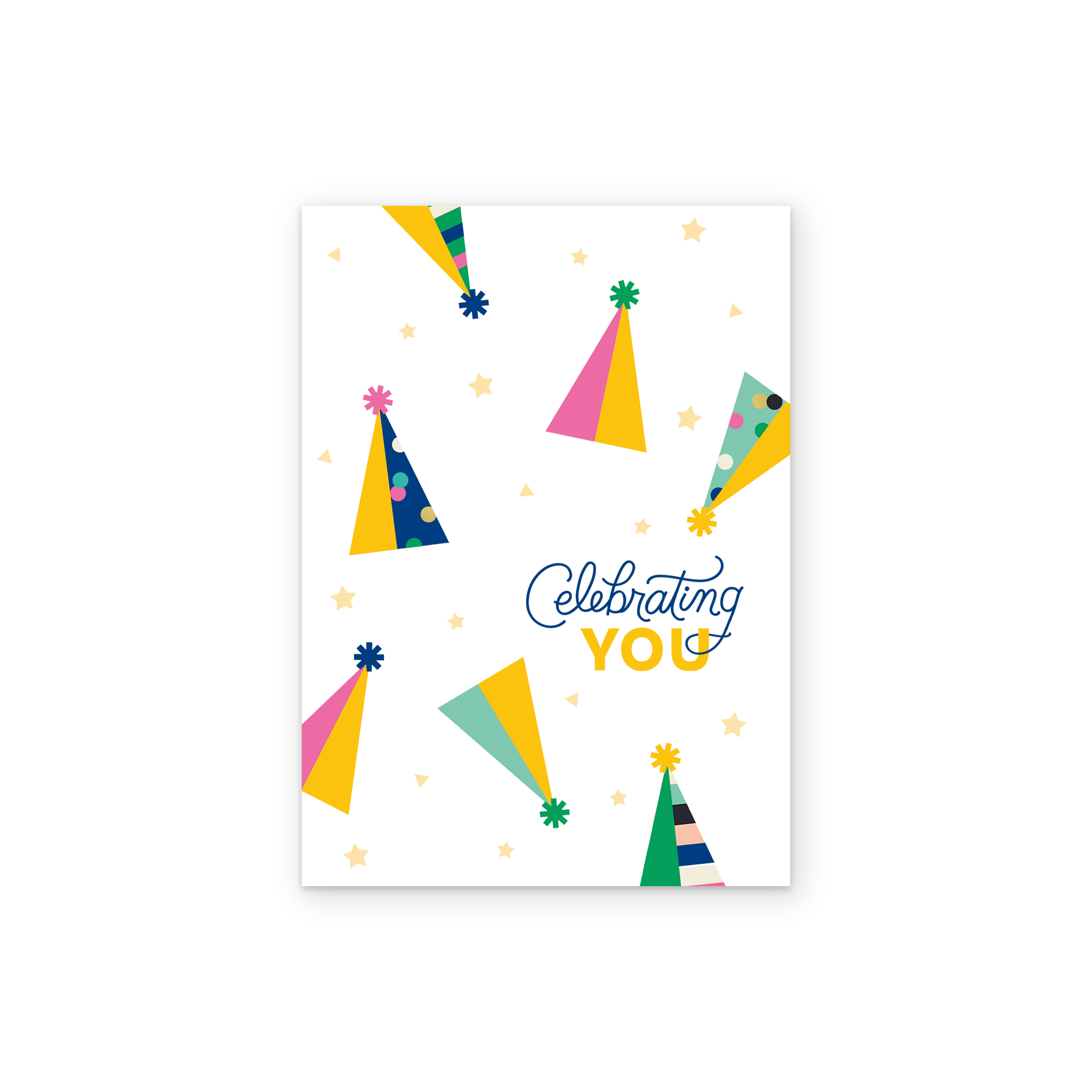 Printed on premium-quality board, this card features a fun design of colourful, illustrated party hats set against a plain white background dotted with tiny yellow stars alongside blue and yellow lettering, with the message 'Celebrating you', and comes complete with a co-ordinating white envelope.