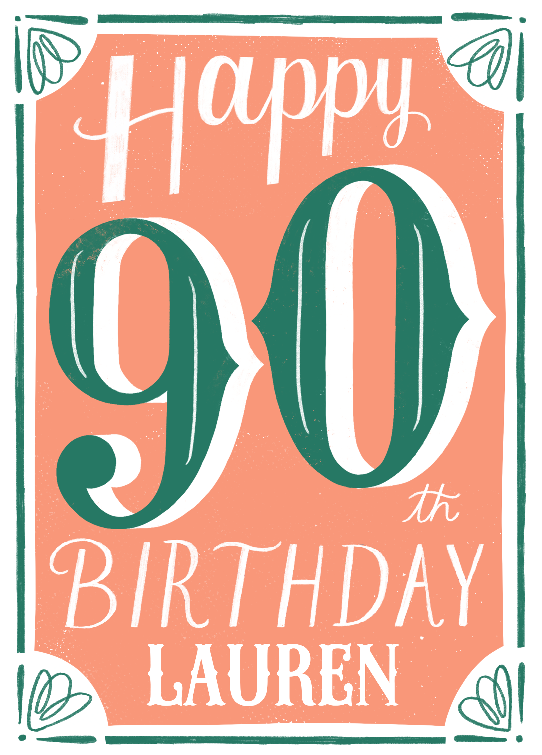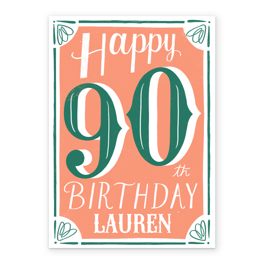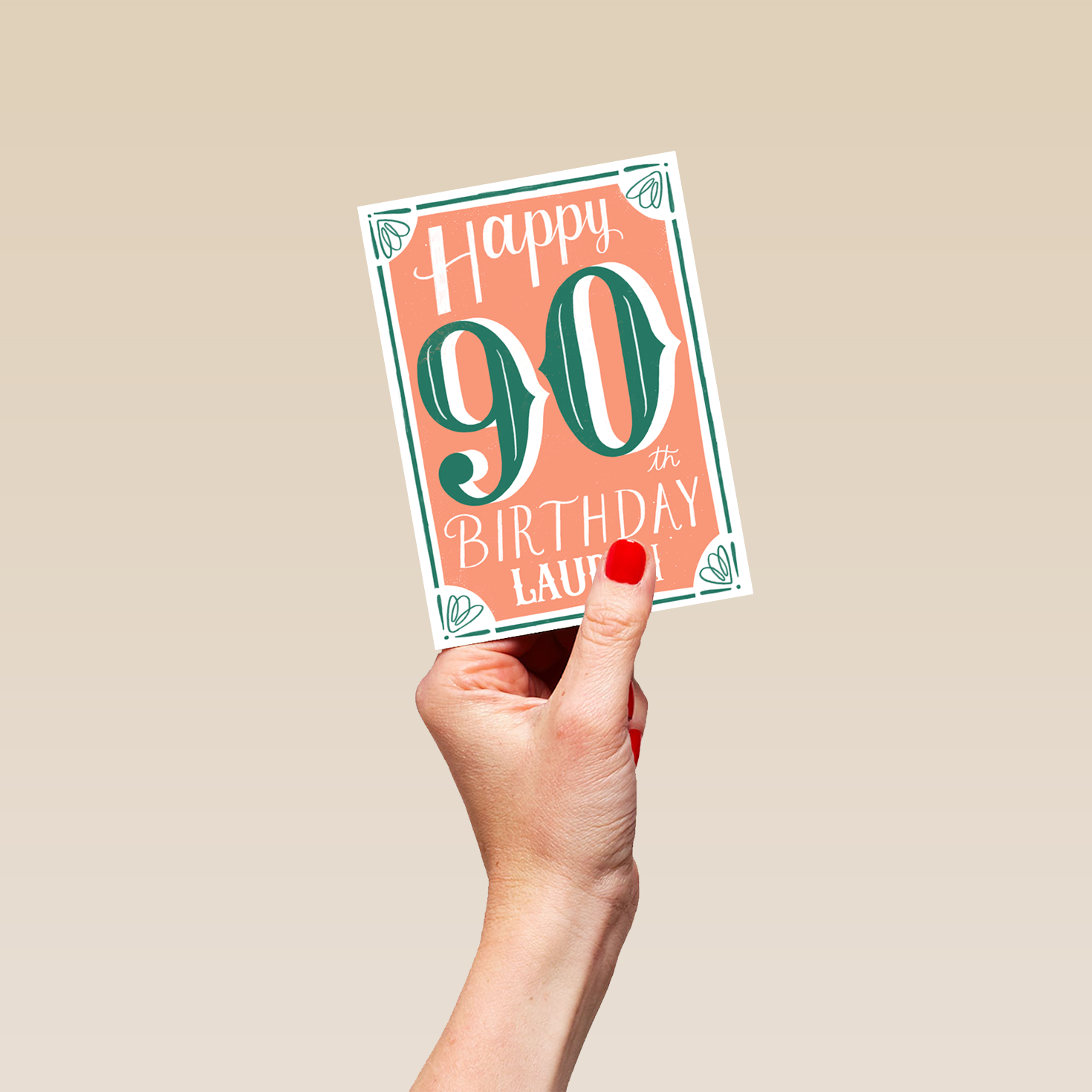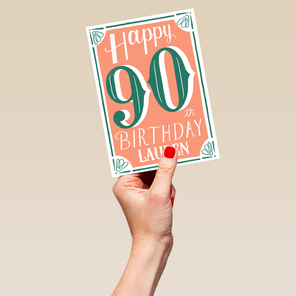 Printed on premium-quality board, this card features classic green and white text on a pink background with white frame and illustrated green floral decoration, with the message 'Happy 90th Birthday', space to personalise a name, and comes complete with a co-ordinating white envelope.