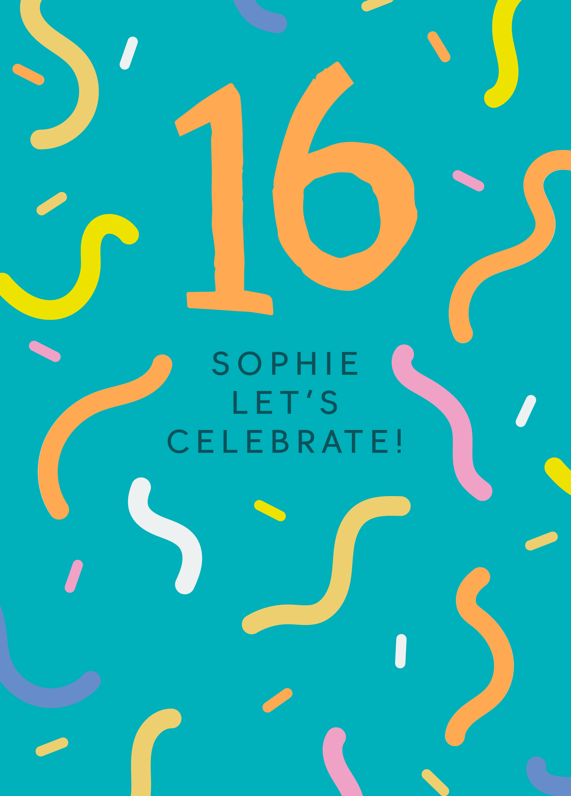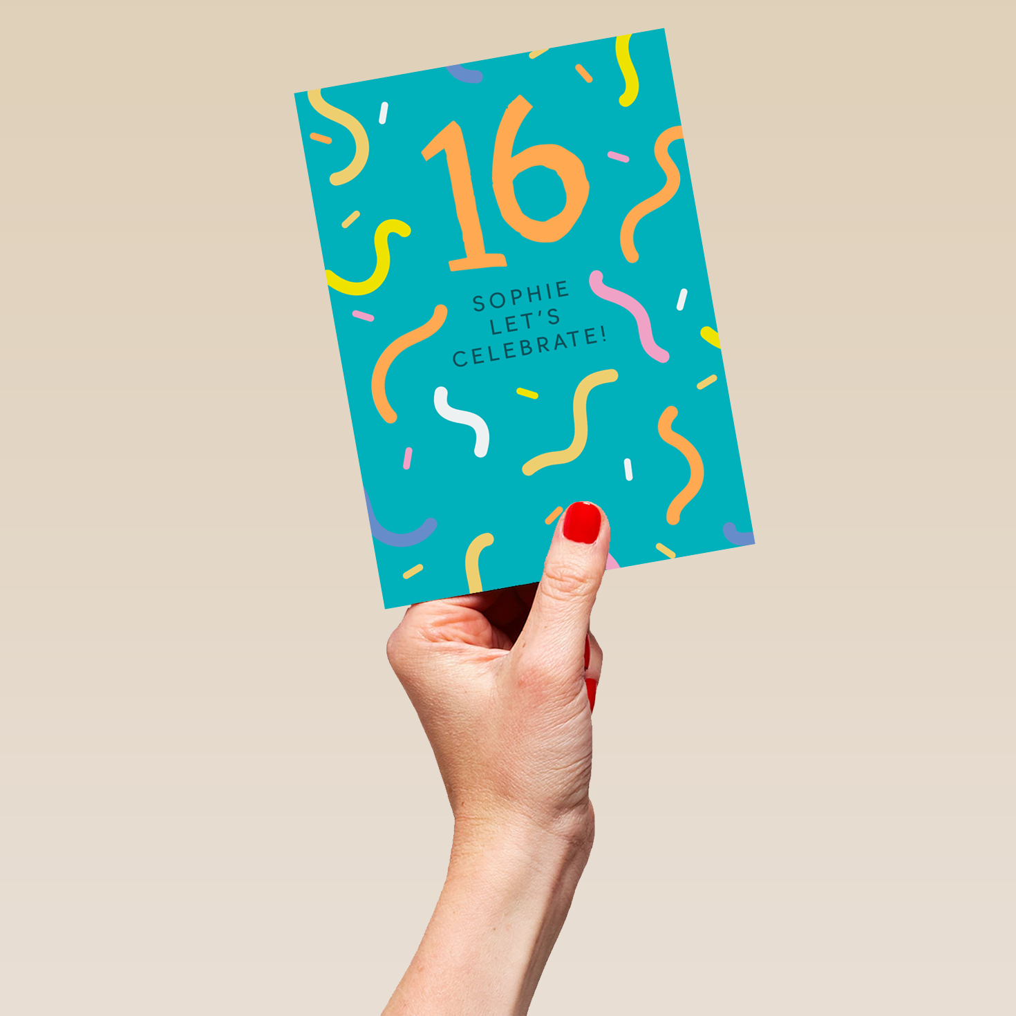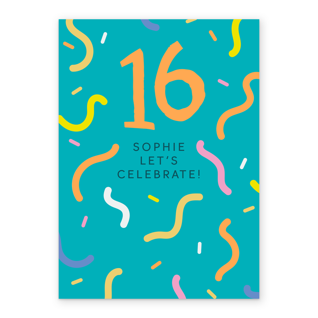 Printed on premium-quality board, this card features colourful contemporary confetti shapes, on a green background, with the message '16 Let's Celebrate', space to personalise your message, and comes complete with a co-ordinating white envelope.