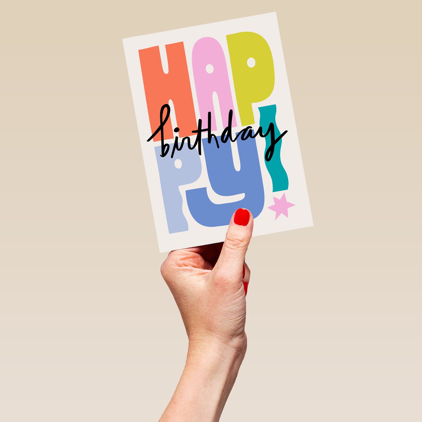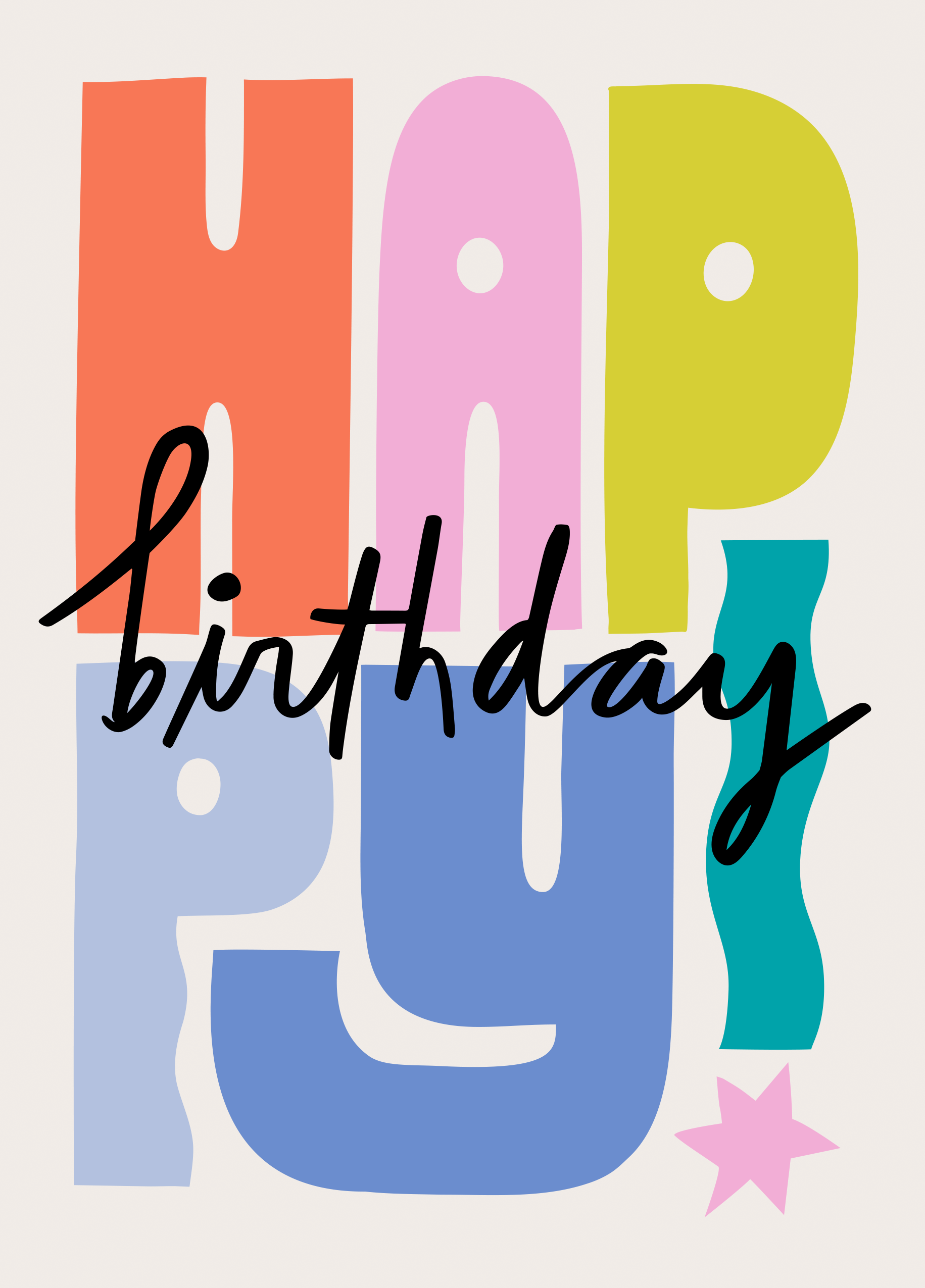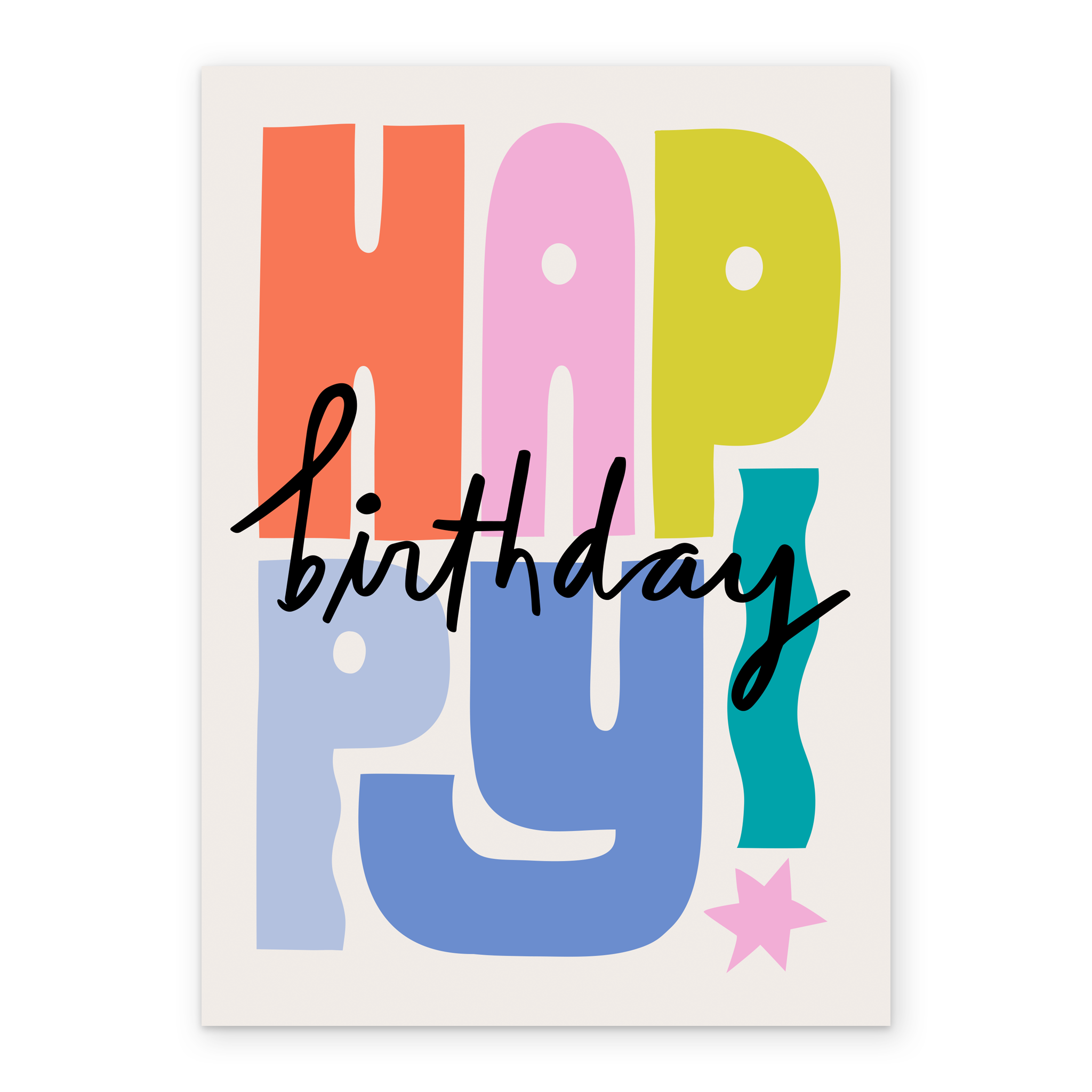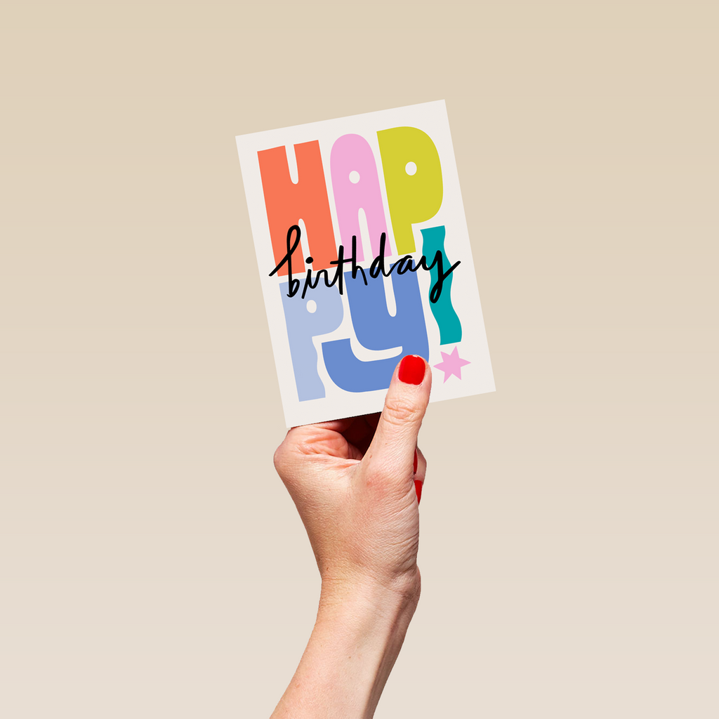 Printed on premium-quality board, this card features colourful typography, with the message 'Happy Birthday', and comes complete with a co-ordinating white envelope.