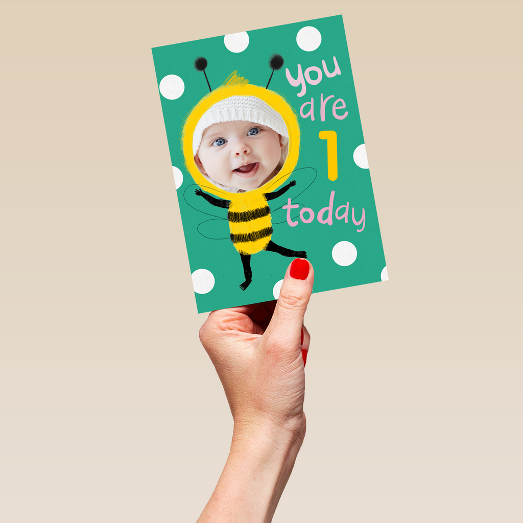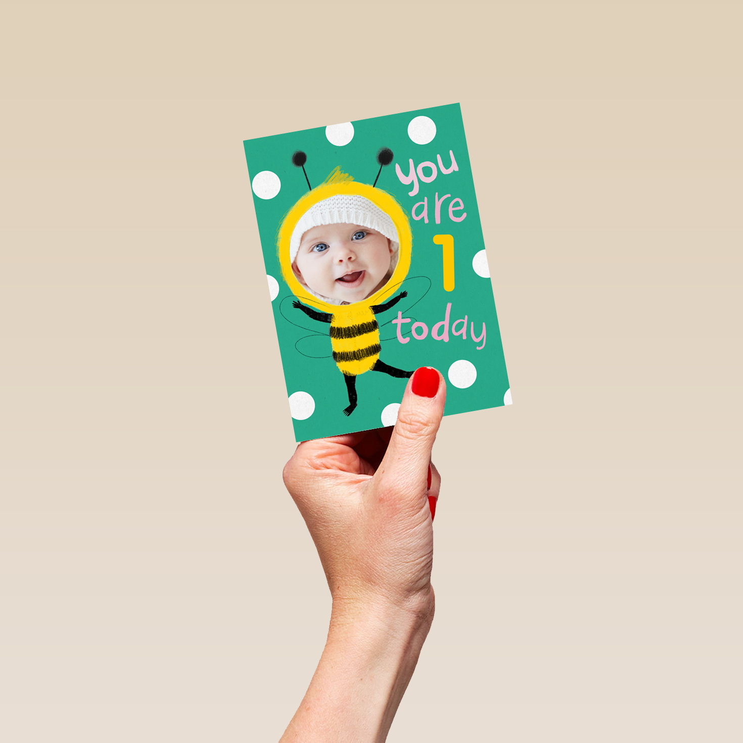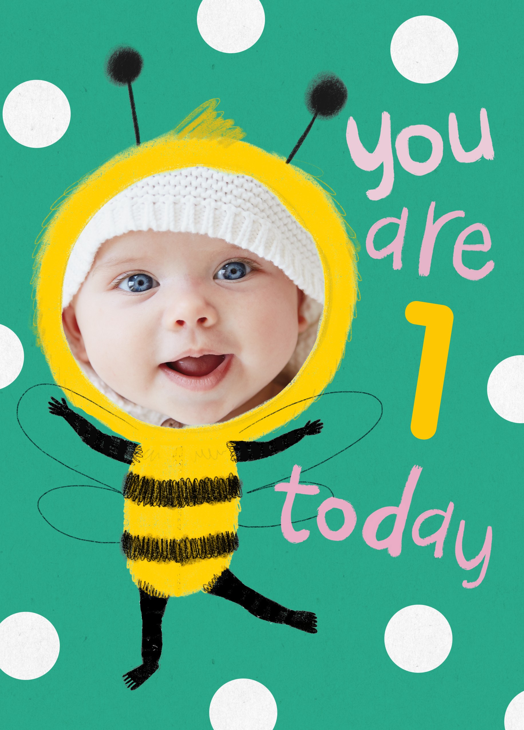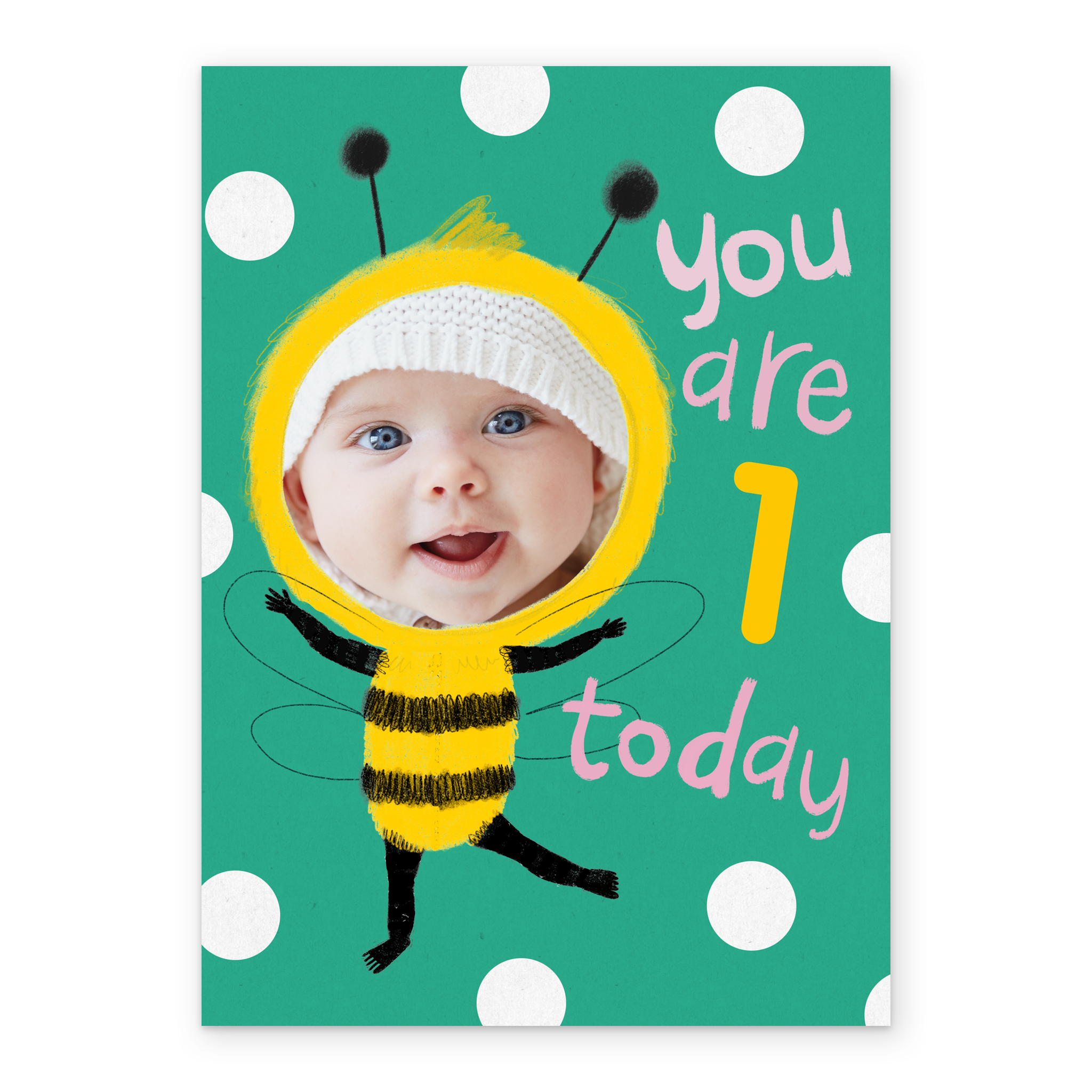 Printed on premium-quality board, this card features a cute illustrated bee and contemporary pink text on a green and white-polka-dot background, with the message 'You Are 1 Today', space to upload a photo and personalise the age, and comes complete with a co-ordinating white envelope.