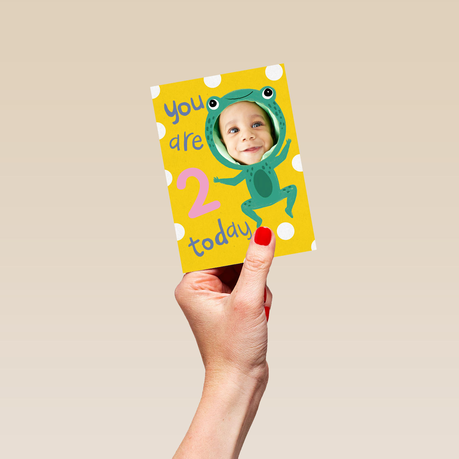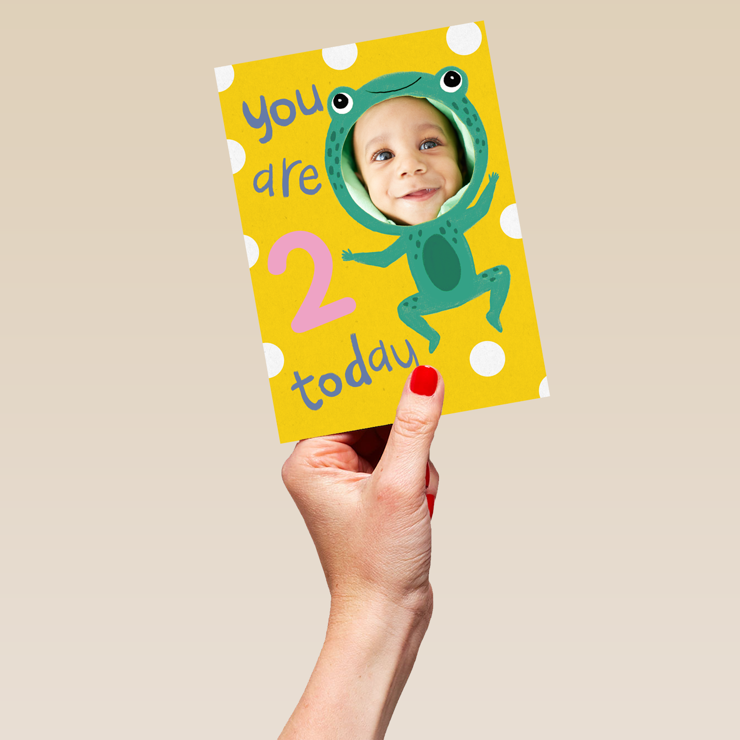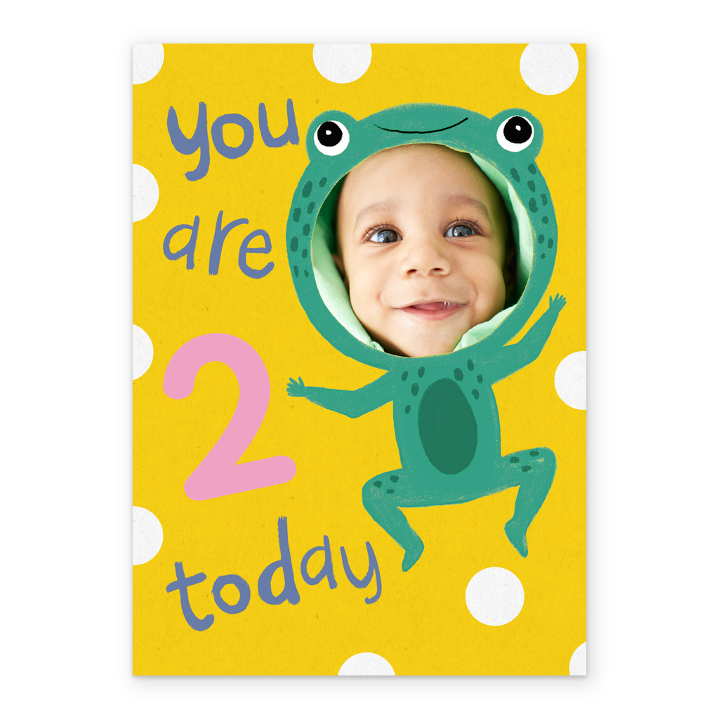 Printed on premium-quality board, this card features a cute illustrated frog and contemporary purple text on a yellow and white-polka-dot background, with the message 'You Are 2 Today', space to upload a photo and personalise the age, and comes complete with a co-ordinating white envelope.
