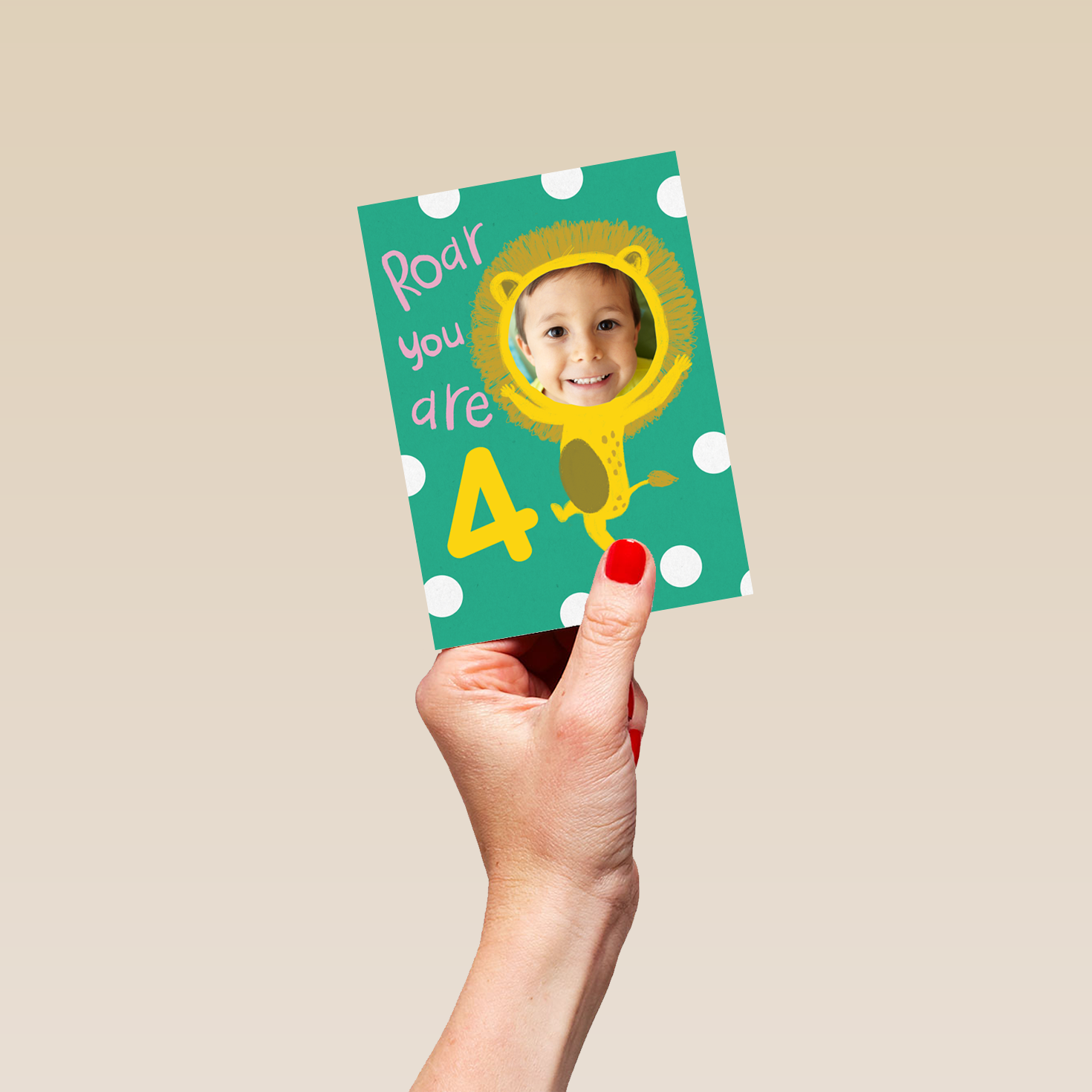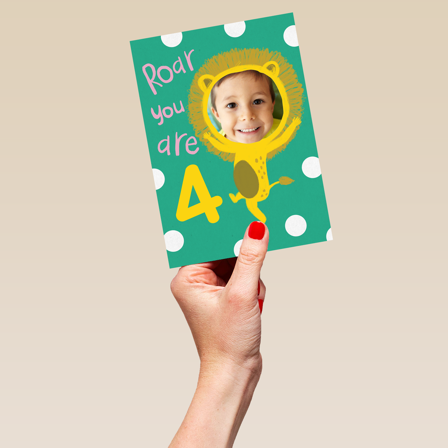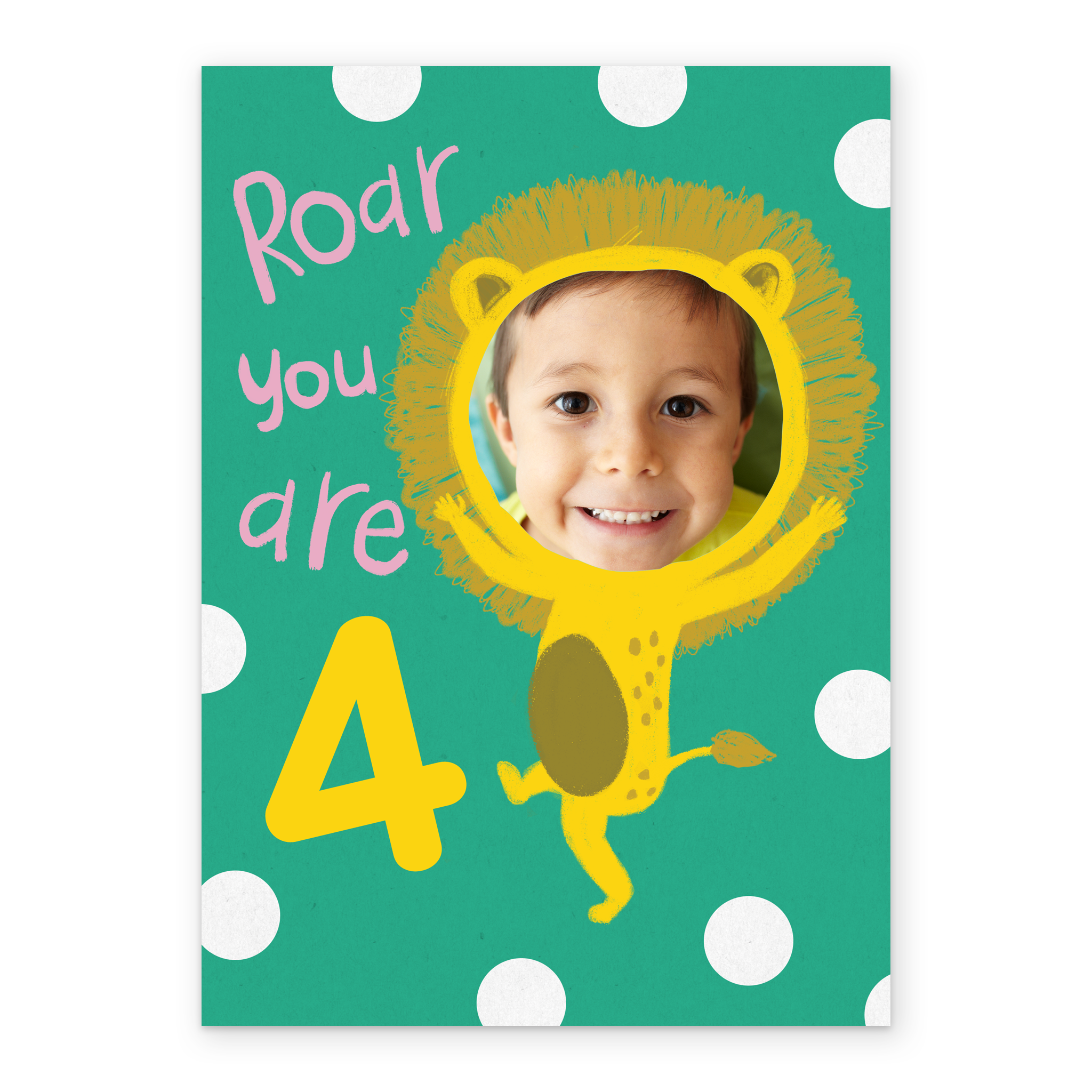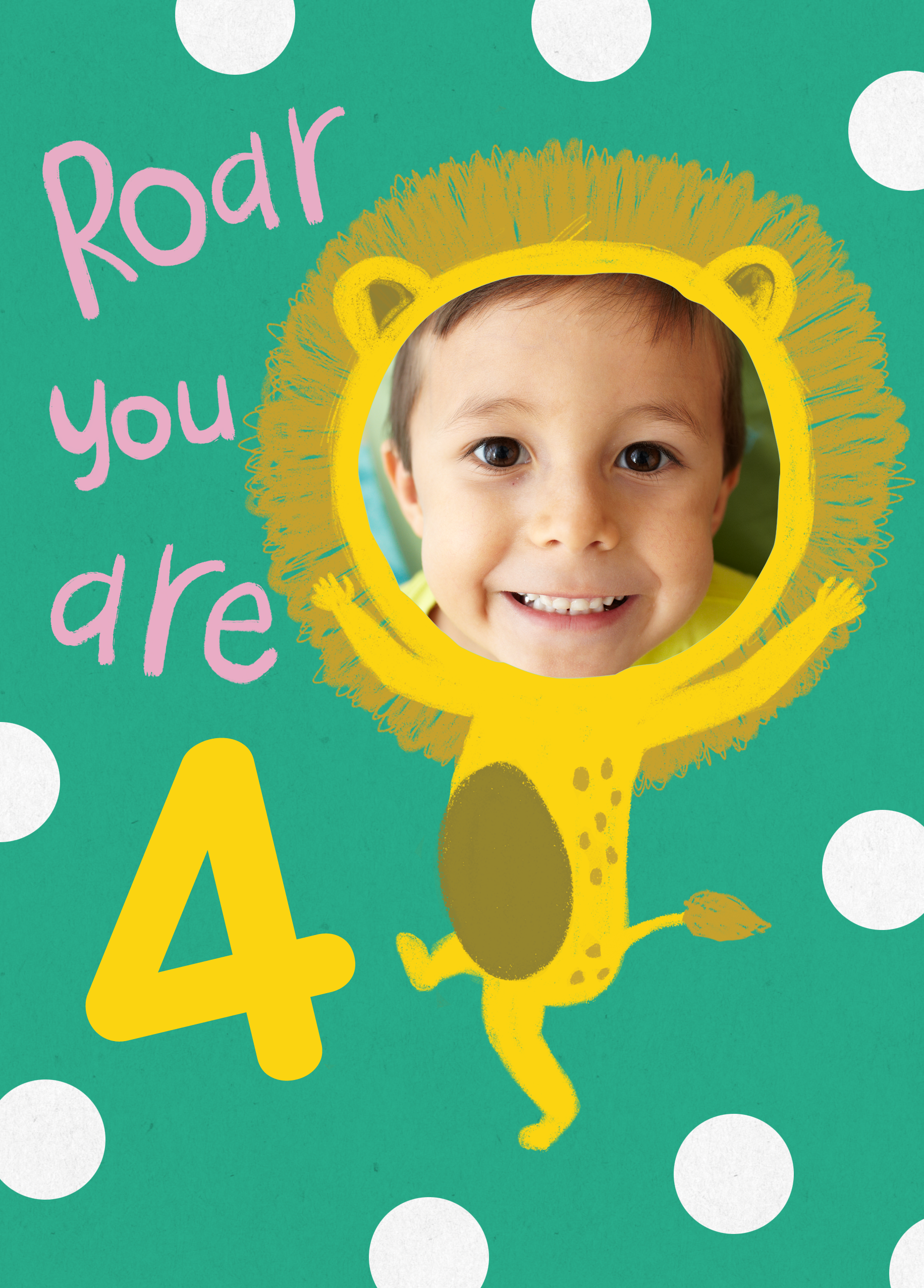 Printed on premium-quality board, this card features a cute illustrated lion and contemporary pink text on a green and white-polka-dot background, with the message 'Roar You Are 4', space to upload a photo and personalise the age, and comes complete with a co-ordinating white envelope.