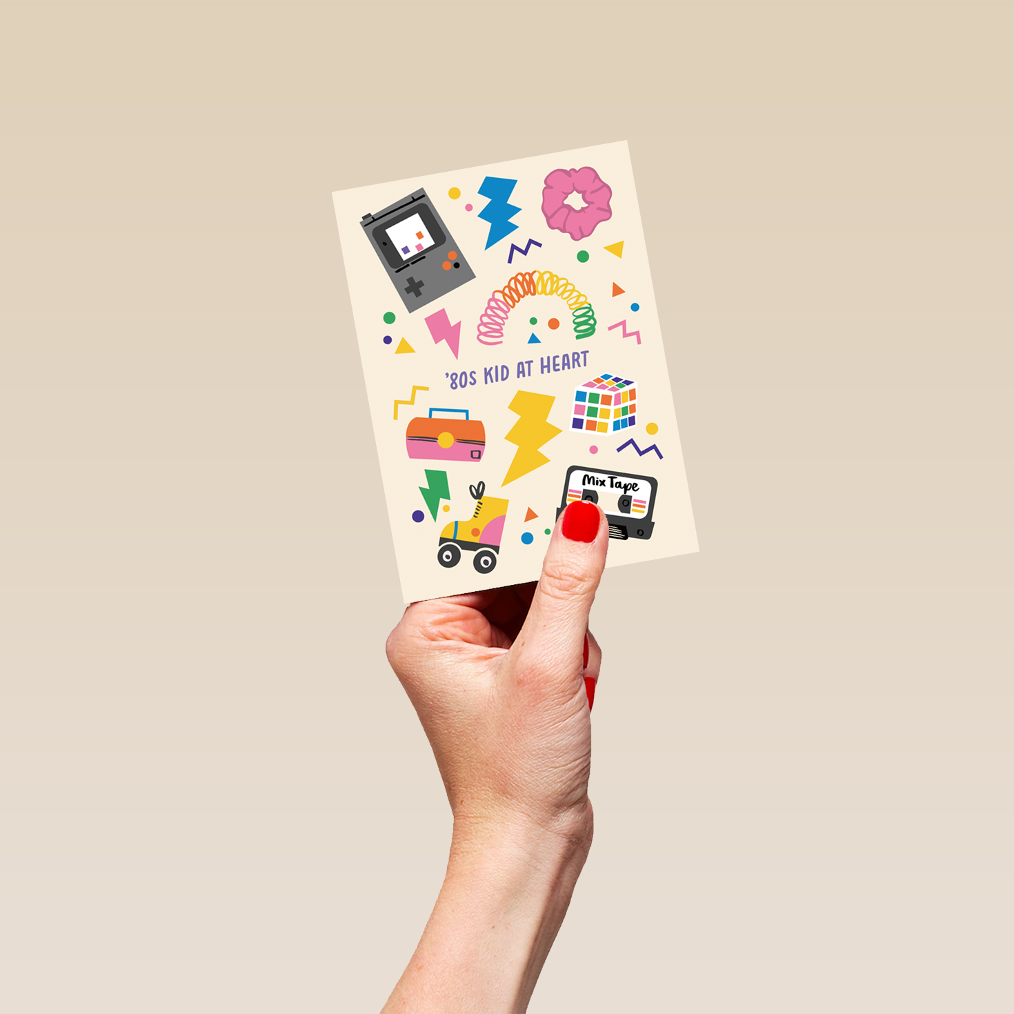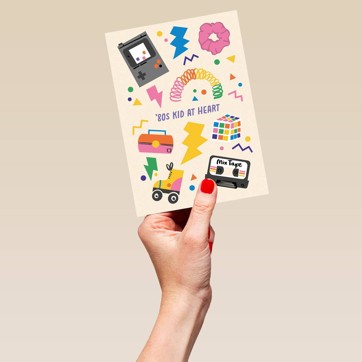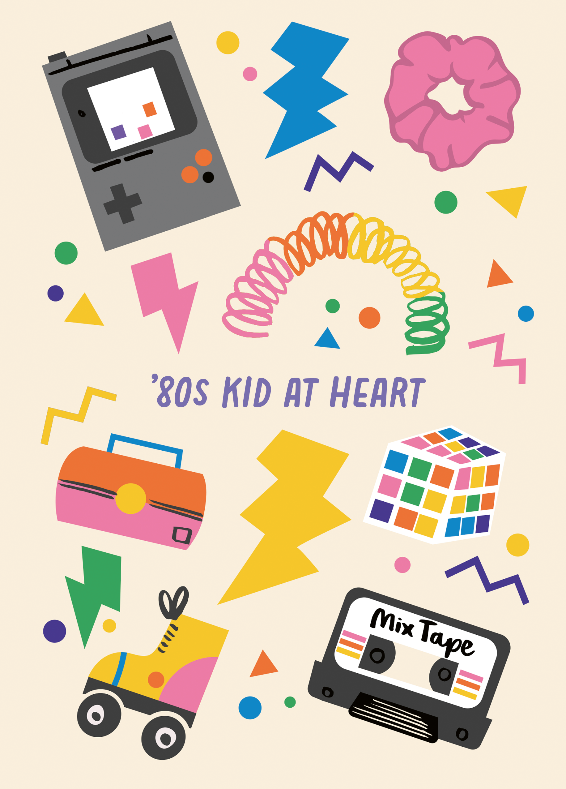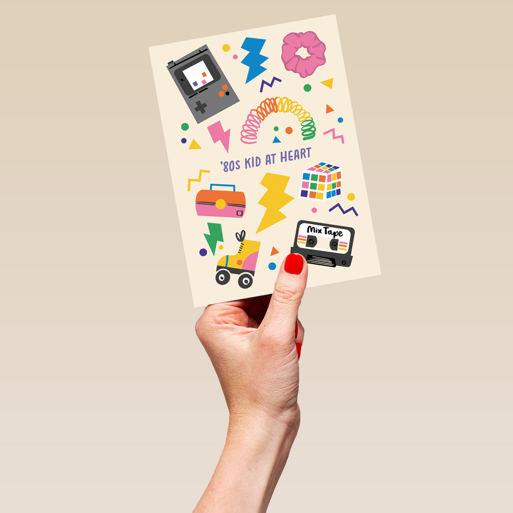 Printed on premium-quality board, this card features 80s-styled illustrated icons, including a handheld video game console, a rainbow slinky, a mixtape cassette, Roller Skates, a Rubik's cube and a colourful scrunchie, with the message '80's kid at heart', space to personalise your message, and comes complete with a co-ordinating white envelope.
