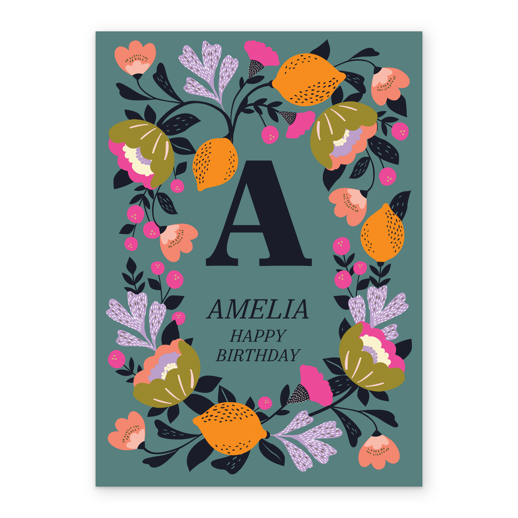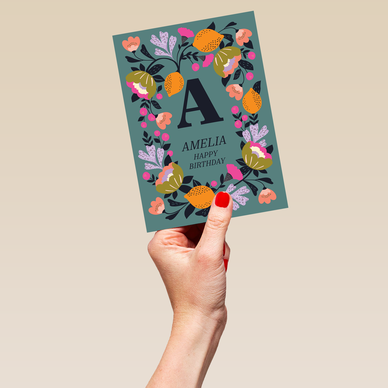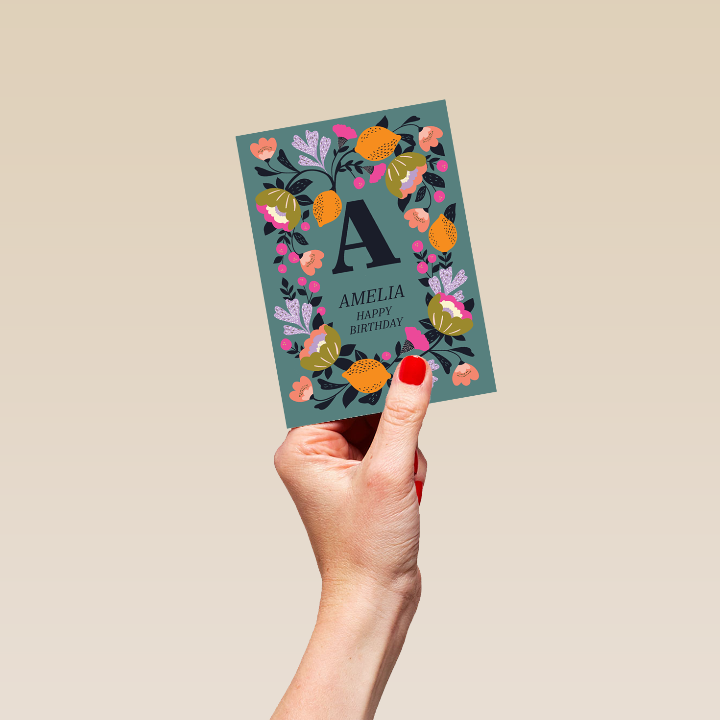 Printed on premium-quality board, this card features a modern botanical illustration, with the message 'Happy Birthday', space to personalise a name, and comes complete with a co-ordinating white envelope.