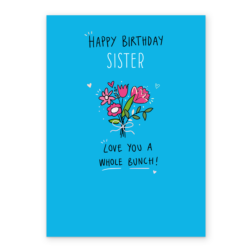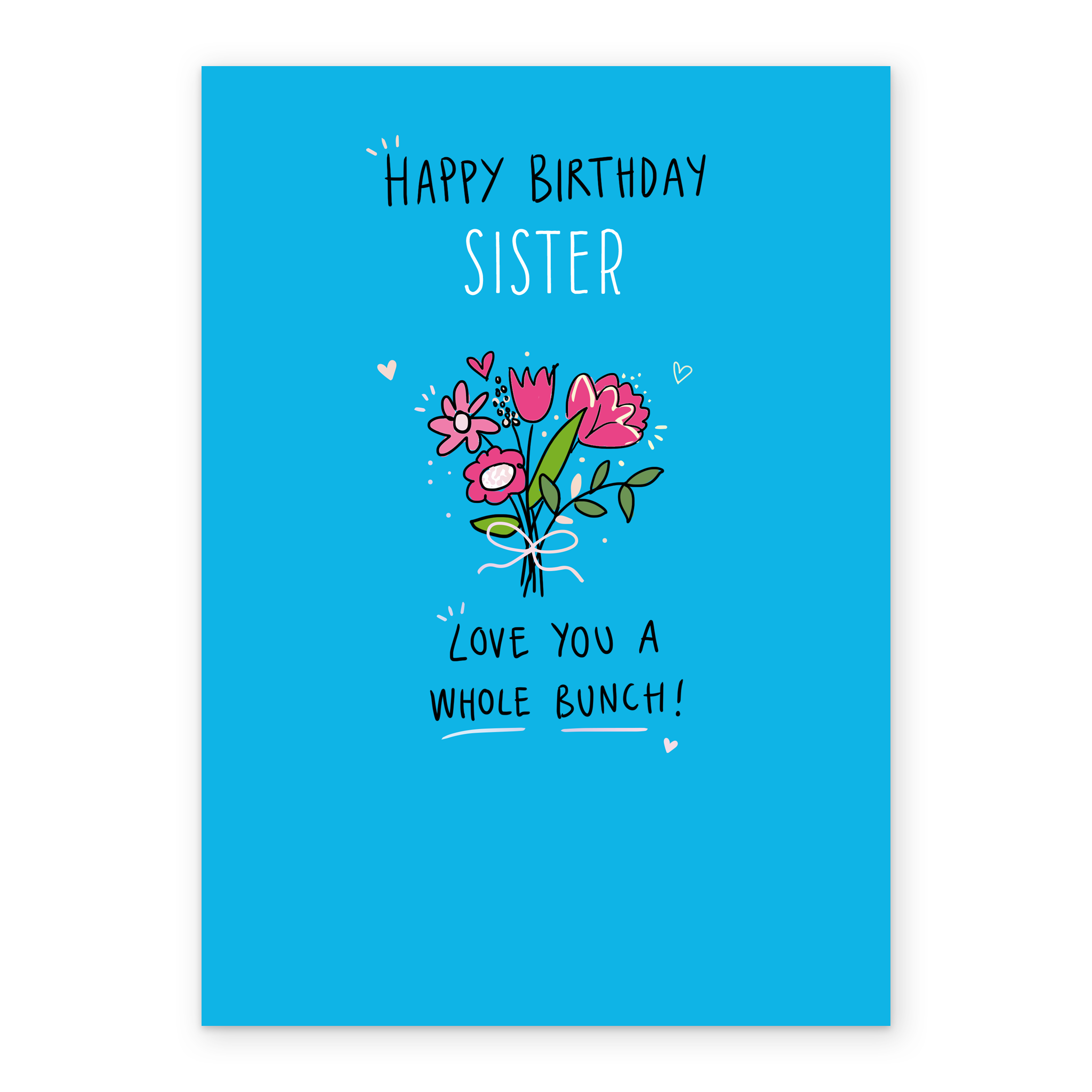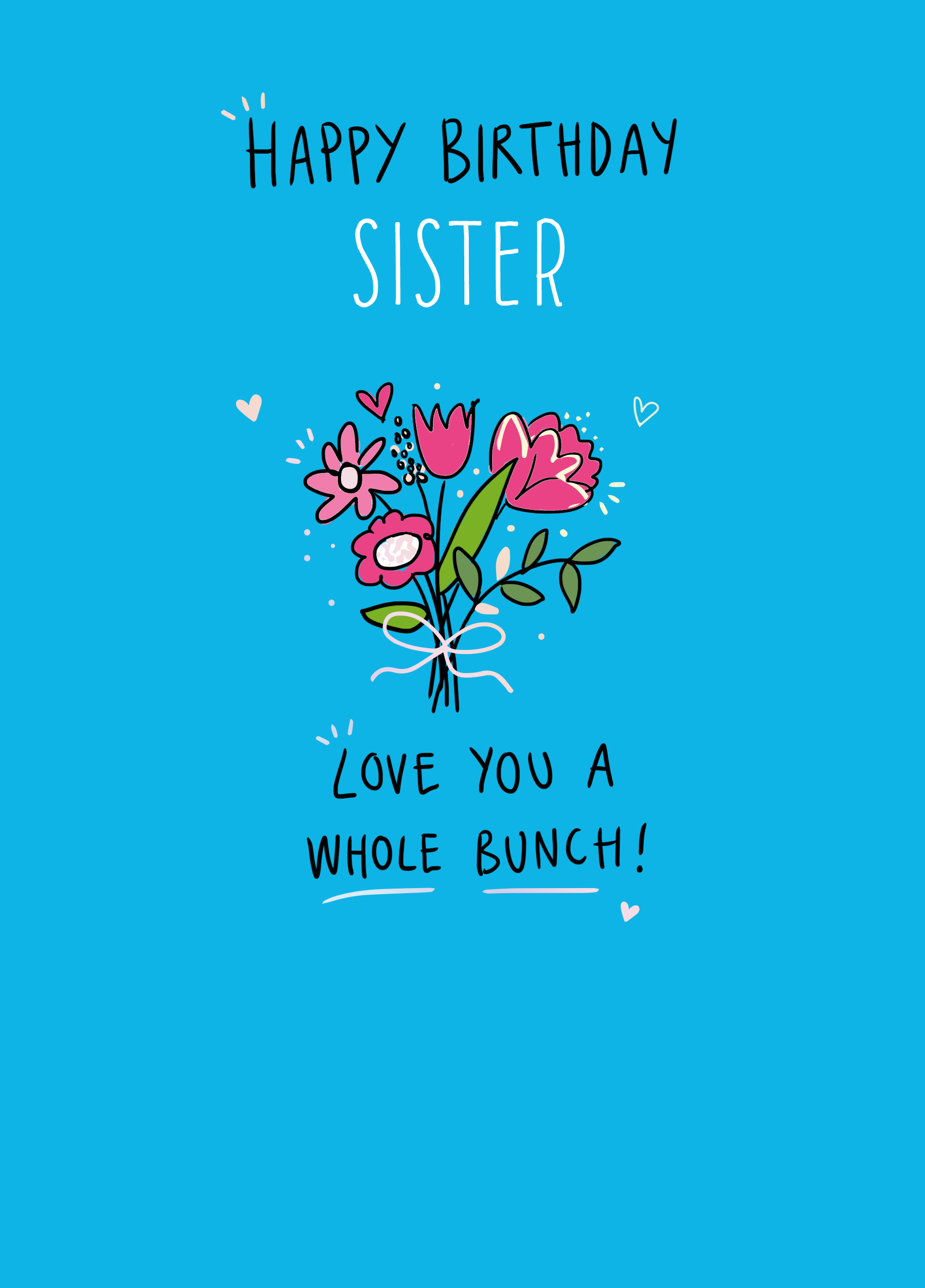 Printed on premium-quality board, this card features a blue background with flowers, with the message 'Happy Birthday [NAME] Love you a whole bunch!', space to personalise a name, and comes complete with a co-ordinating white envelope.