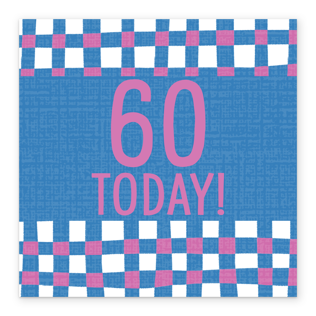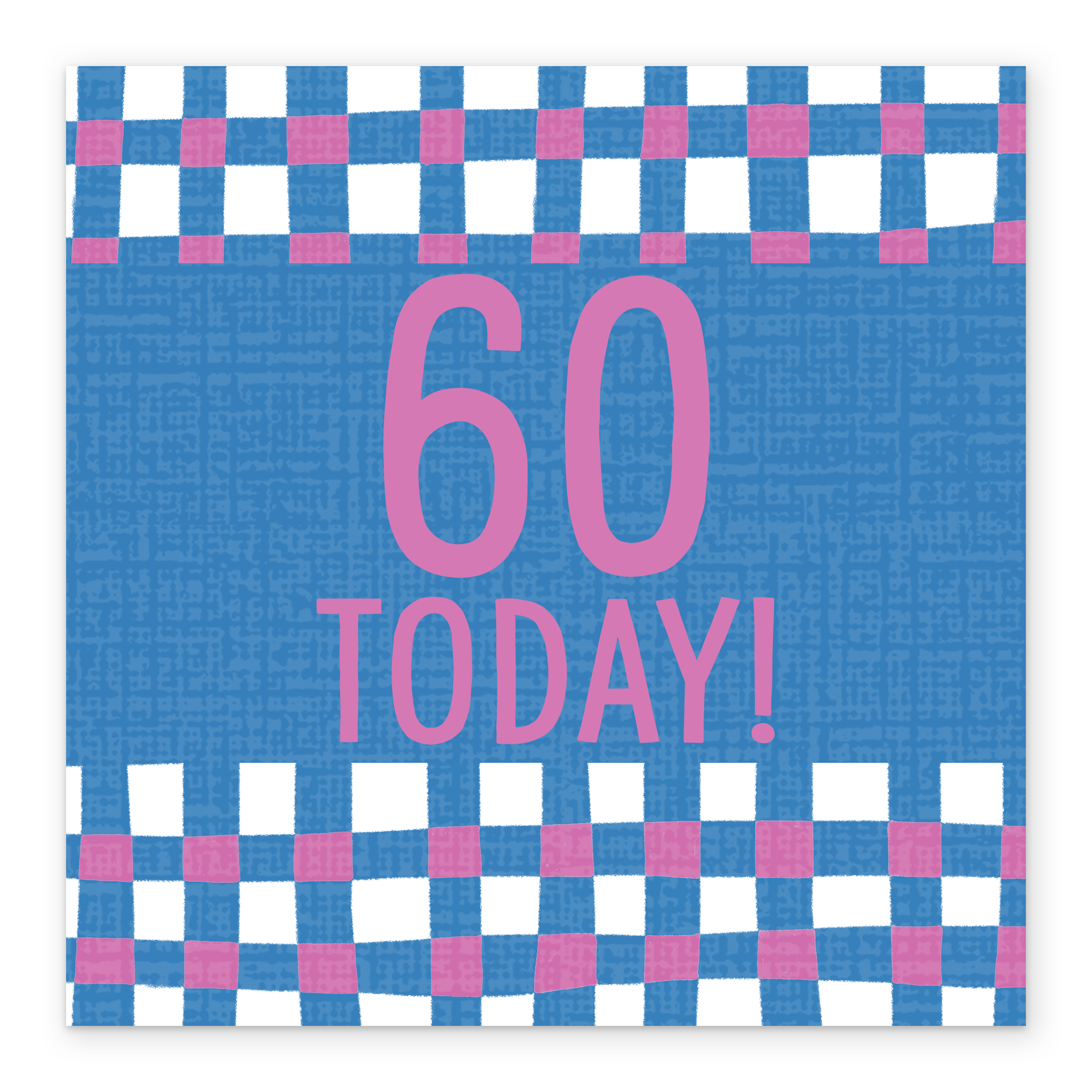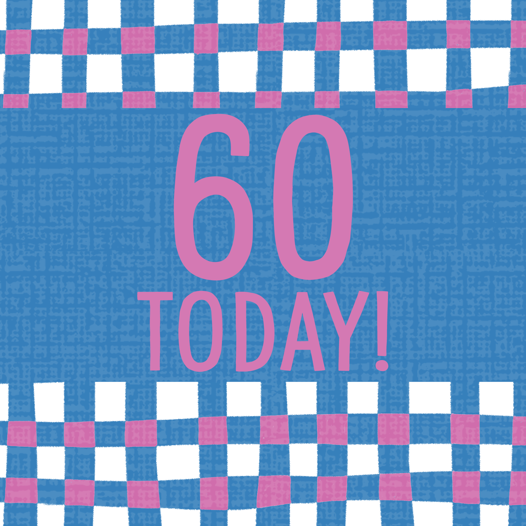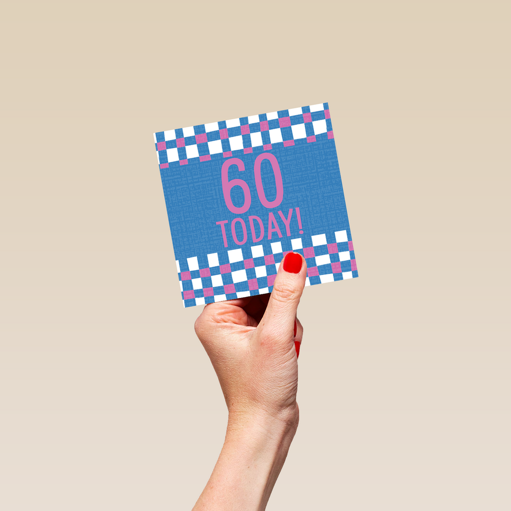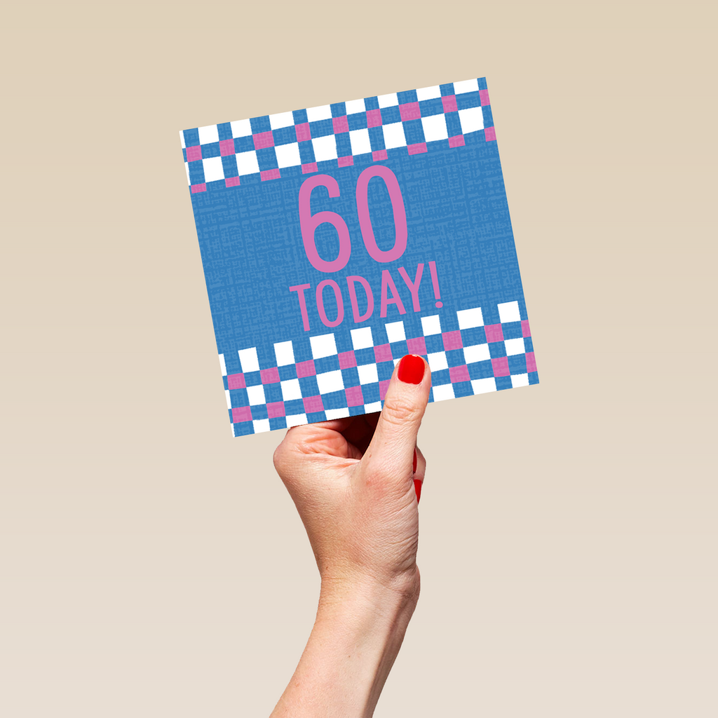 Printed on premium-quality board, this card features blue and pink checks with an orange block, with the message '60 Today!', space to personalise the age, and comes complete with a co-ordinating white envelope.