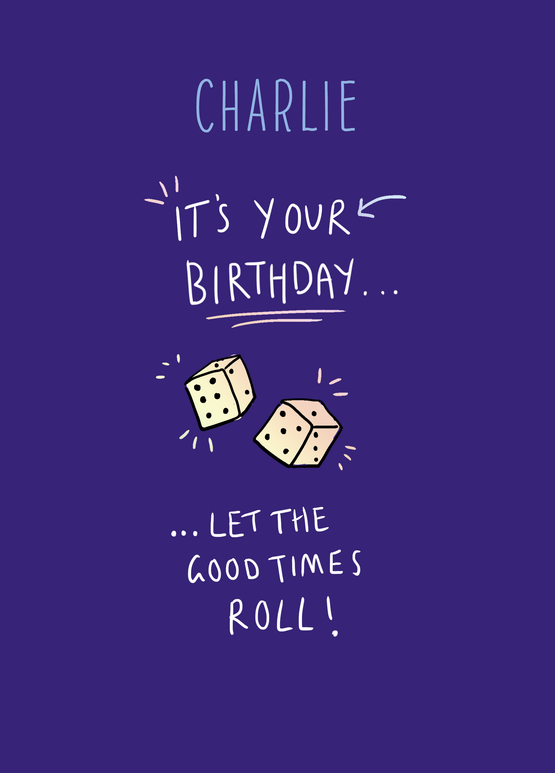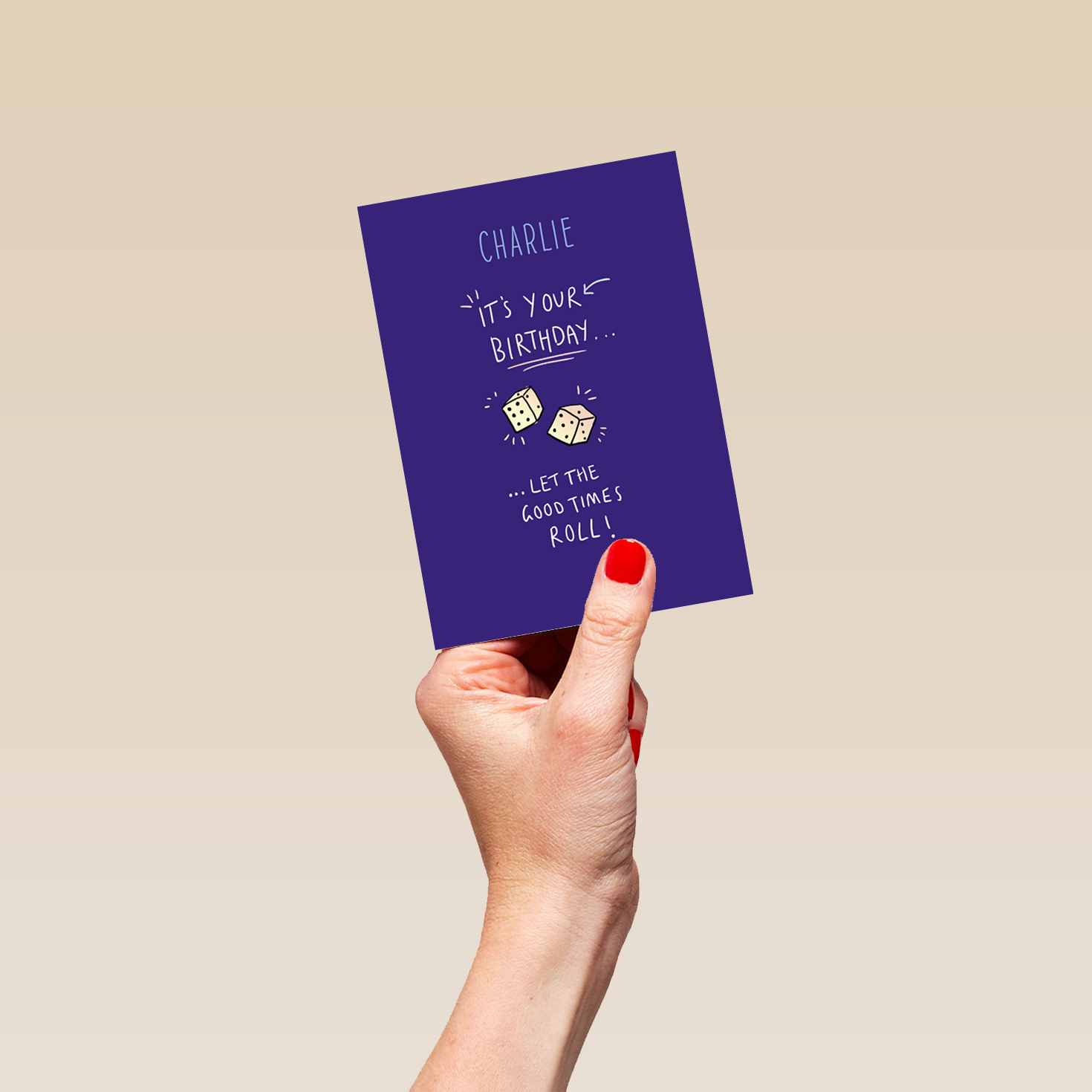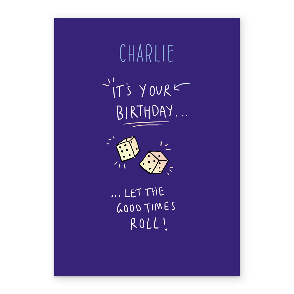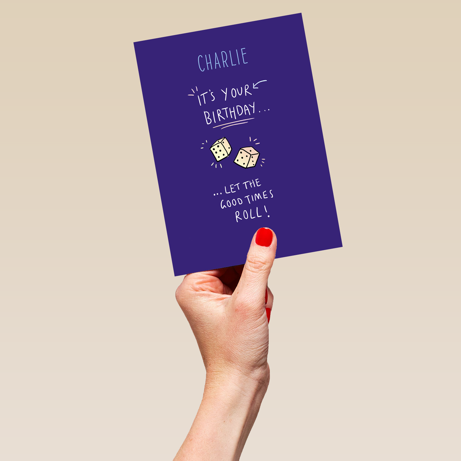 Printed on premium-quality board, this card features a purple background with dice, with the message '[NAME] It's Your Birthday... ...Let The Good Times Roll!', space to personalise a name, and comes complete with a co-ordinating white envelope.