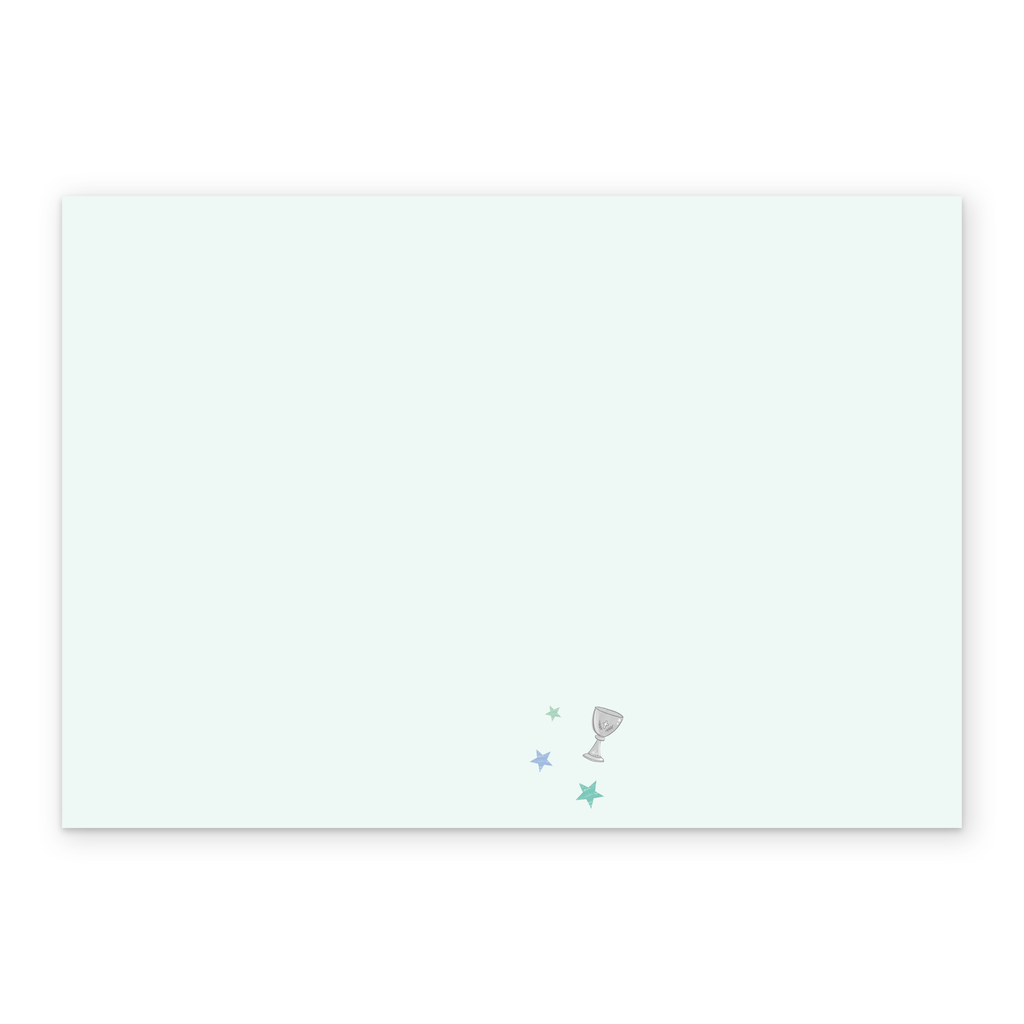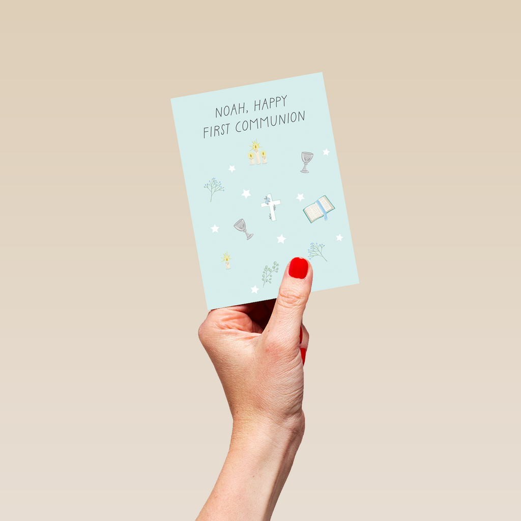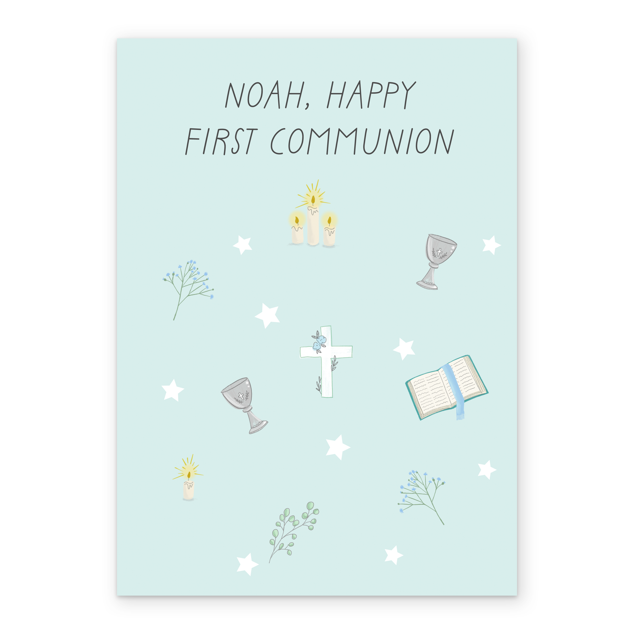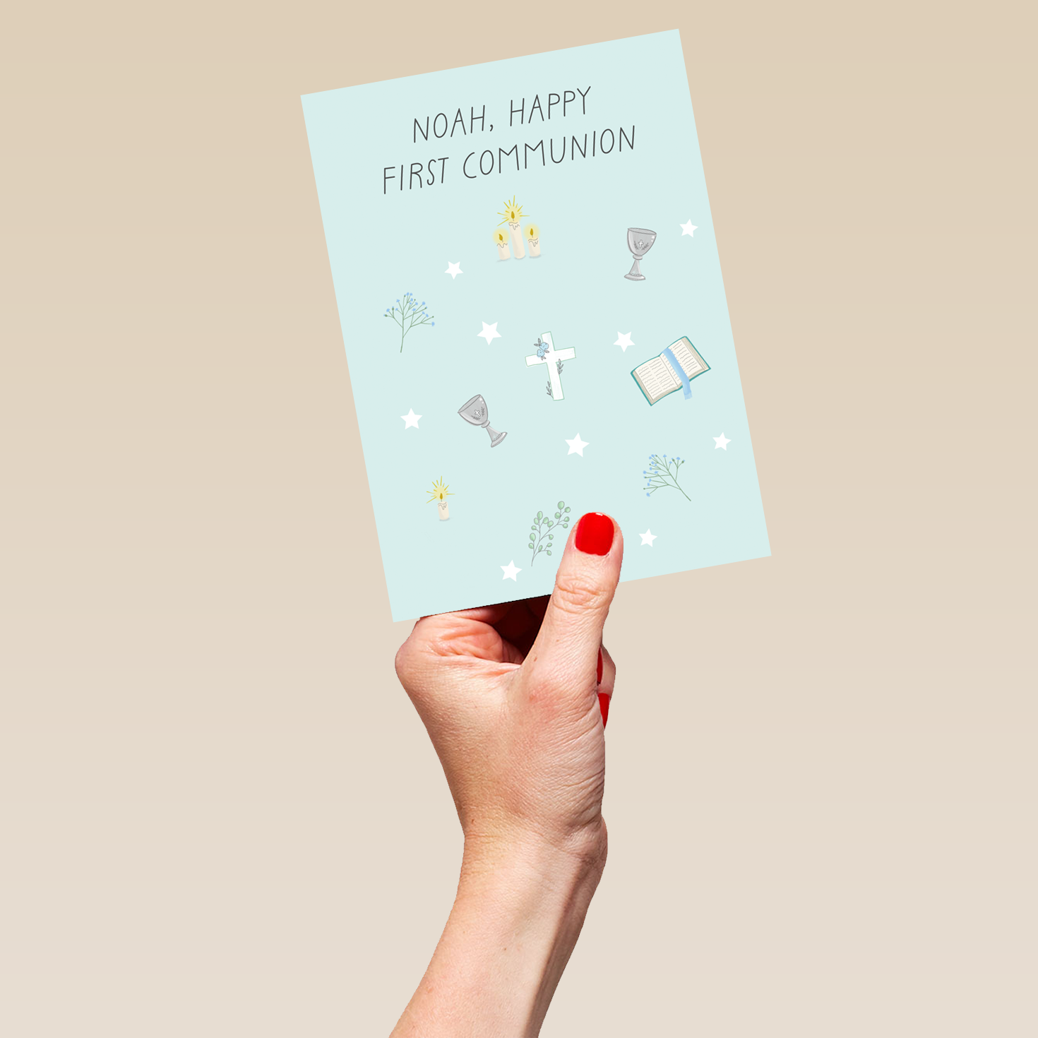 Printed on premium-quality board, this card features icons inspired by a Communion, including a Christian cross, chalice, candles, a book and florals on a blue background, with the message 'Happy First Communion', space to personalise your message, and comes complete with a co-ordinating white envelope.