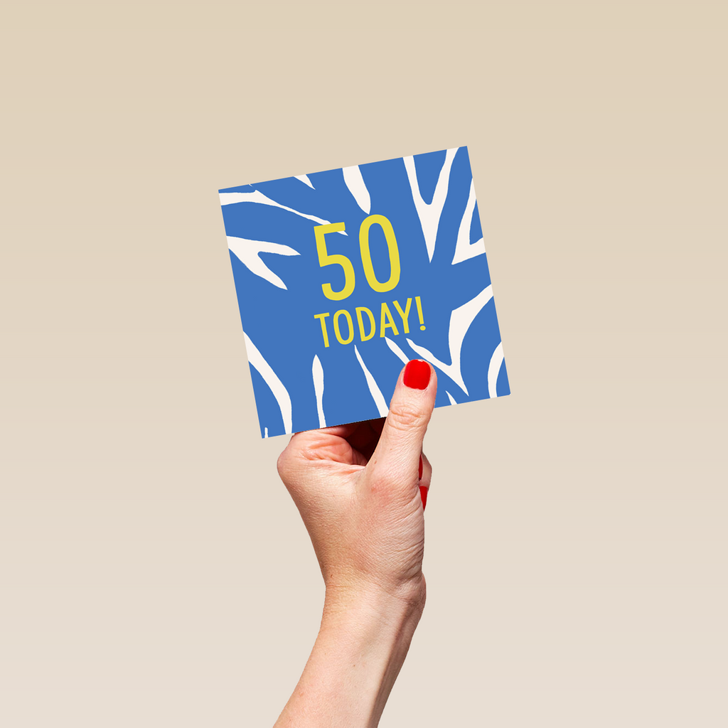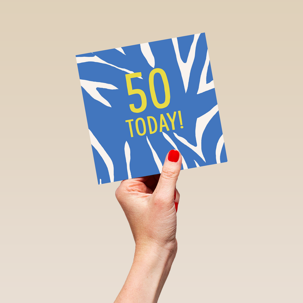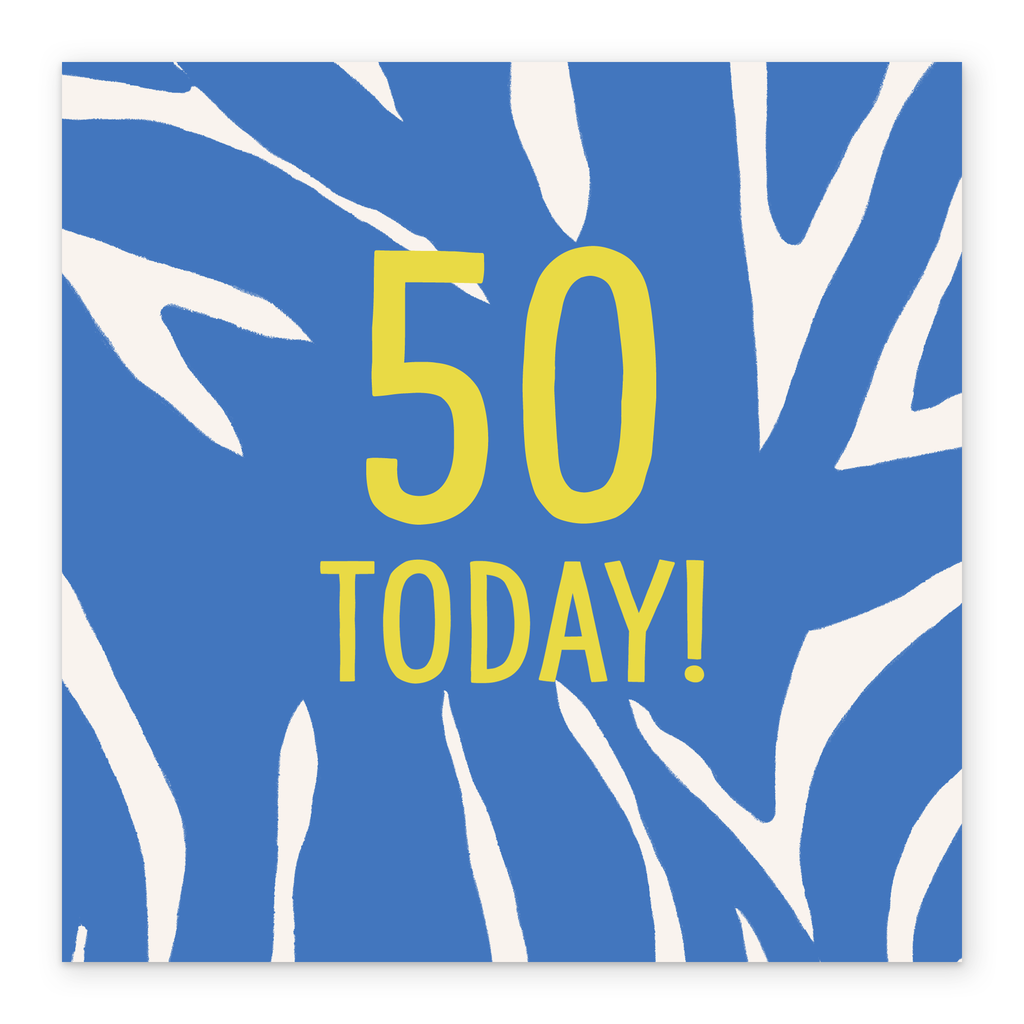Printed on premium-quality board, this card features a blue background with irregular stripes, with the message '50 Today!', space to personalise the age, and comes complete with a co-ordinating white envelope.