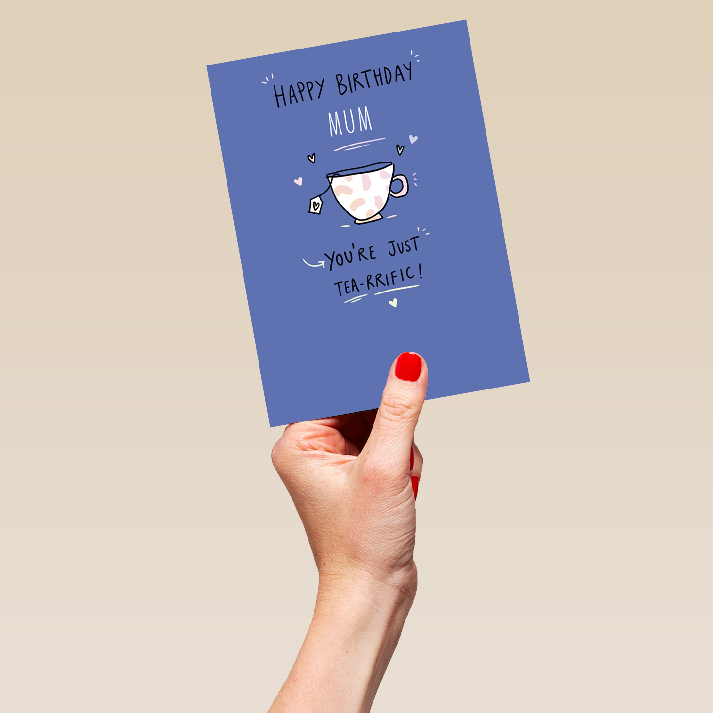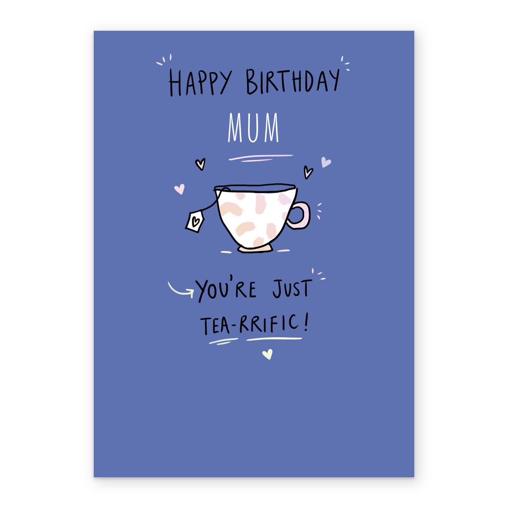 Printed on premium-quality board, this card features a blue background with a cup of tea, with the message 'Happy Birthday [NAME] You're just tea-rrific!|', space to personalise a name, and comes complete with a co-ordinating white envelope.